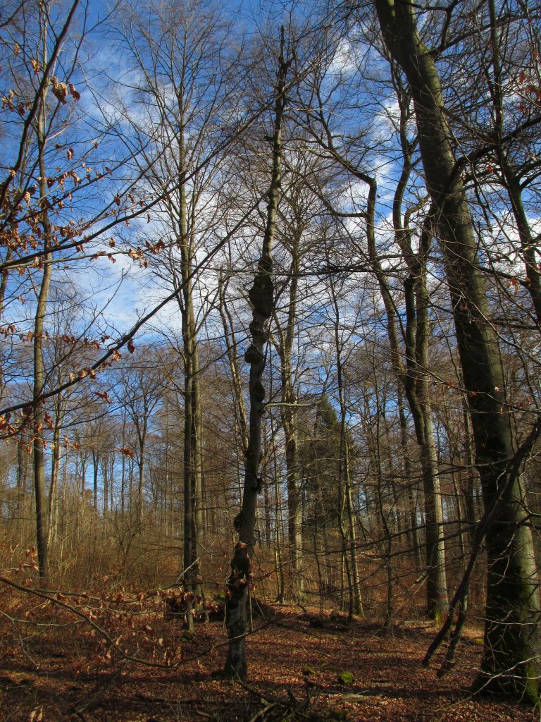 … so wie bei dieser Rotbuche, wo noch Reste der Schlingpflanze erkennbar sind.