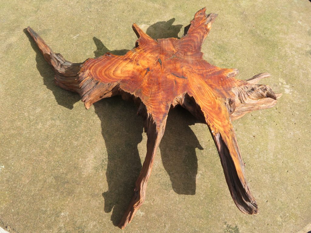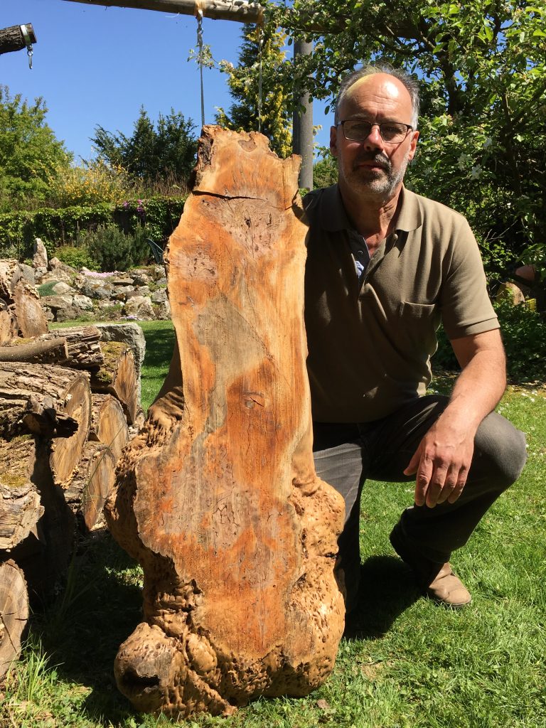 Ausgangsmaterial war der abgebildete Wurzelstubben, den jemand an einem Waldweg entsorgt hat. Eibenholz ist schwerer, härter und witterungsbeständiger als andere Nadelholzarten wie zum Beispiel Fichte oder Kiefer. Vor allem aber besitzt es eine sehr schöne Maserung.