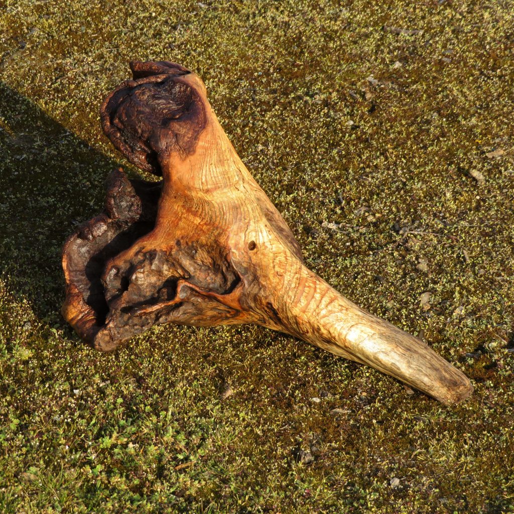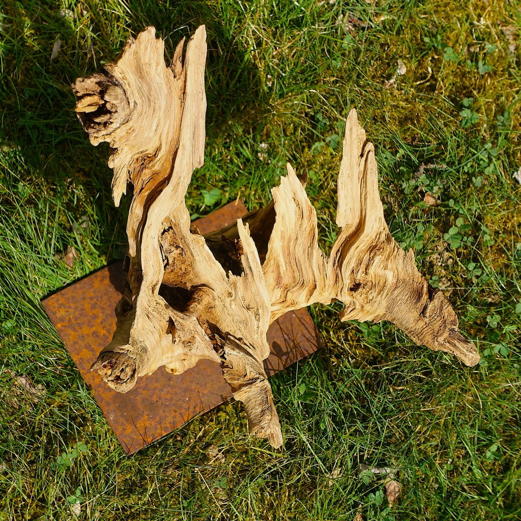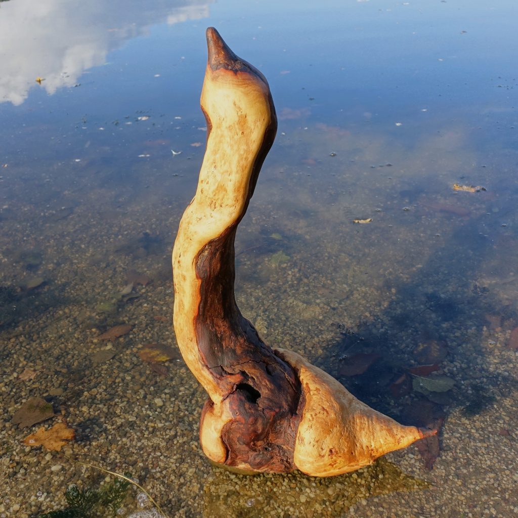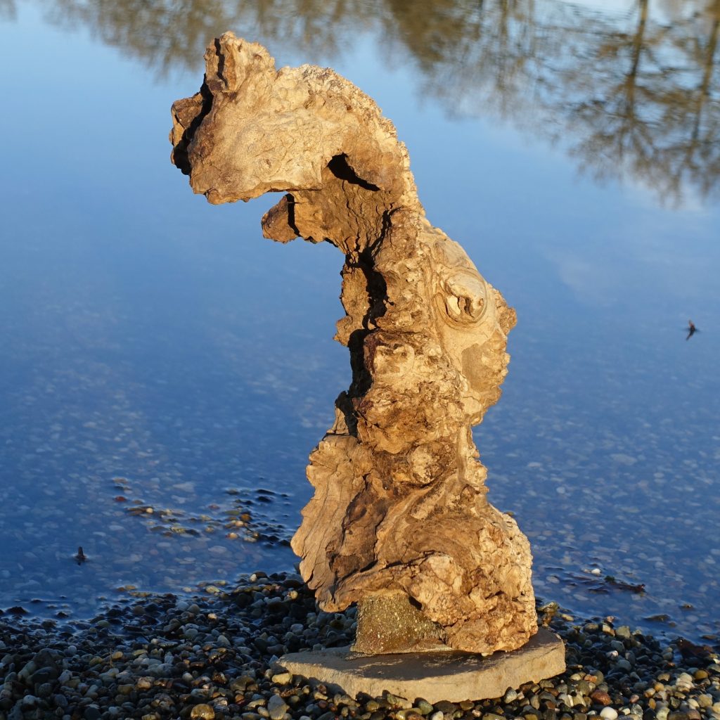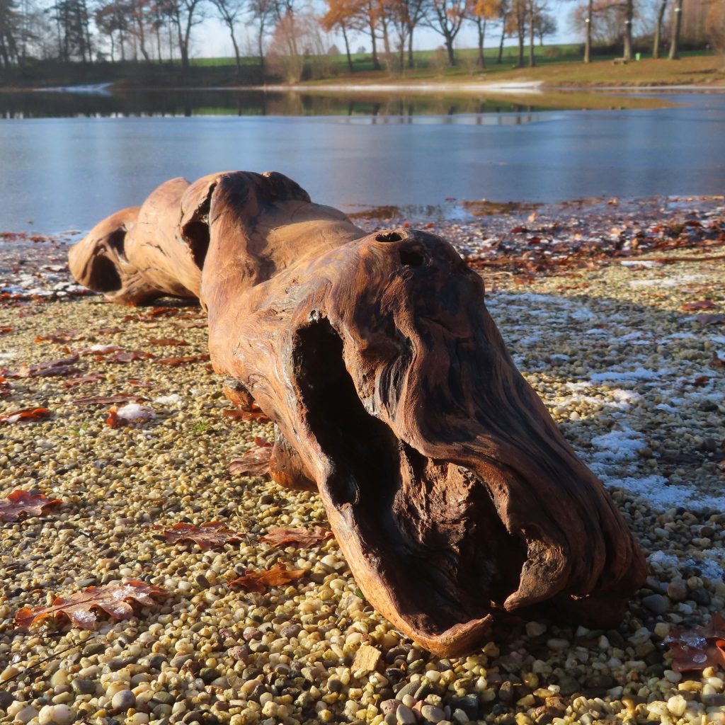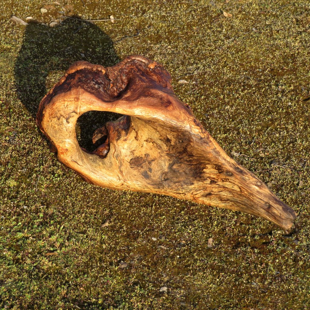 Das Treibholzstück habe ich bei Leutesdorf am Rhein gefunden (siehe zweites Foto) und in seinen Umrissen nicht verändert. Schwer zu sagen, von welcher Baumart das schön marmorierte Holz stammt, da der lange Aufenthalt im Wasser die Eigenschaften des Holzes beeinflusst. Ich vermute am ehesten ein Obstbaumholz.