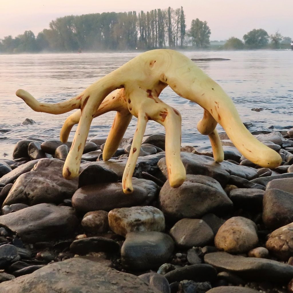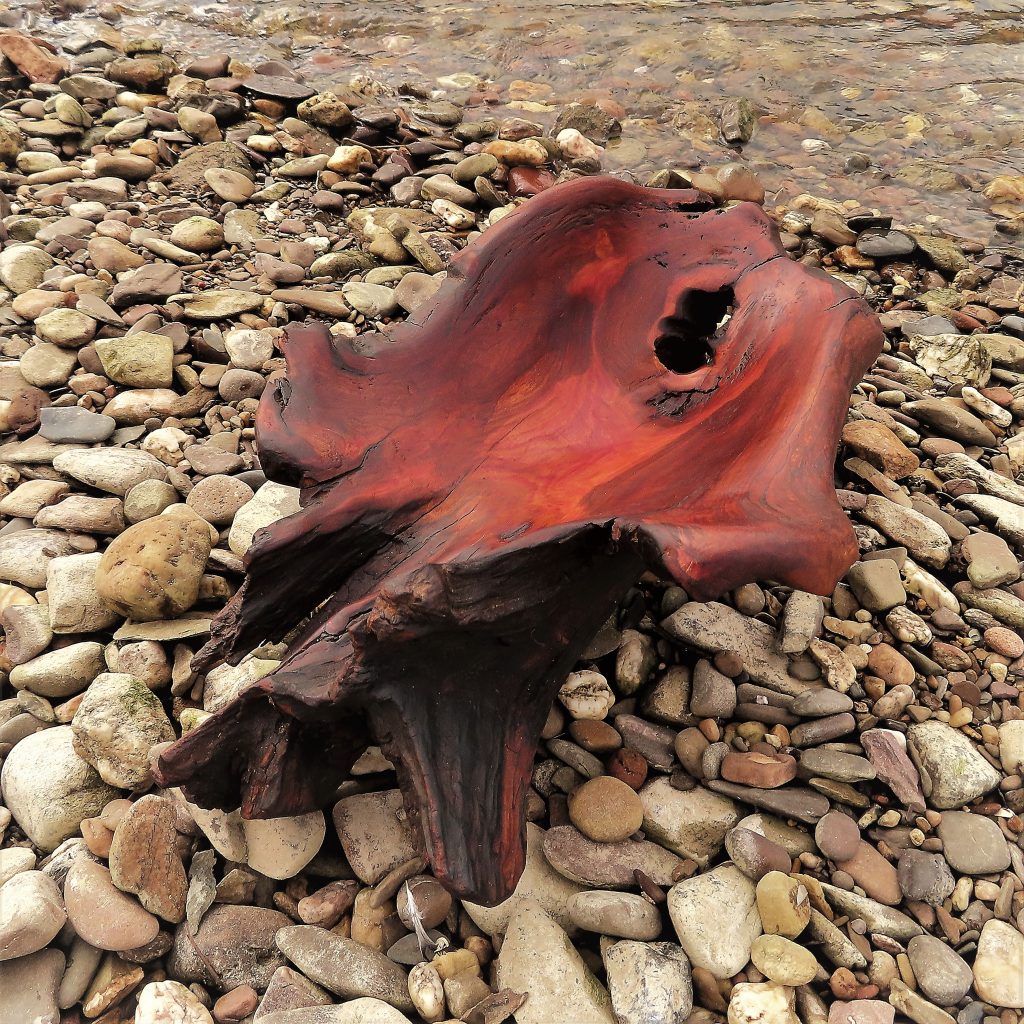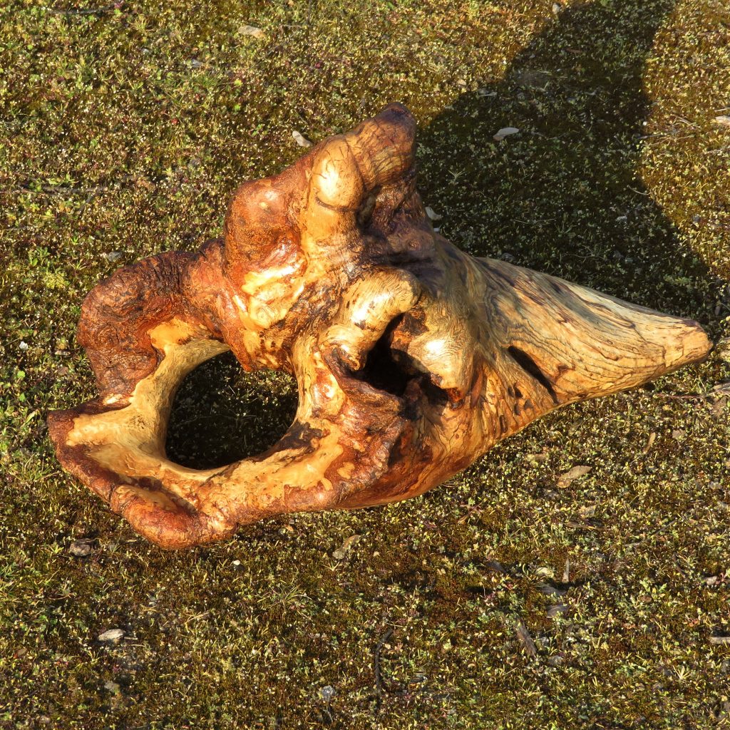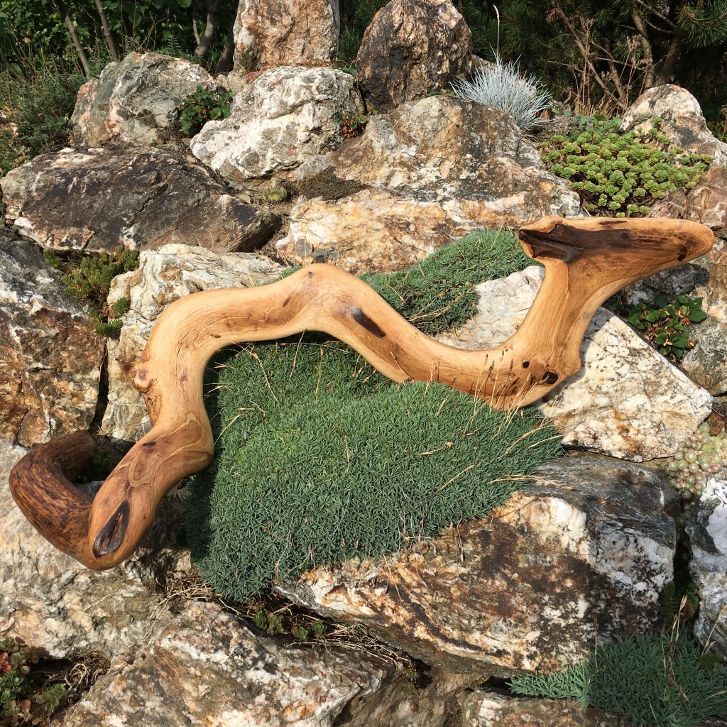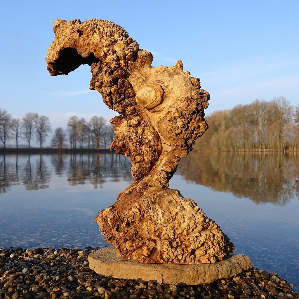 Das Treibholzstück habe ich bei Leutesdorf am Rhein gefunden (siehe zweites Foto) und in seinen Umrissen nicht verändert. Schwer zu sagen, von welcher Baumart das schön marmorierte Holz stammt, da der lange Aufenthalt im Wasser die Eigenschaften des Holzes beeinflusst. Ich vermute am ehesten ein Obstbaumholz.
