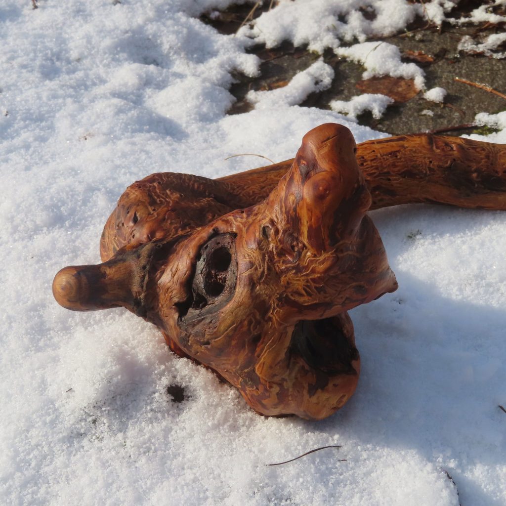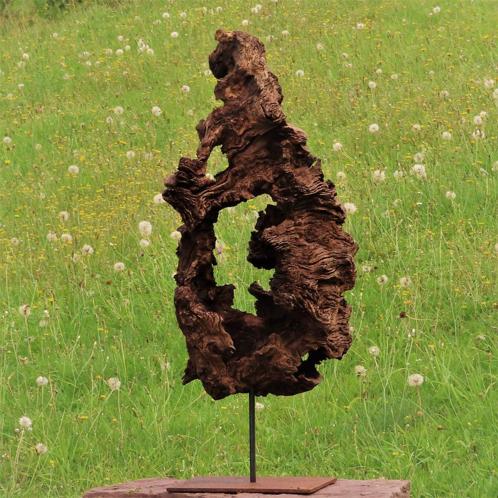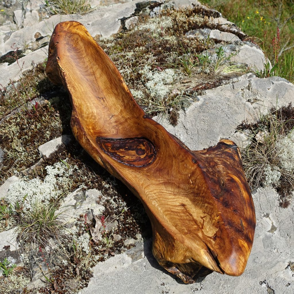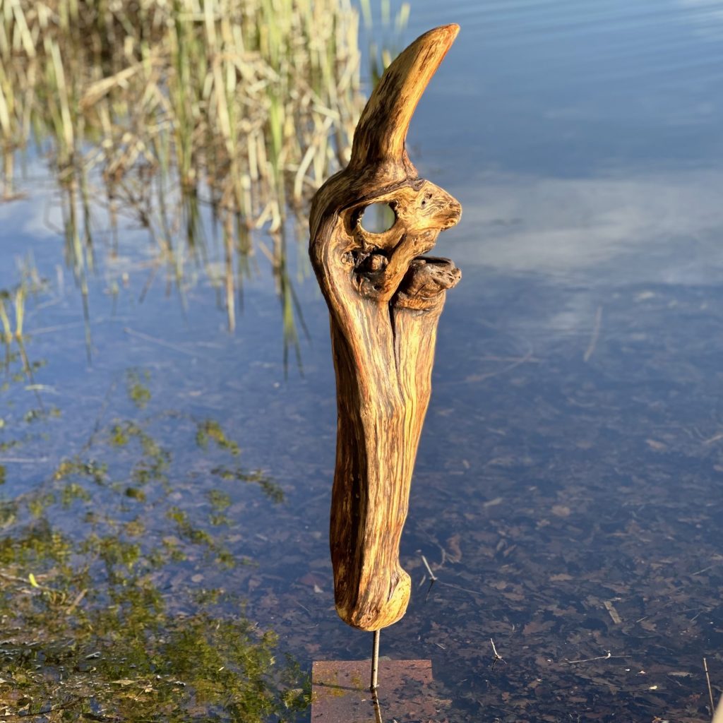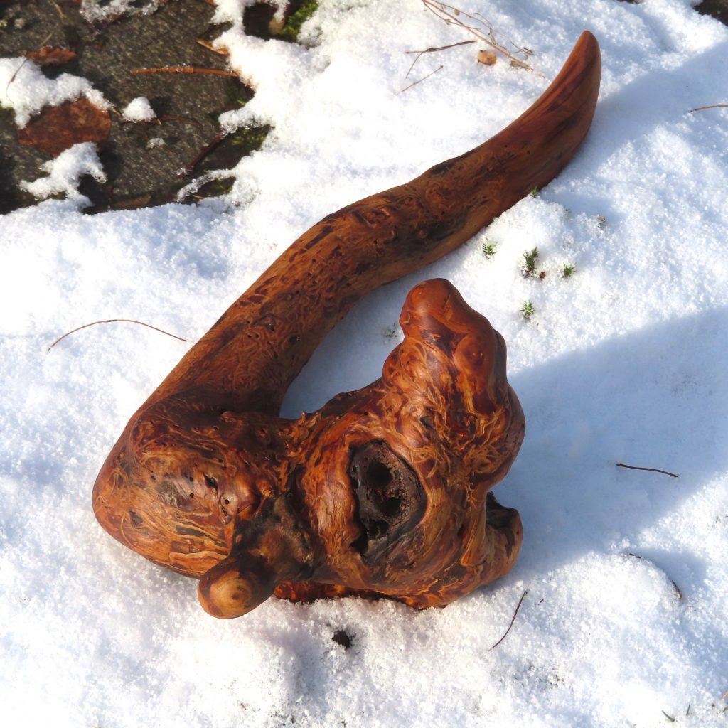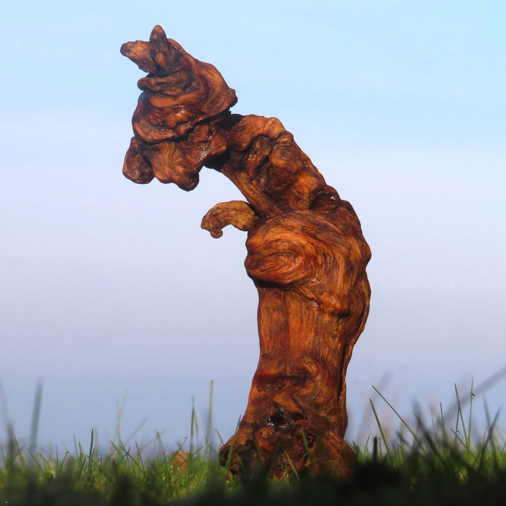 Das Treibholzstück habe ich bei Leutesdorf am Rhein gefunden (siehe zweites Foto) und in seinen Umrissen nicht verändert. Schwer zu sagen, von welcher Baumart das schön marmorierte Holz stammt, da der lange Aufenthalt im Wasser die Eigenschaften des Holzes beeinflusst. Ich vermute am ehesten ein Obstbaumholz.