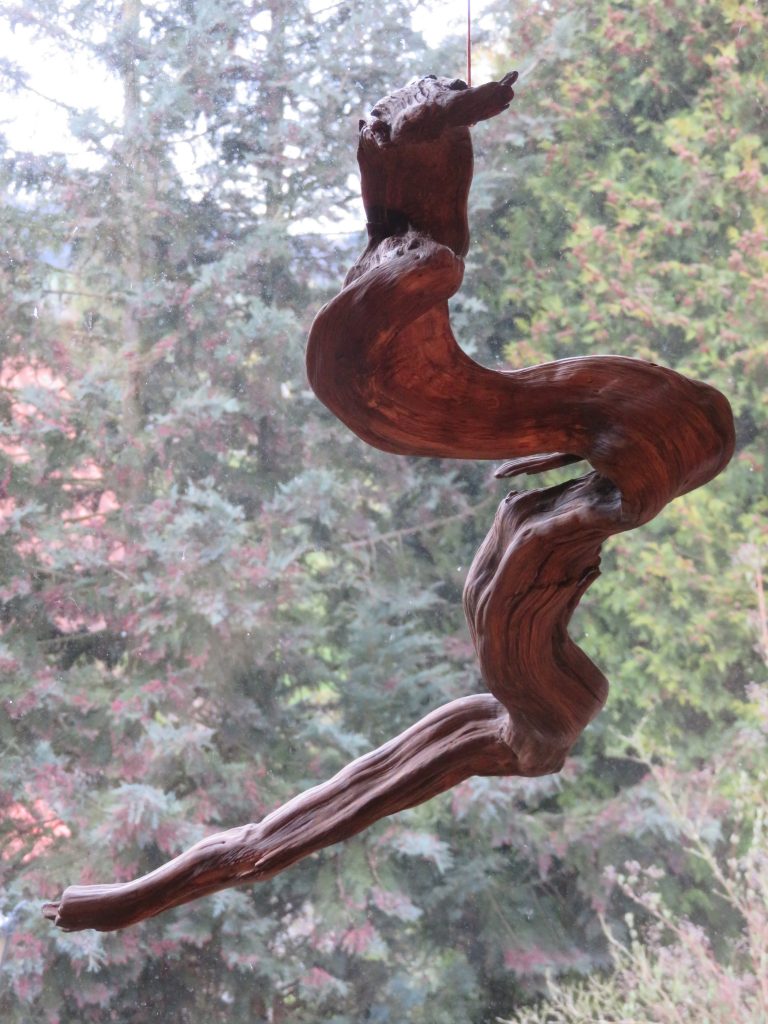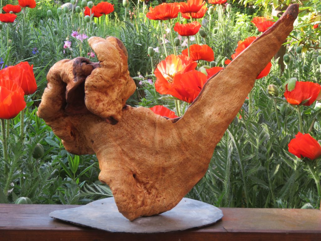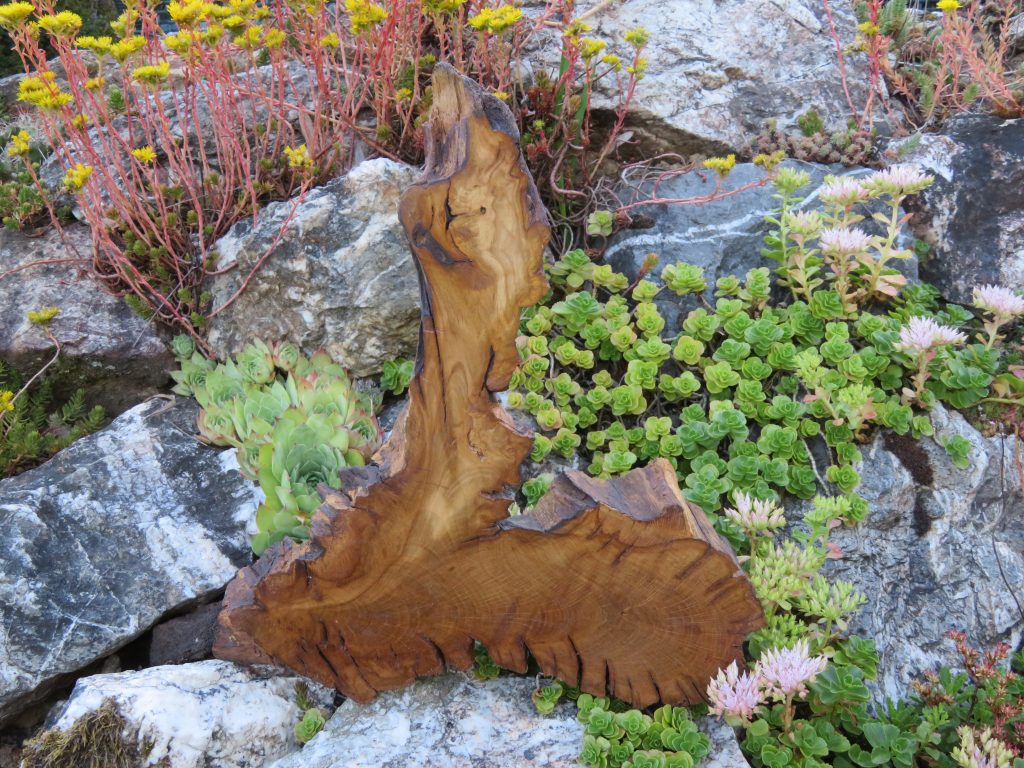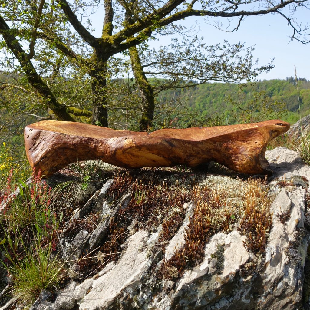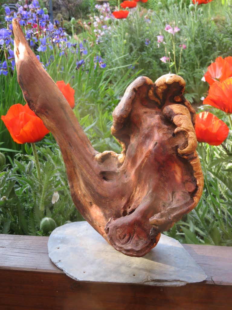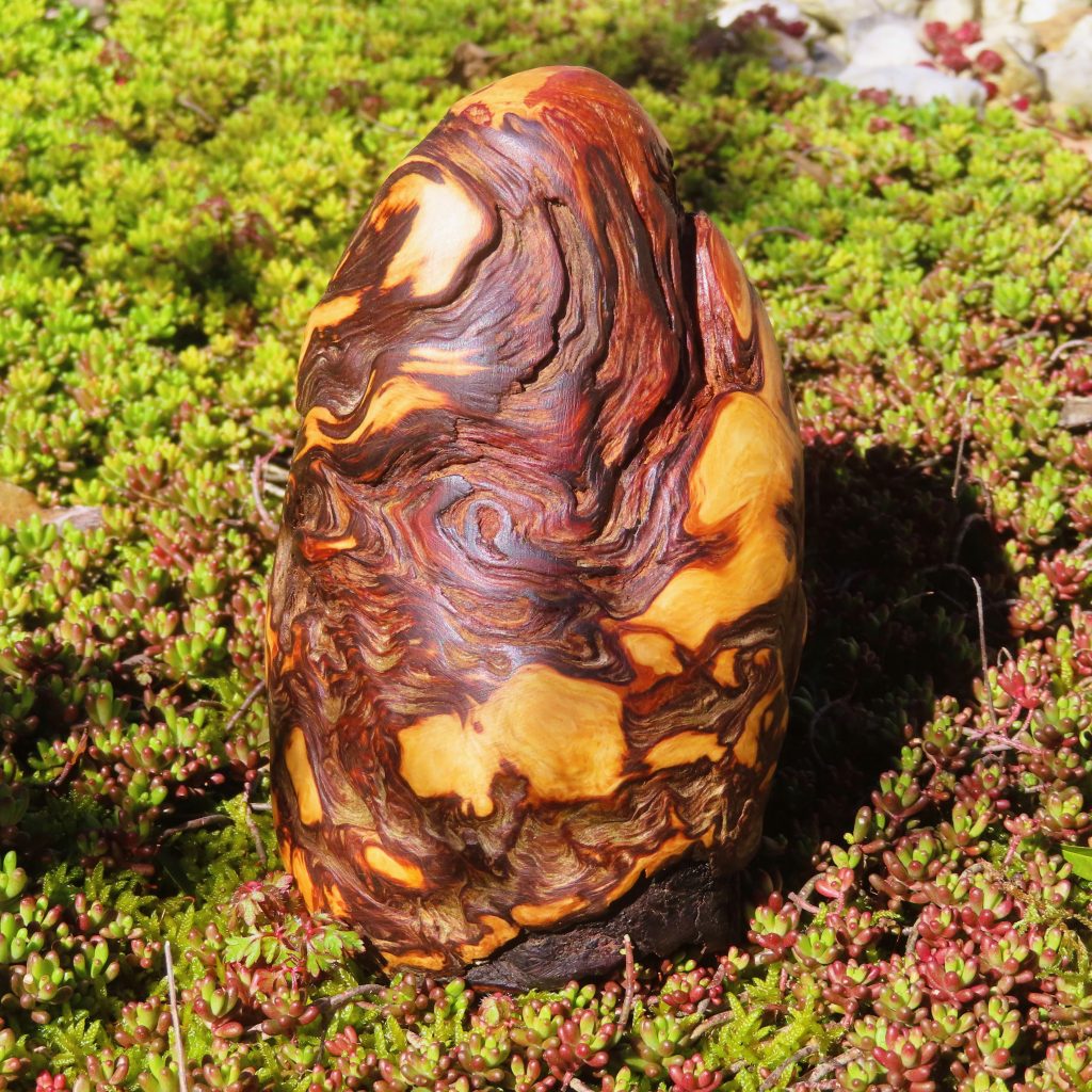 Das Treibholzstück habe ich bei Leutesdorf am Rhein gefunden (siehe zweites Foto) und in seinen Umrissen nicht verändert. Schwer zu sagen, von welcher Baumart das schön marmorierte Holz stammt, da der lange Aufenthalt im Wasser die Eigenschaften des Holzes beeinflusst. Ich vermute am ehesten ein Obstbaumholz.
