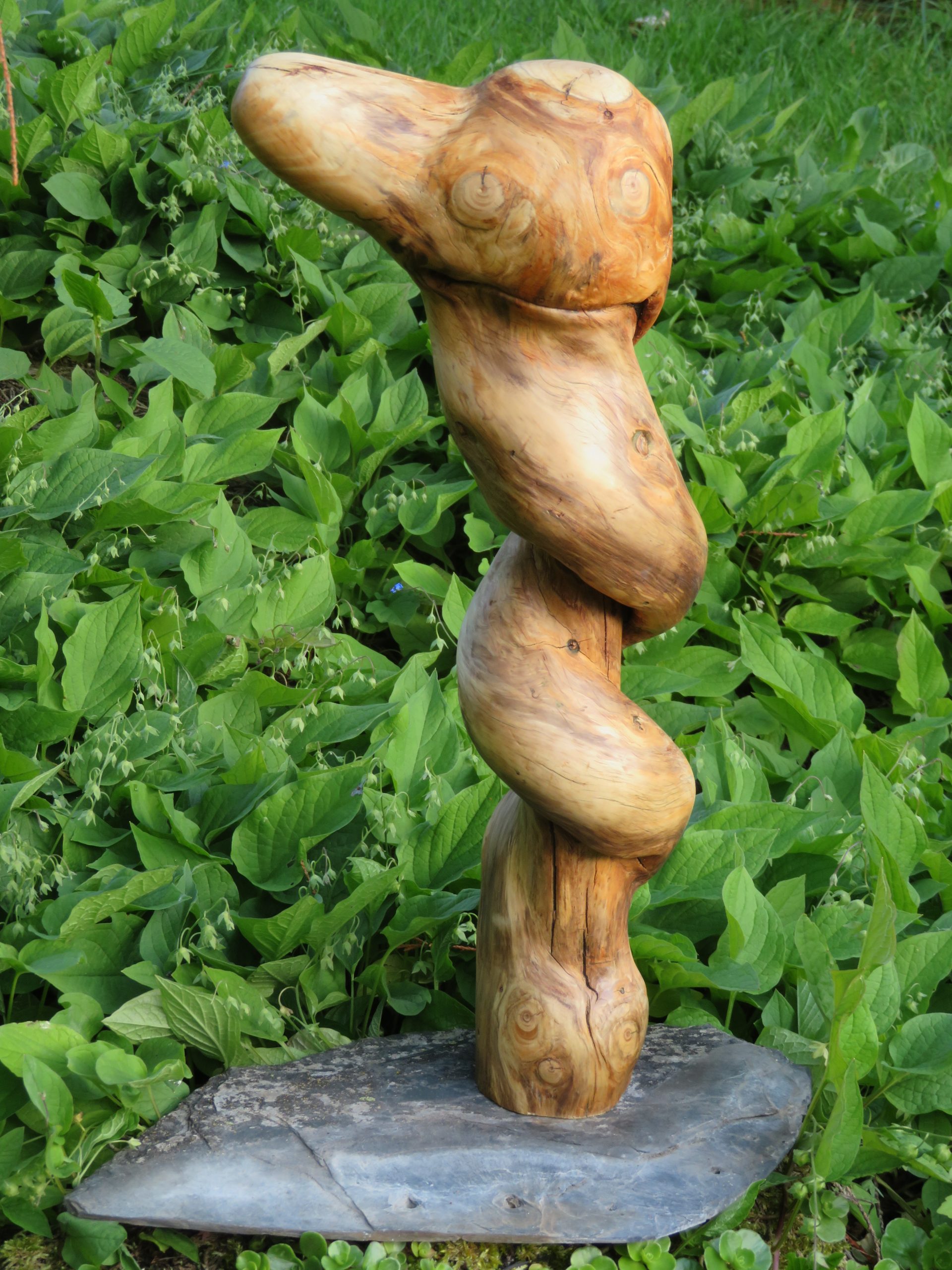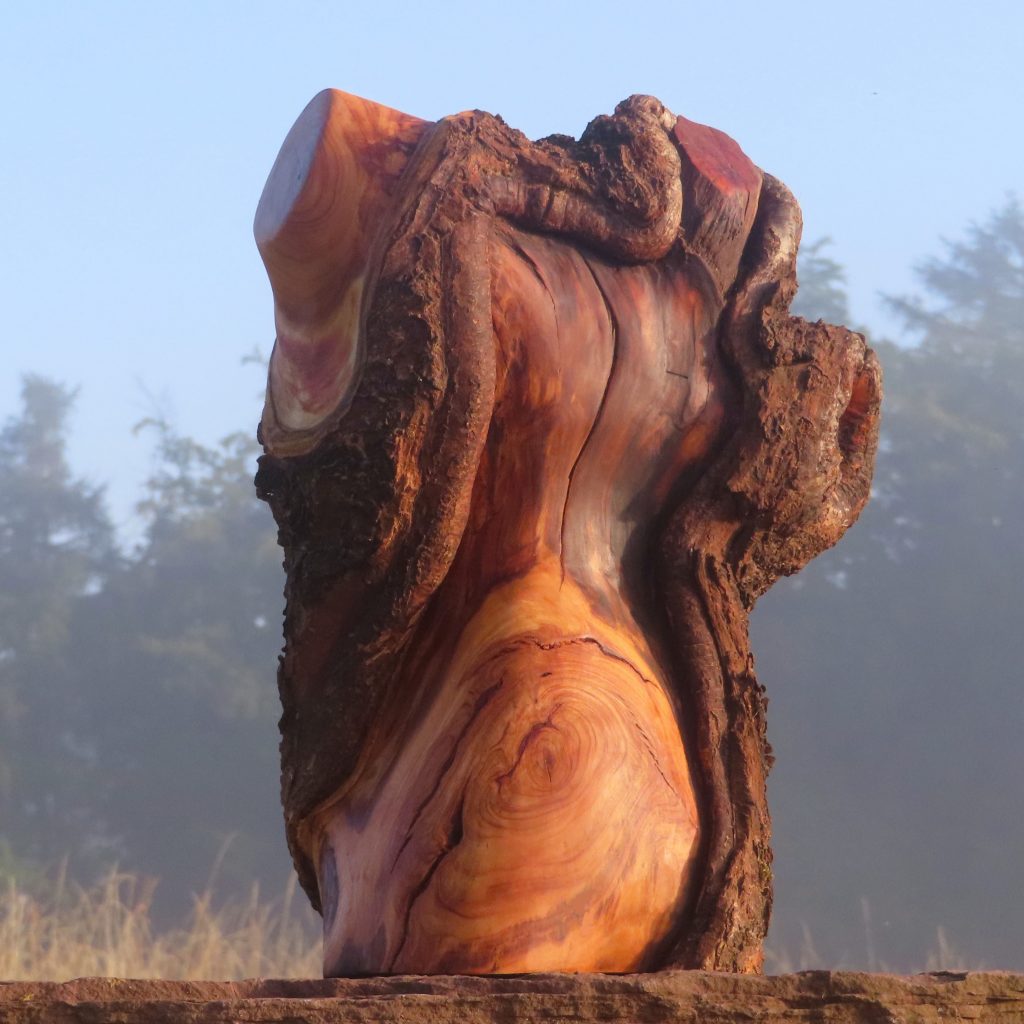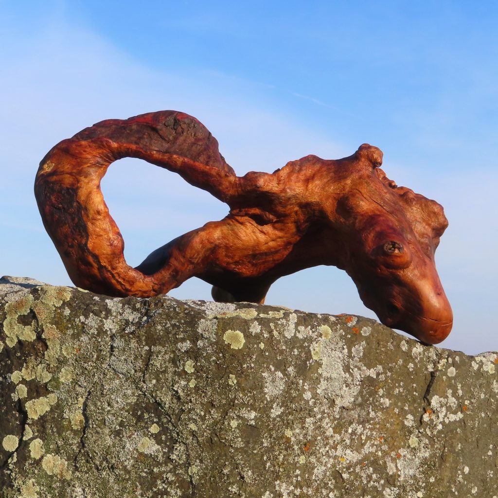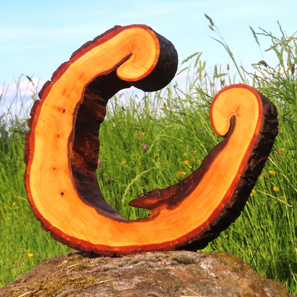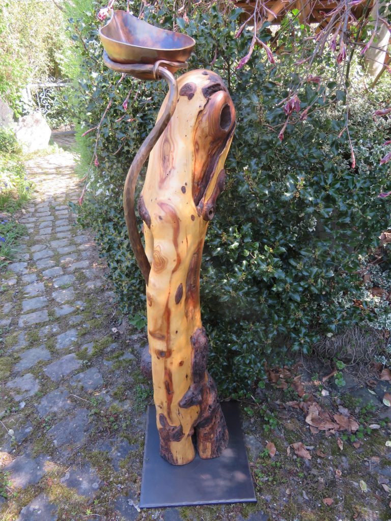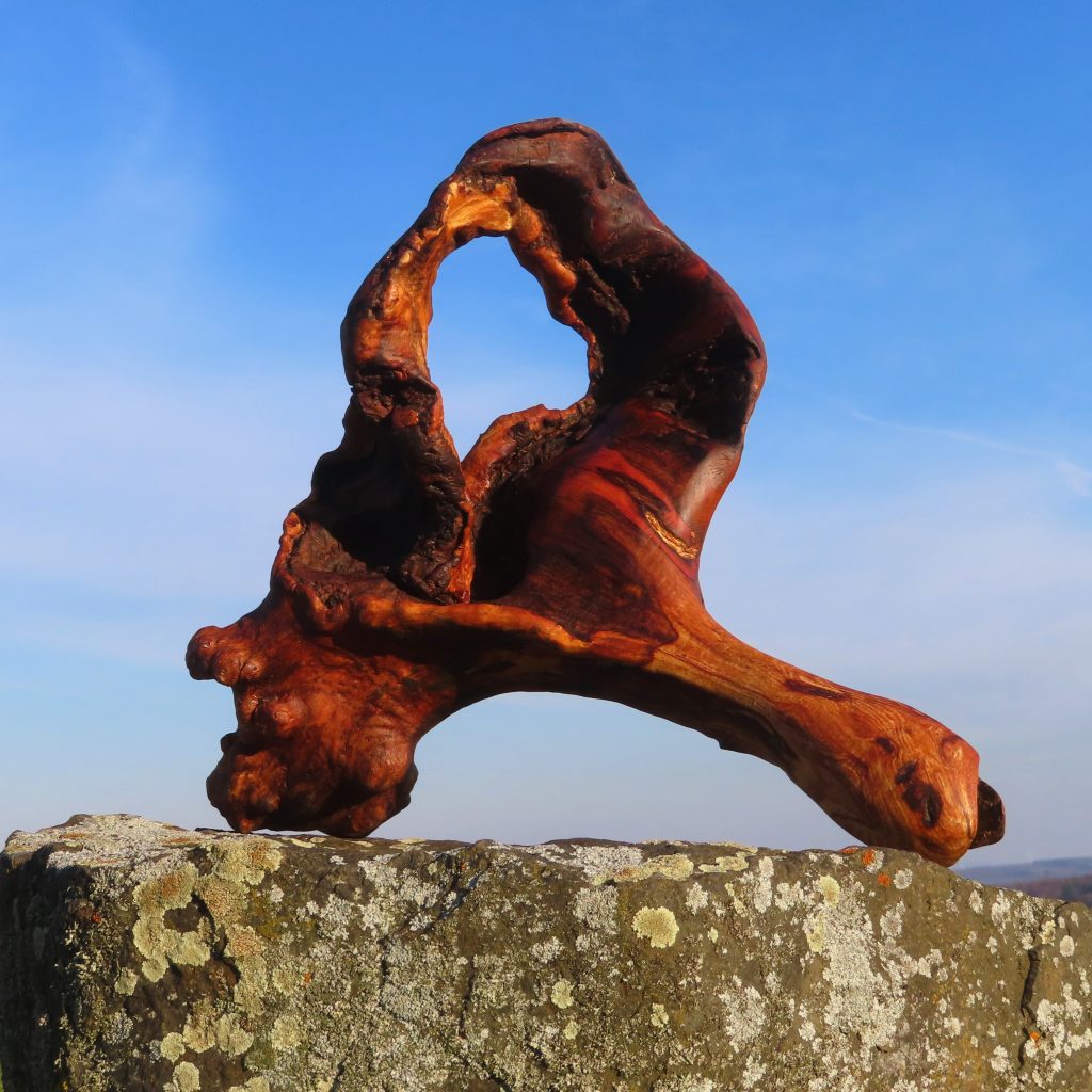 Das Treibholzstück habe ich bei Leutesdorf am Rhein gefunden (siehe zweites Foto) und in seinen Umrissen nicht verändert. Schwer zu sagen, von welcher Baumart das schön marmorierte Holz stammt, da der lange Aufenthalt im Wasser die Eigenschaften des Holzes beeinflusst. Ich vermute am ehesten ein Obstbaumholz.