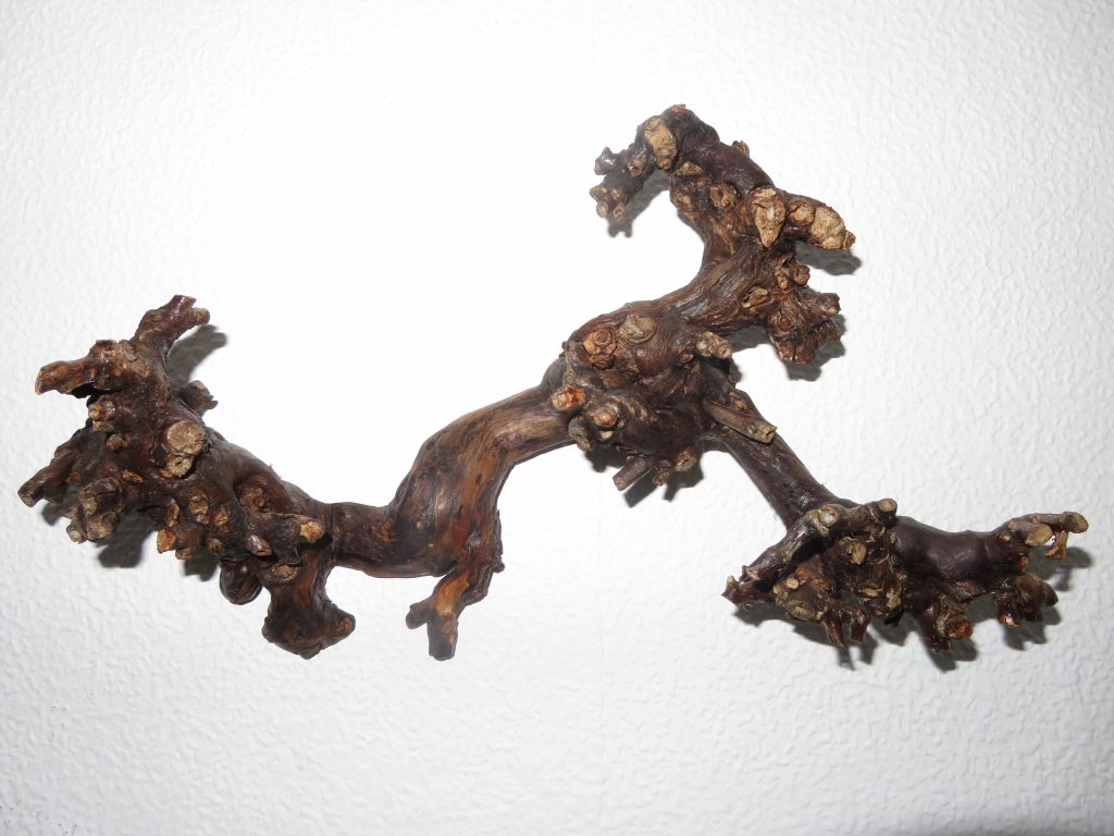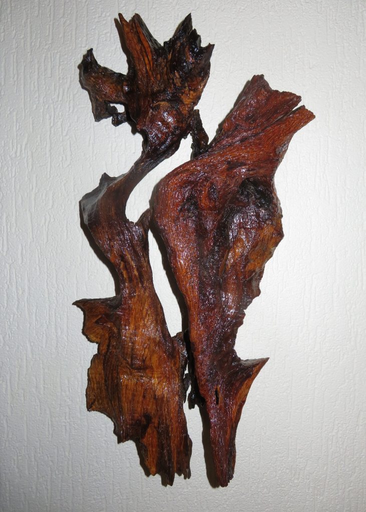 Das knorrige Holzstück fand ich in einem Haufen ausrangierter Rebstöcke am Ahr-Wanderweg. Ich habe es der Länge nach durchgeschnitten, damit es besser an der Wand anliegt.