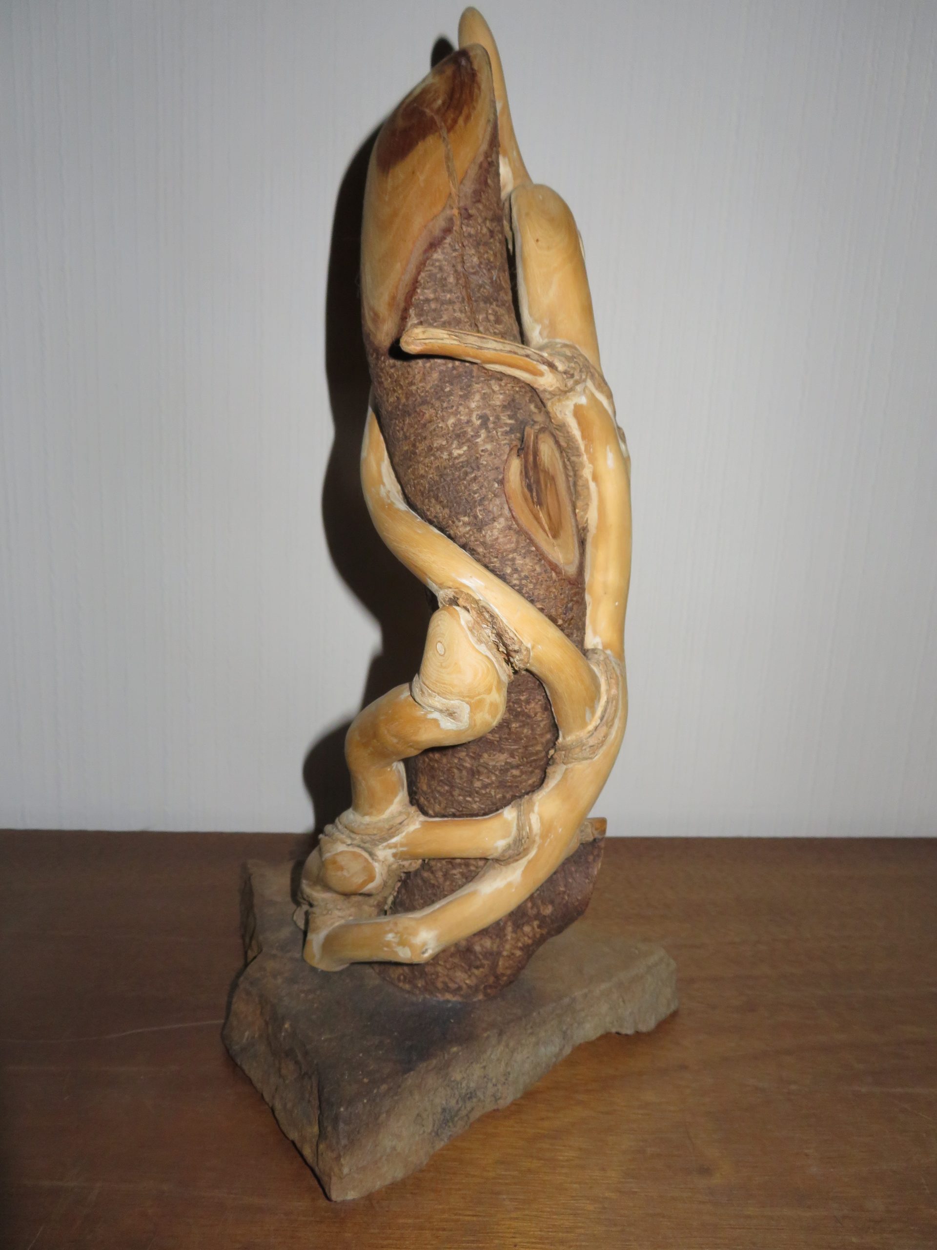 Das mit Moos überwachsene, undefinierbare Gebilde (Bild unten) befand sich im ausgedehnten Wurzelbereich einer starken Buche. Als ich vorsichtig daran wackelte, hatte ich es auch schon in der Hand. Nach dem Reinigen, Entrinden und Ölen habe ich die Skulptur auf eine Schieferplatte montiert.