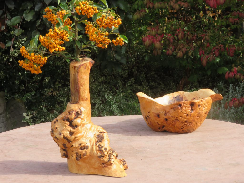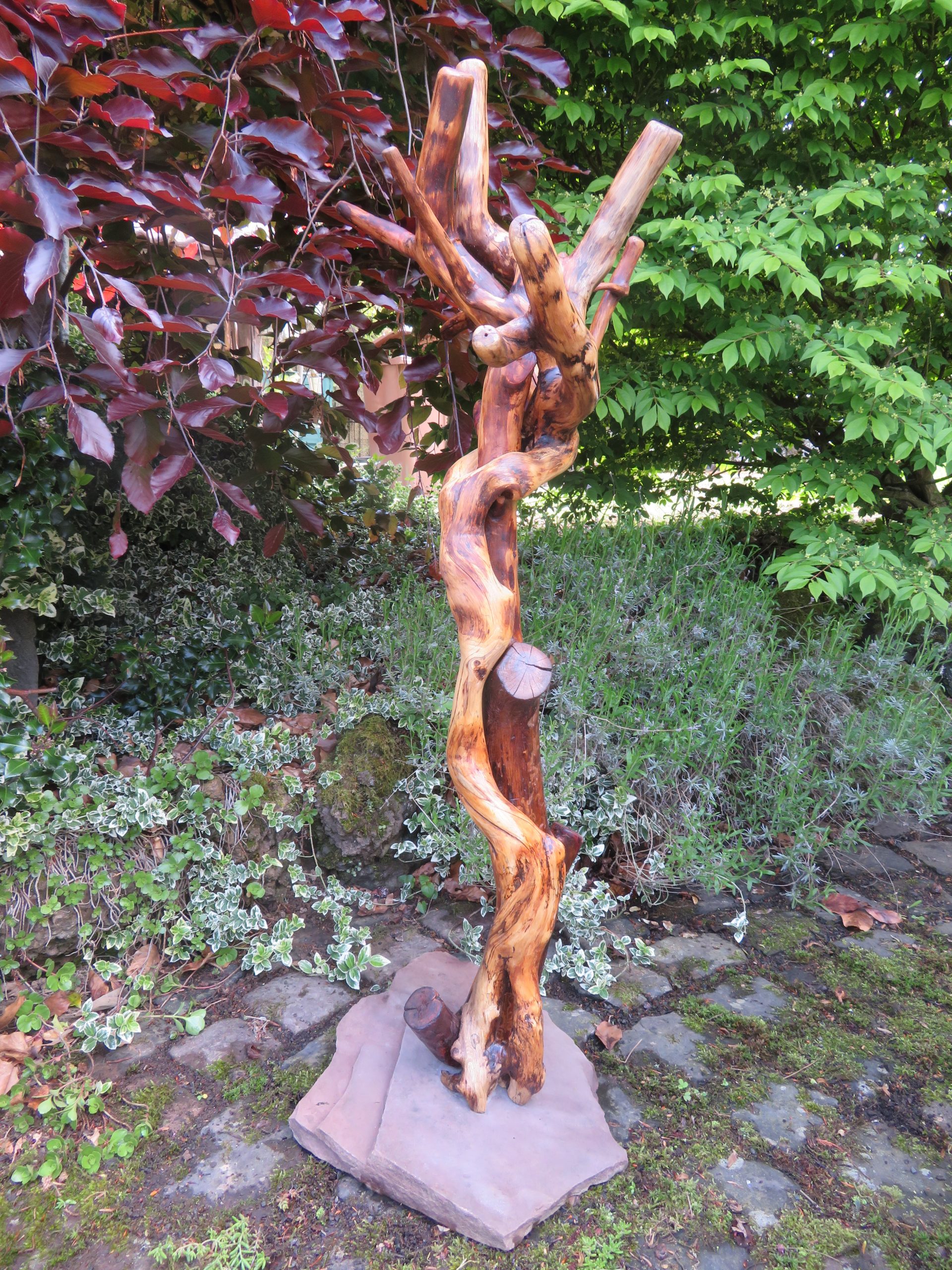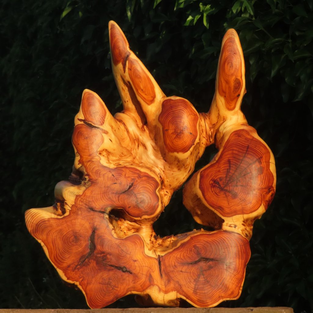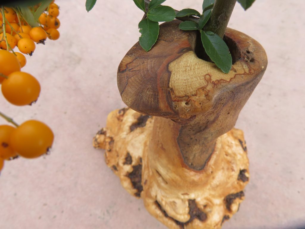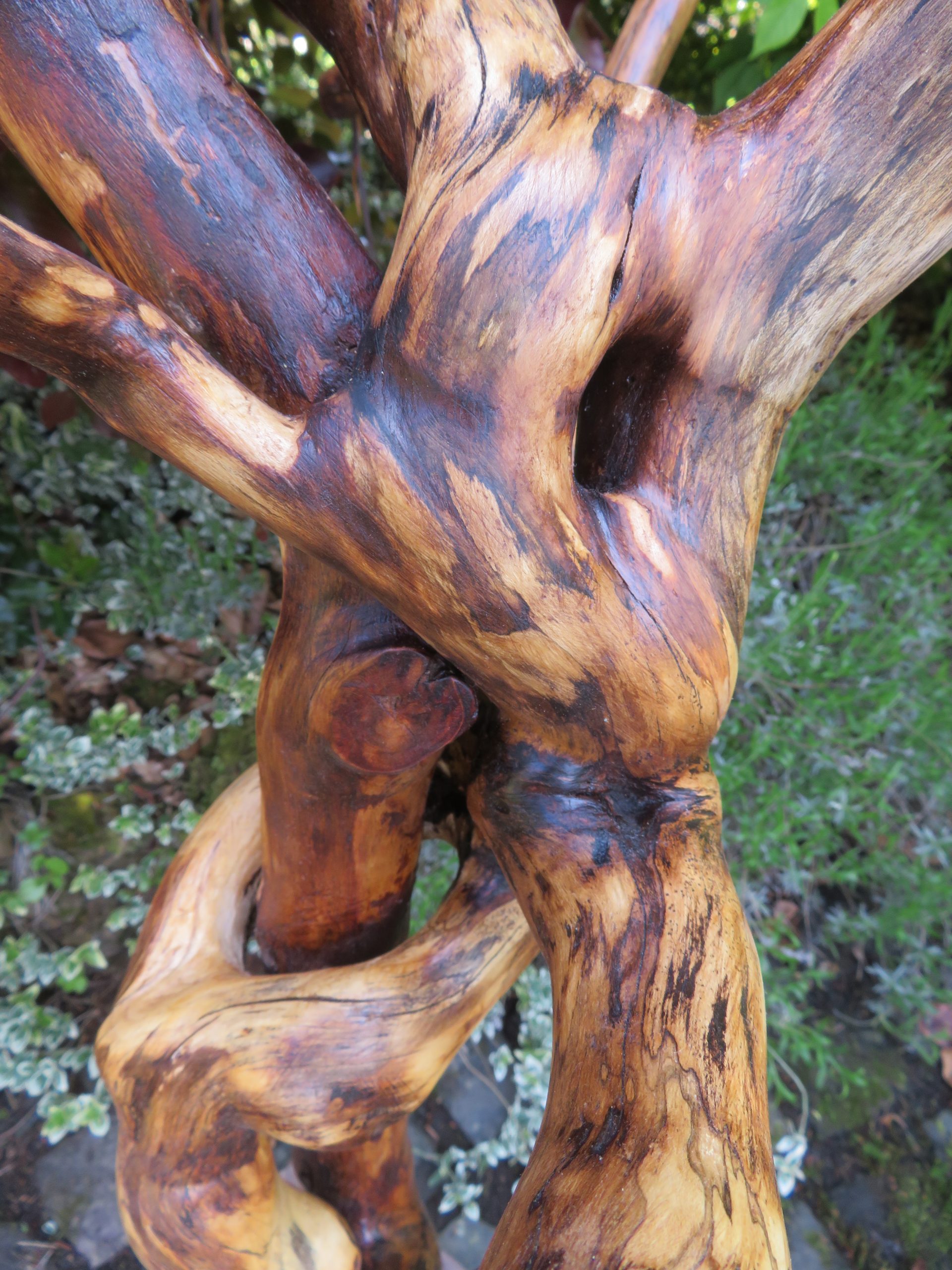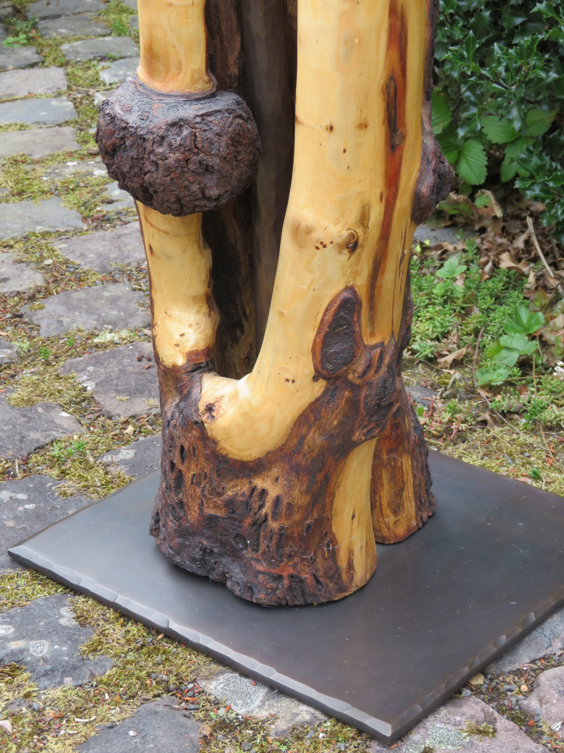 Das Holz, insbesondere des Efeu, war teilweise oberflächlich verwittert und musste m.o.w. stark weggeraspelt werden, wodurch sich eine interessante Marmorierung ergibt.