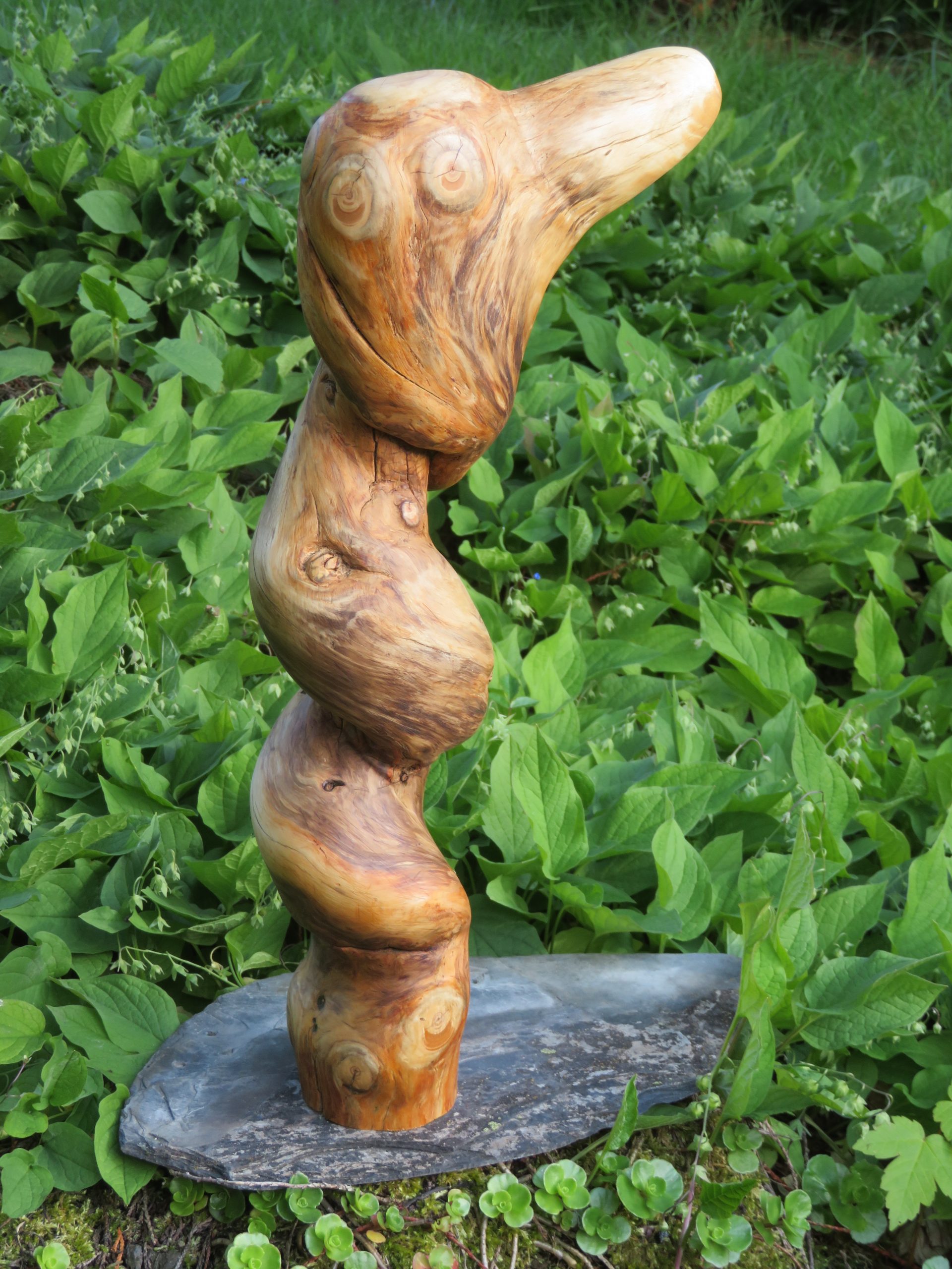 „Wandervogel“, Weinstock auf Schiefersockel, Höhe 55 cm. Eine nicht ganz ernst gemeinte kleine Holzarbeit.
