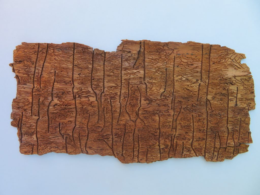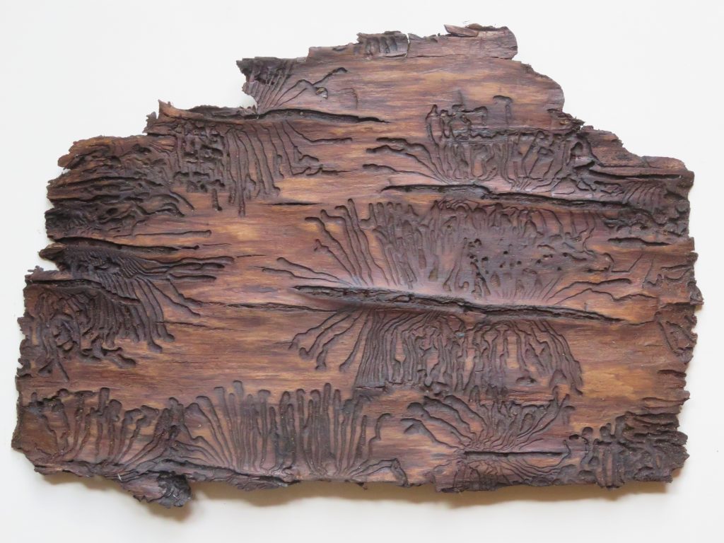 Begünstigt durch die Trockenheit der Jahre 2018 und 2019 haben Borkenkäfer in unseren Wäldern erhebliche Schäden angerichtet, insbesondere in Fichtenkulturen. Die Fraßgänge der kleinen Schädlinge, genauer gesagt ihrer Larven, entfalten durchaus einen gewissen ästhetischen Reiz. Vgl. auch Nr. 10.