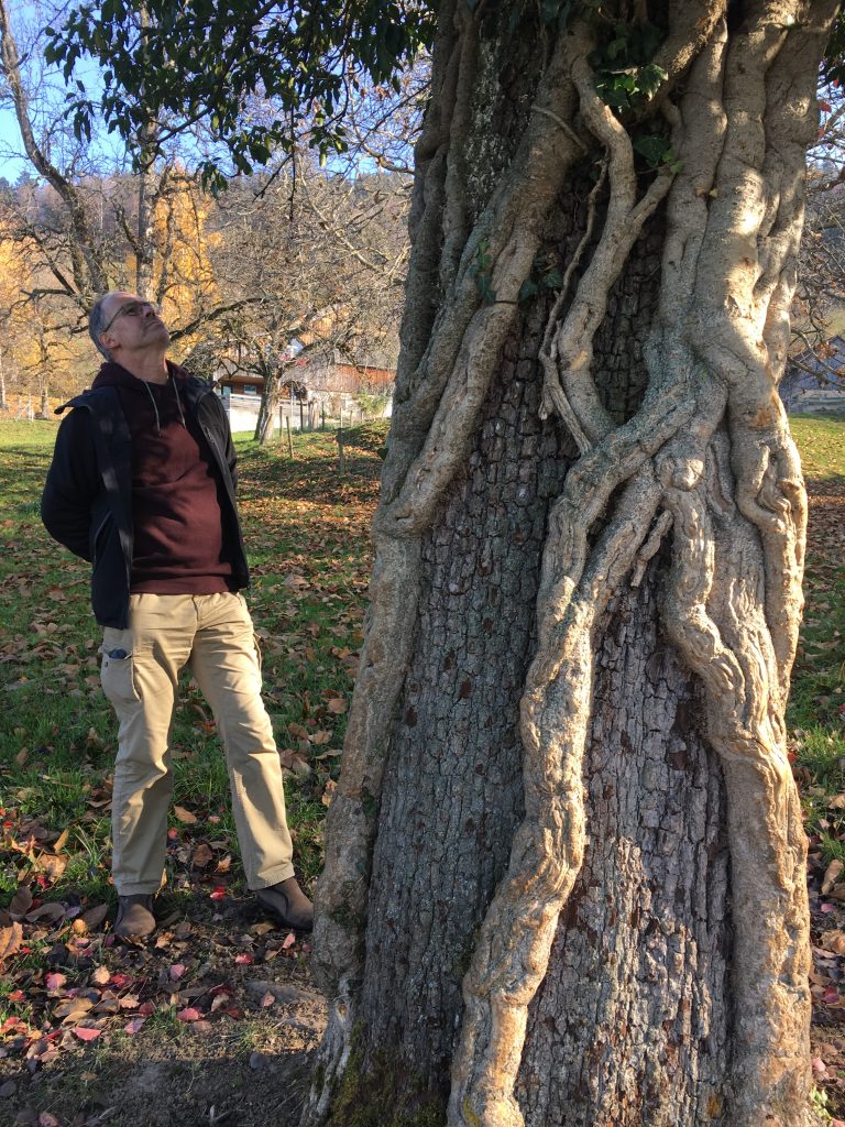Der Efeu windet sich um den Apfelbaum und übertrifft teilweise dessen Stärke.