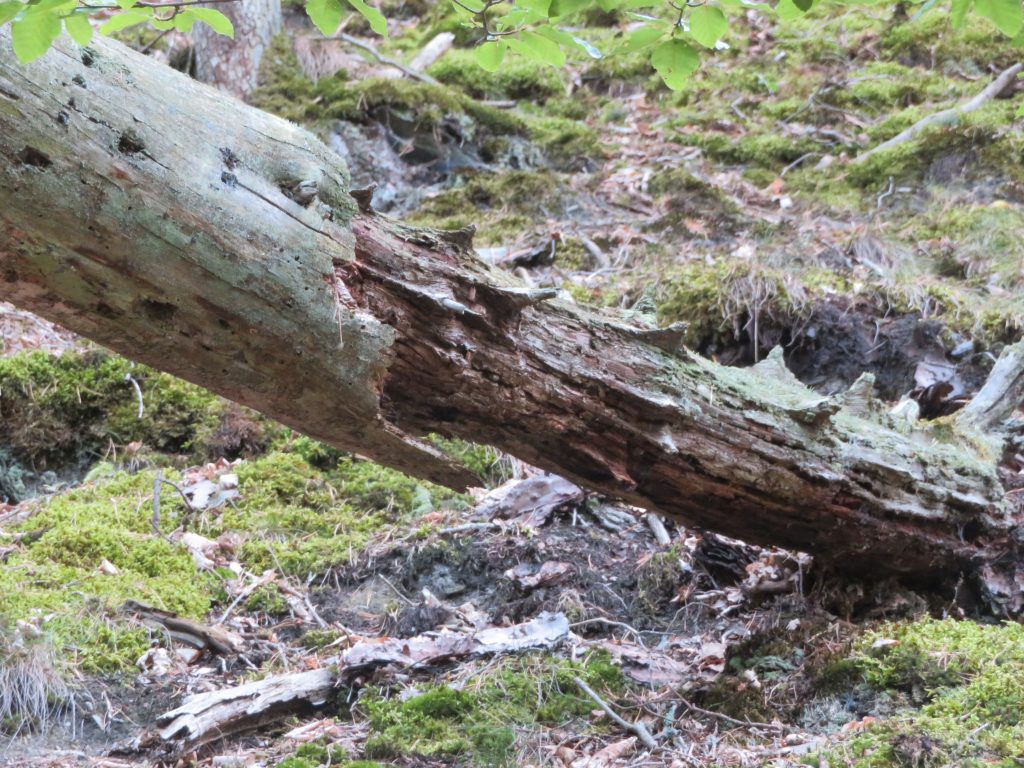 Zu Nrn. 3-5: Solch skurrile Formen entstehen, wenn Fichtenholz unter mäßig feuchten Bedingungen verwittert und nur die witterungsbeständigeren Kernholzanteile übrig bleiben. An diesem Stamm kann man diesen Vorgang exemplarisch studieren.