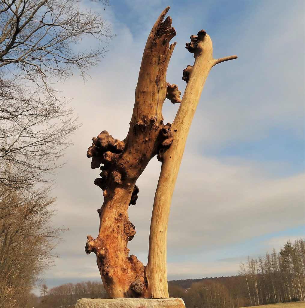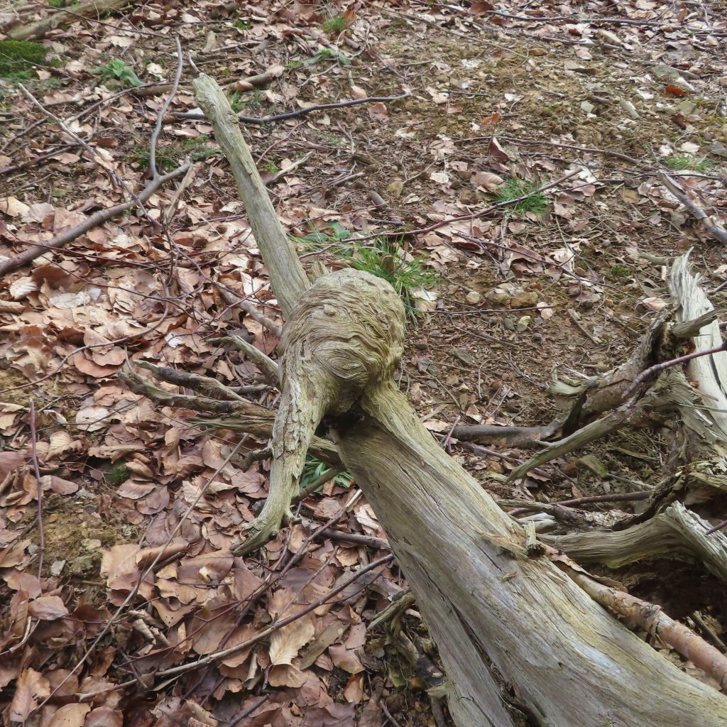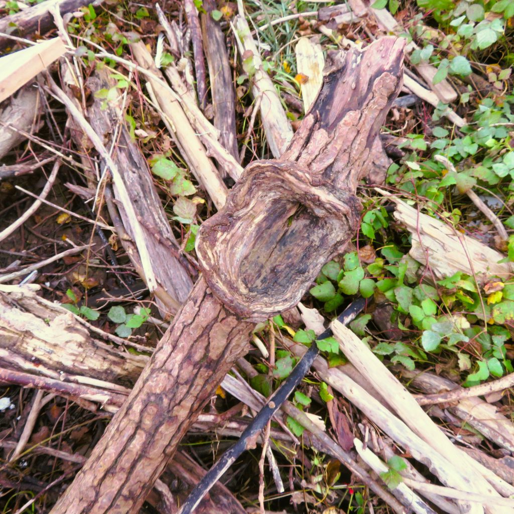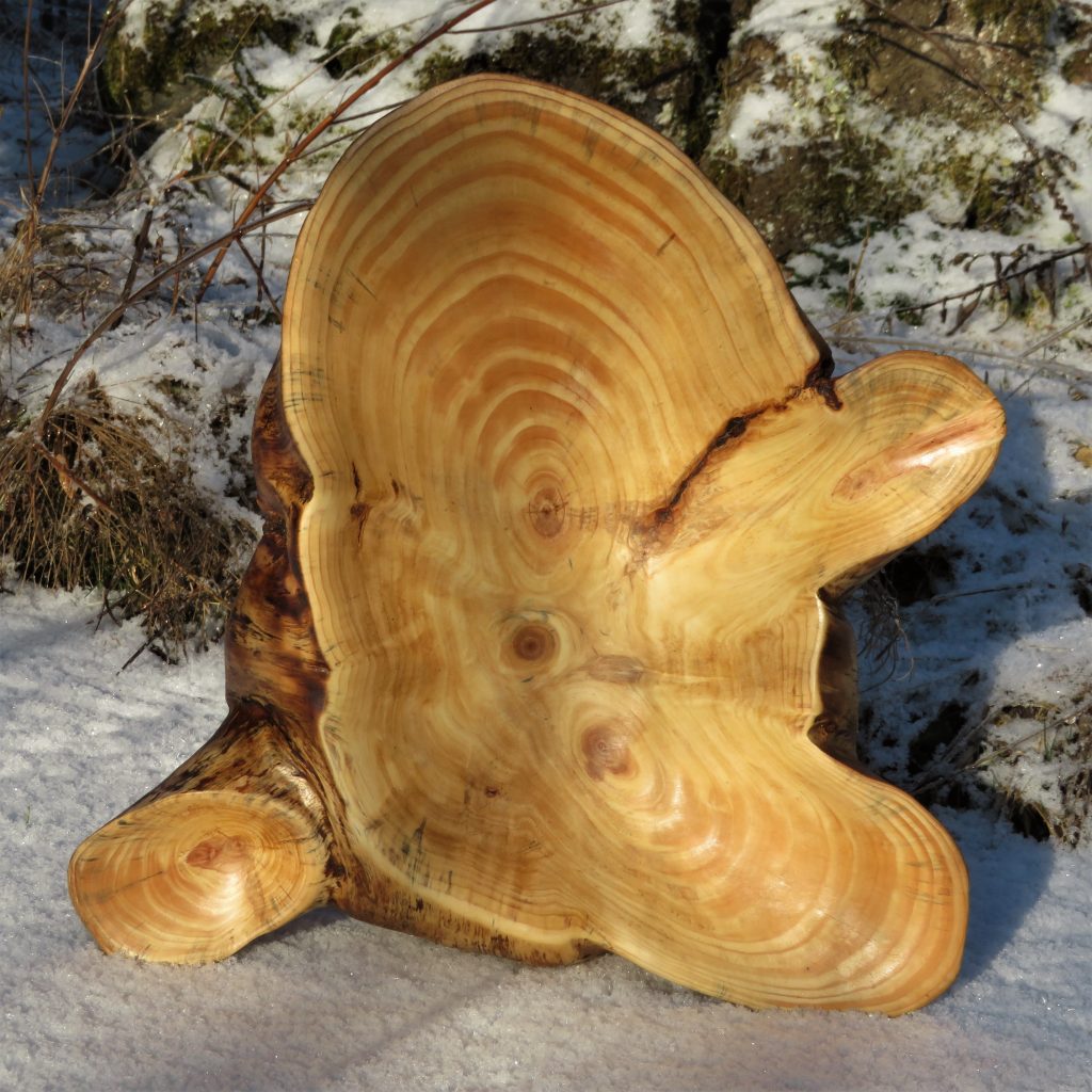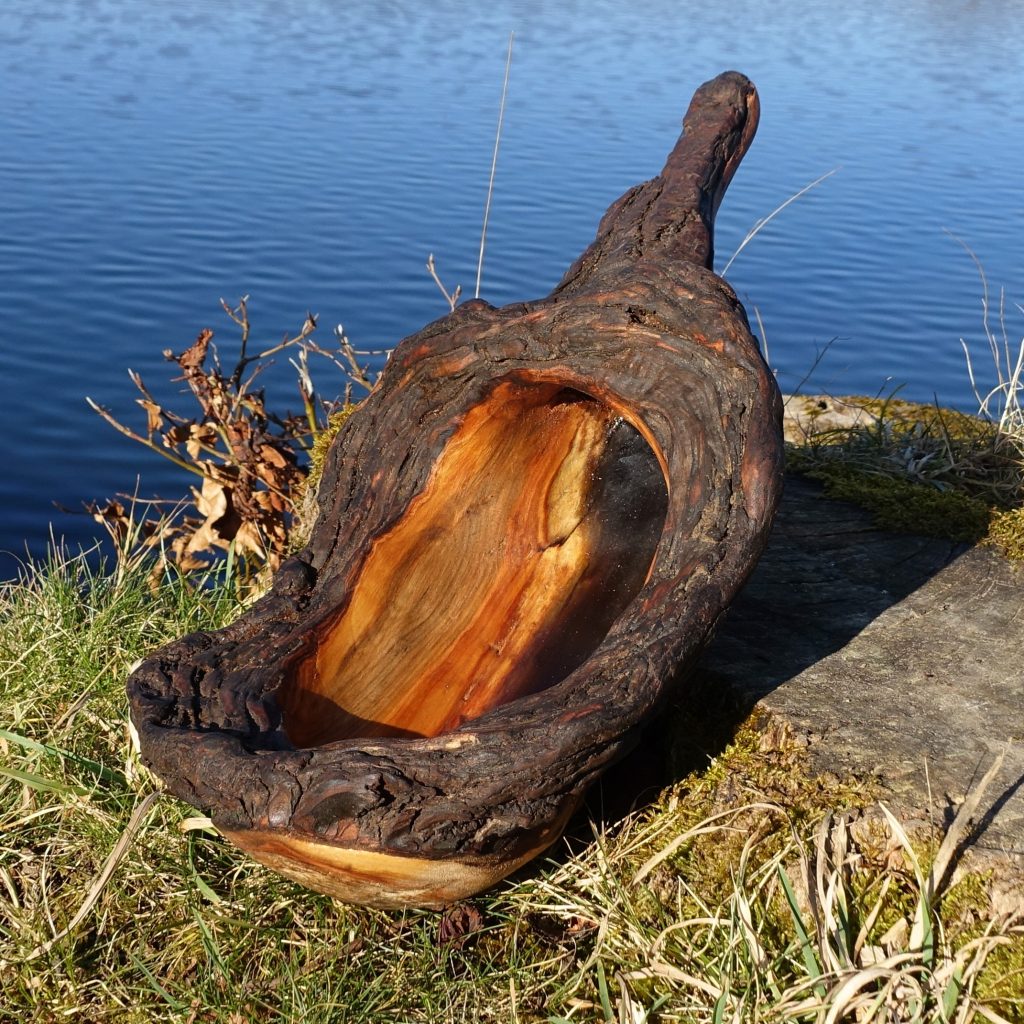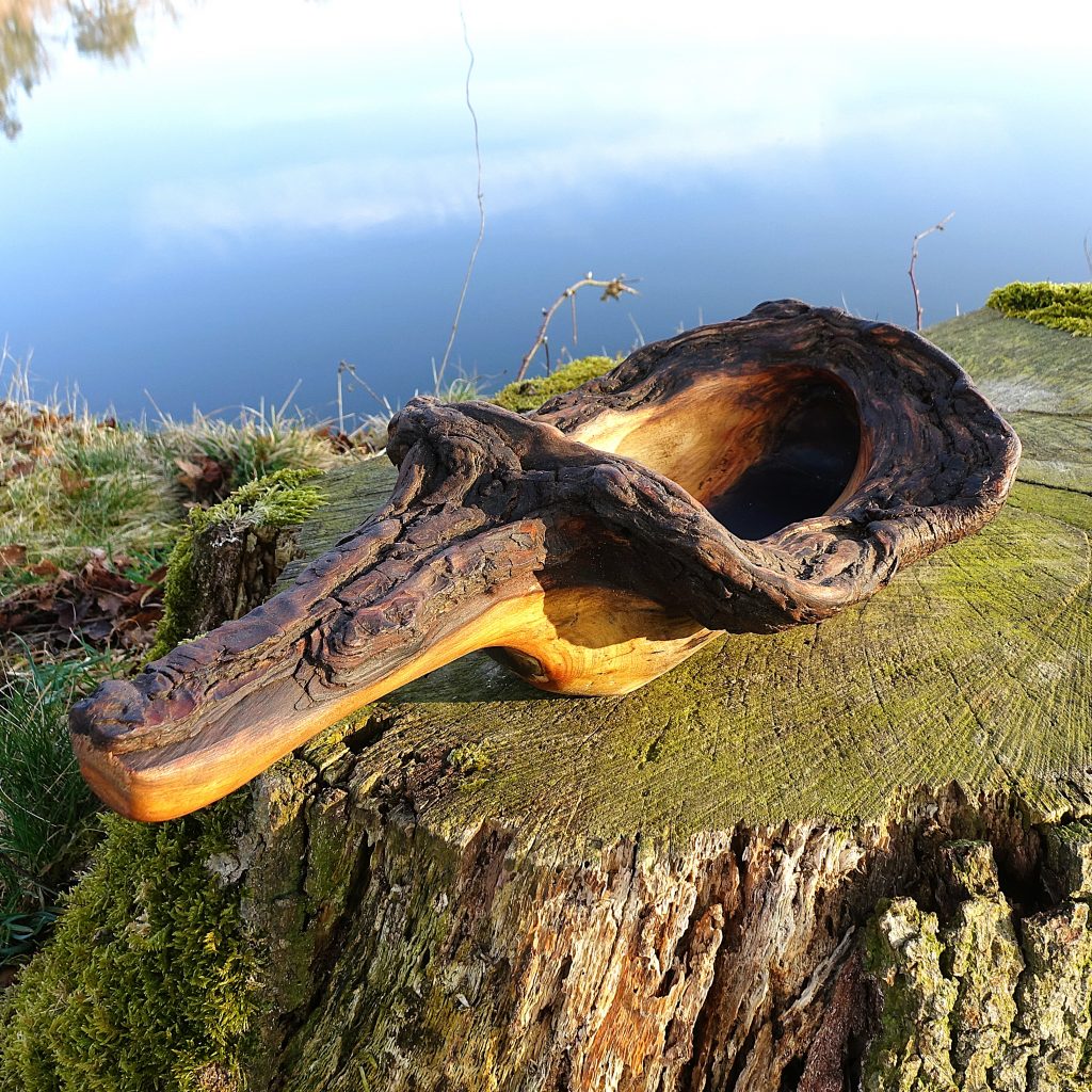 Aus der Astgabel eines abgestorbenen, vom Sturm gefällten Baumes ist eine erstaunlich lebendige Schale entstanden, wie ich finde.