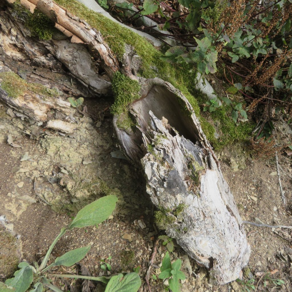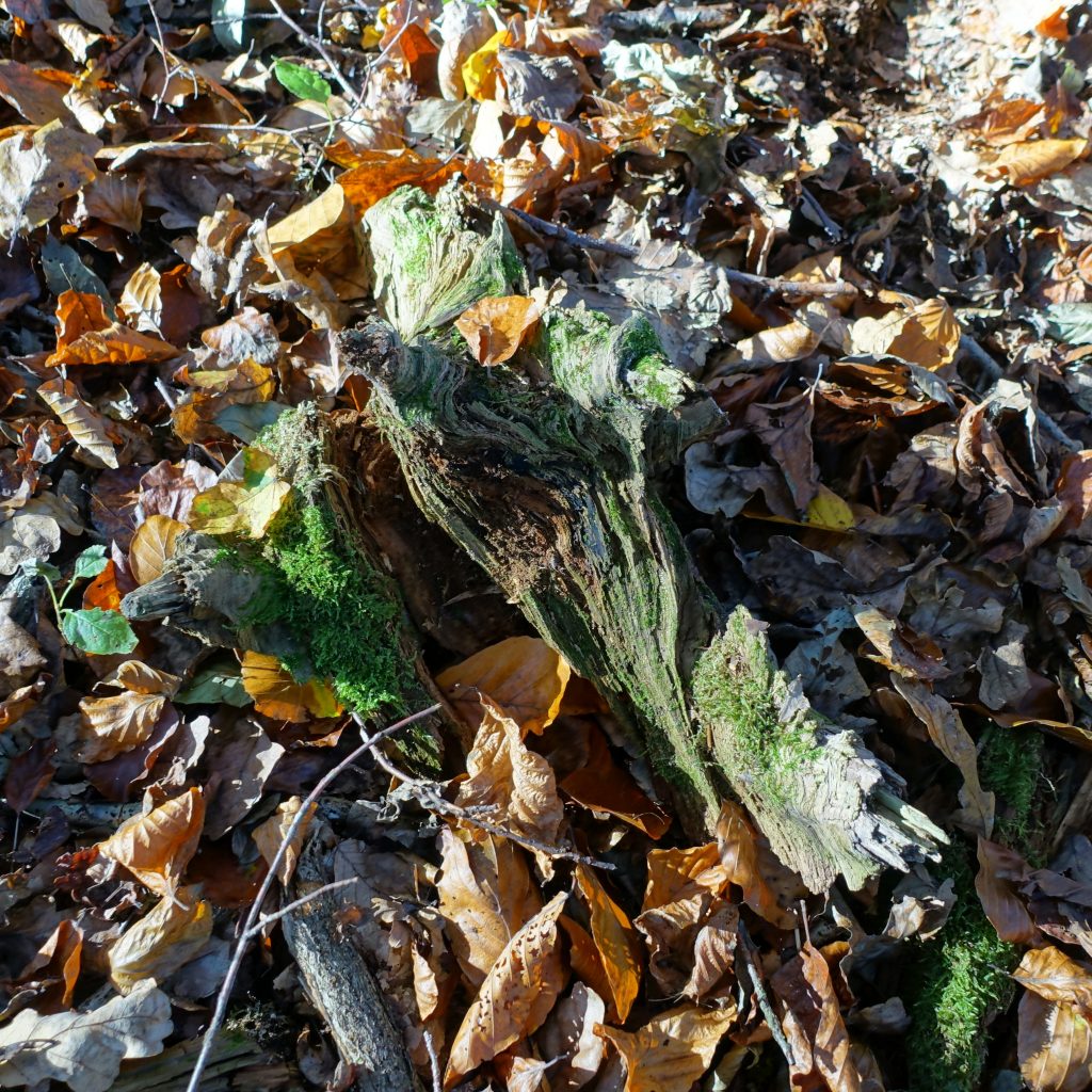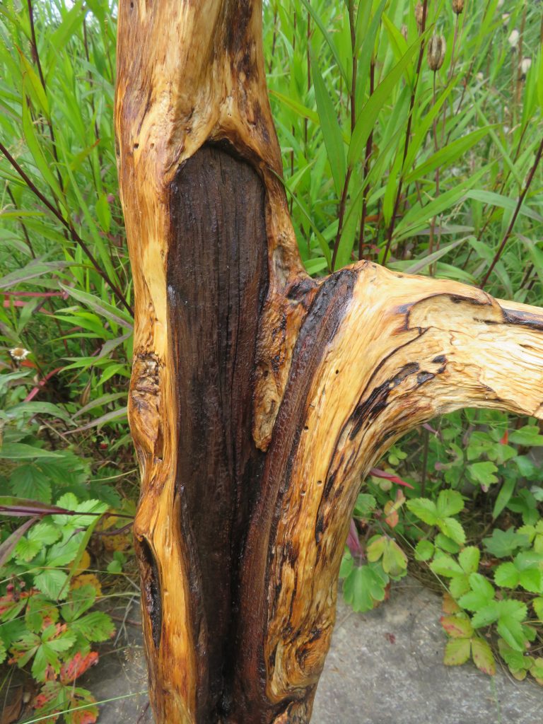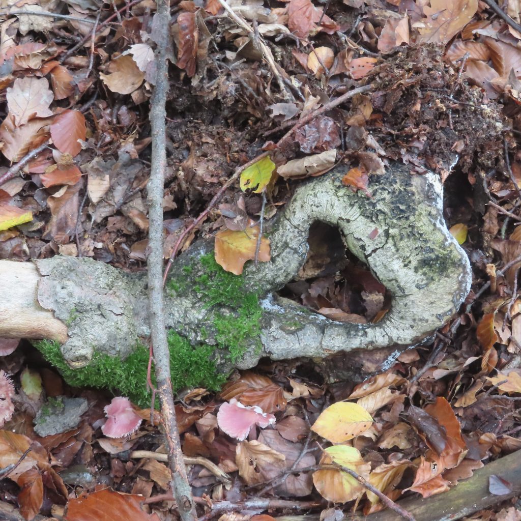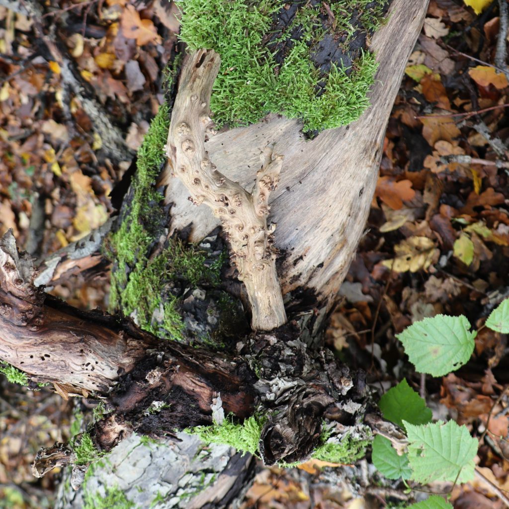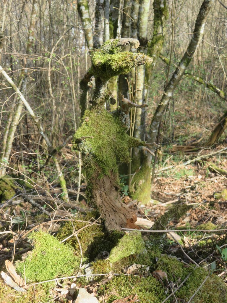 Aus der Astgabel eines abgestorbenen, vom Sturm gefällten Baumes ist eine erstaunlich lebendige Schale entstanden, wie ich finde.