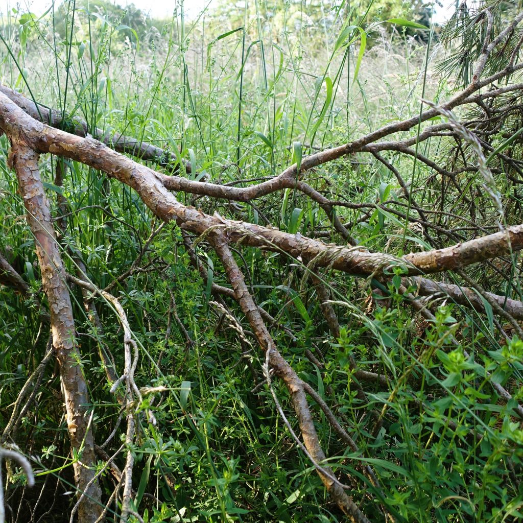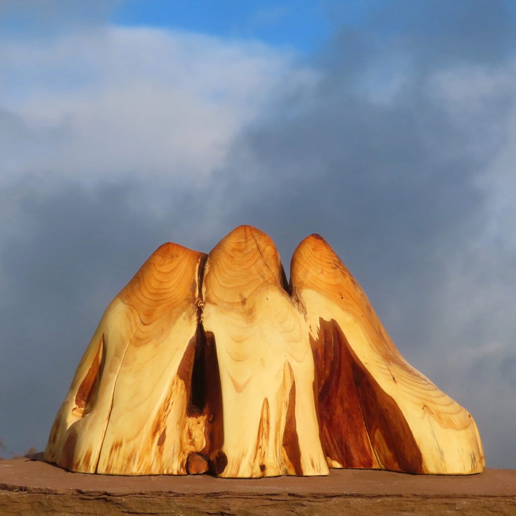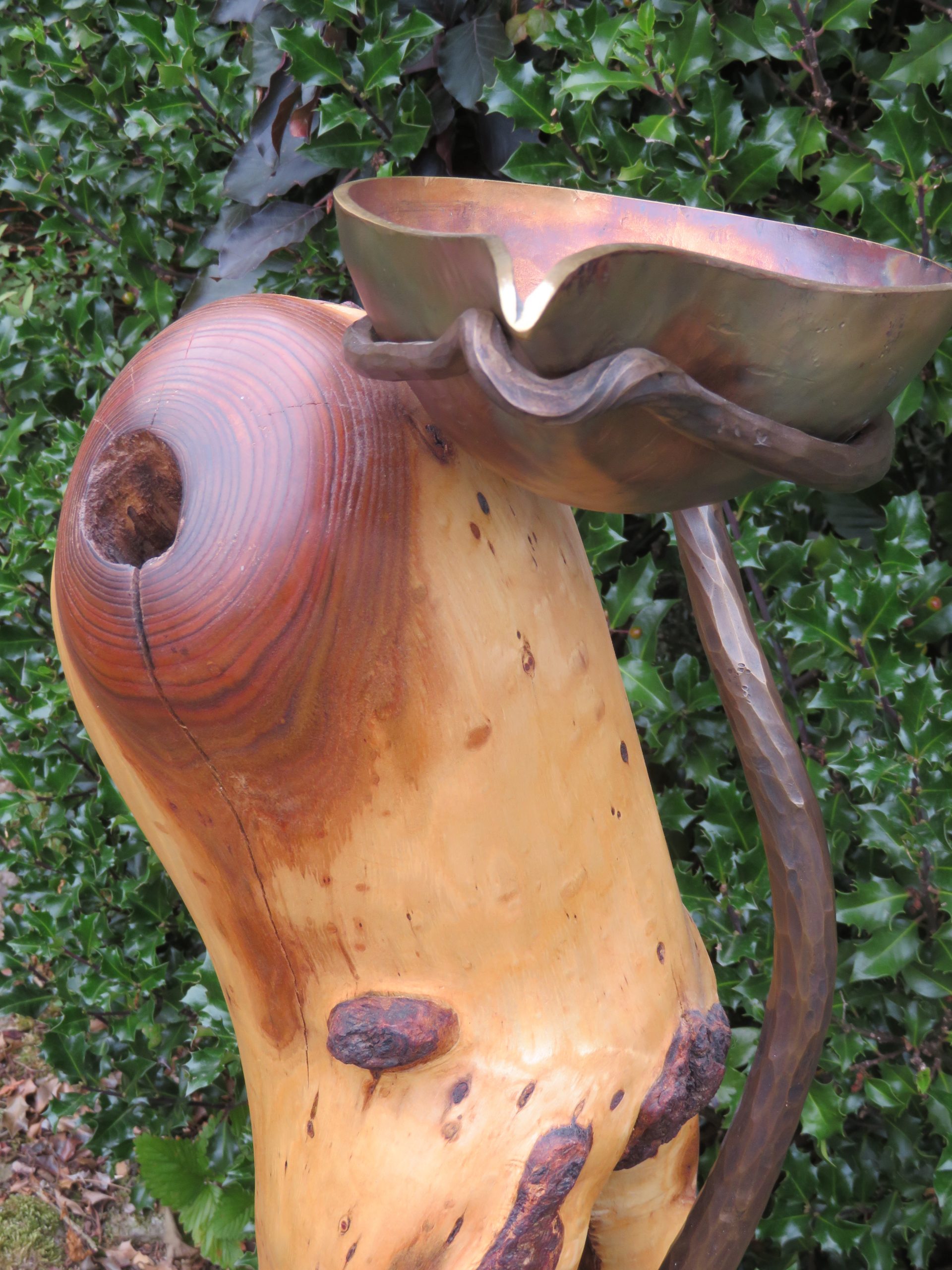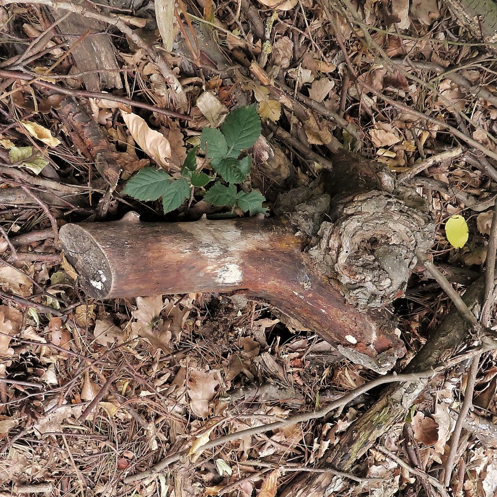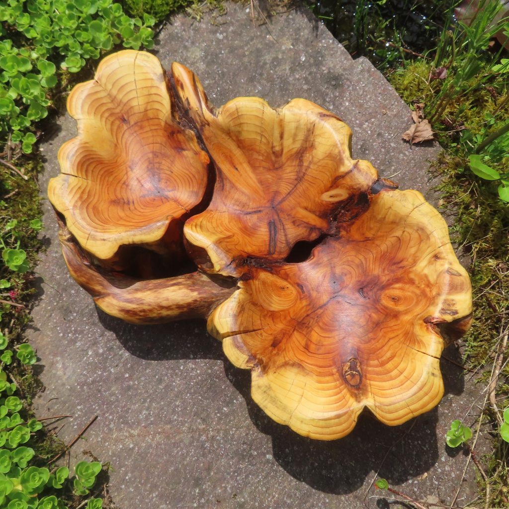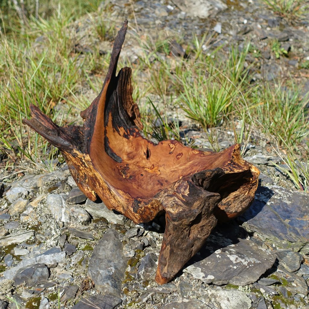 Aus der Astgabel eines abgestorbenen, vom Sturm gefällten Baumes ist eine erstaunlich lebendige Schale entstanden, wie ich finde.