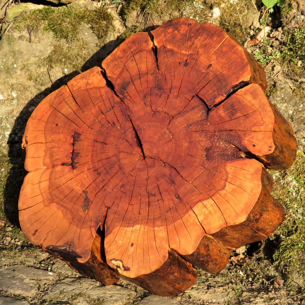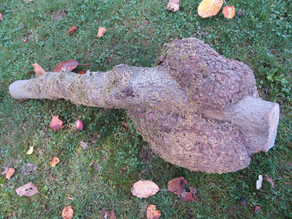 Das schöne Dekorationselement stammt von einem Apfelbaum, den jemand in Einzelteilen am Waldrand entsorgt hat. Bei den zahlreichen Knubbeln an der Außenseite der Scheibe handelt es sich um Obstbaumkrebs, hervorgerufen durch den Pilz Neonectria ditissima. Der Stamm ist fast völlig hohl, die wenigen Reste von Baumholz sind bunt marmoriert, ebenfalls ein Werk von Pilzen.
