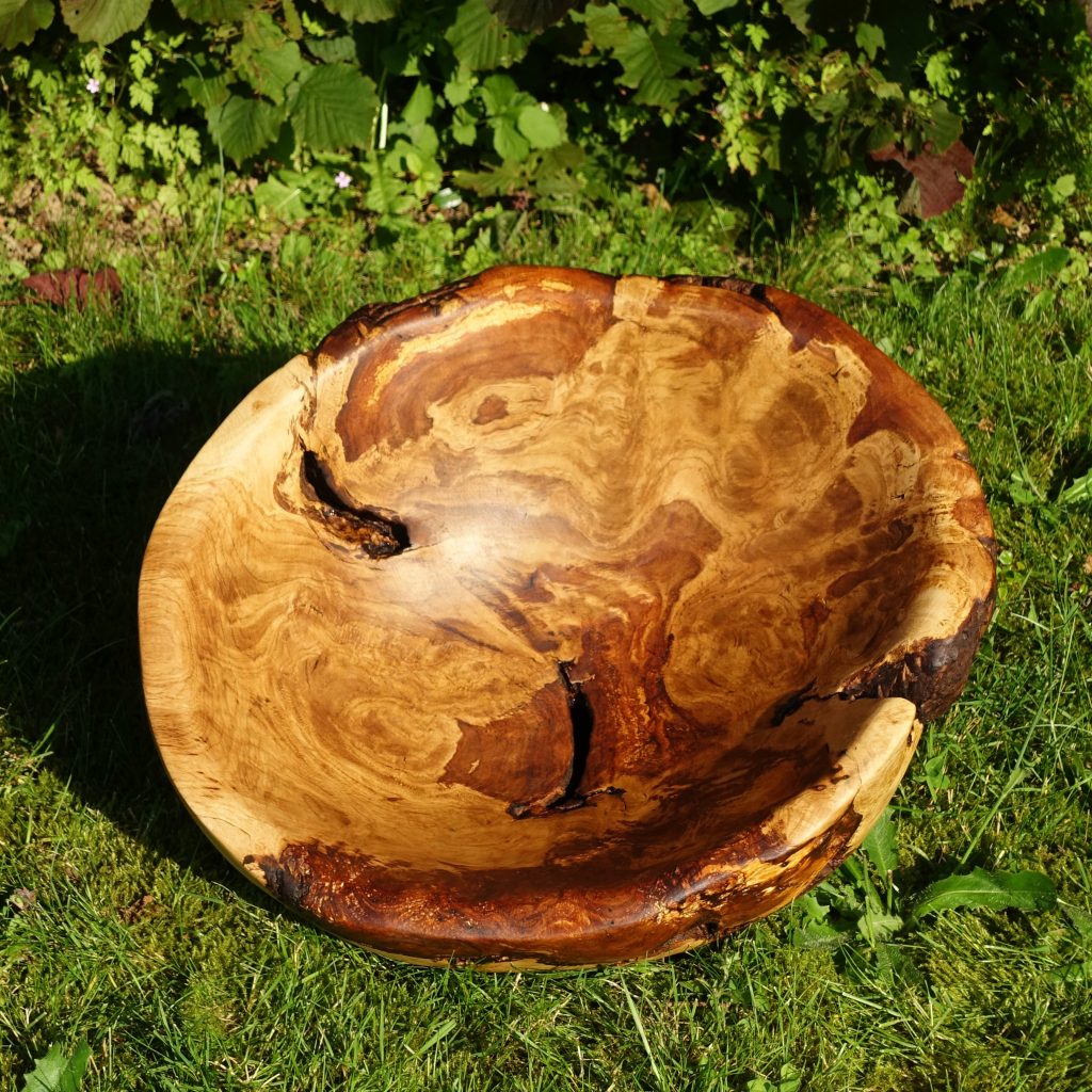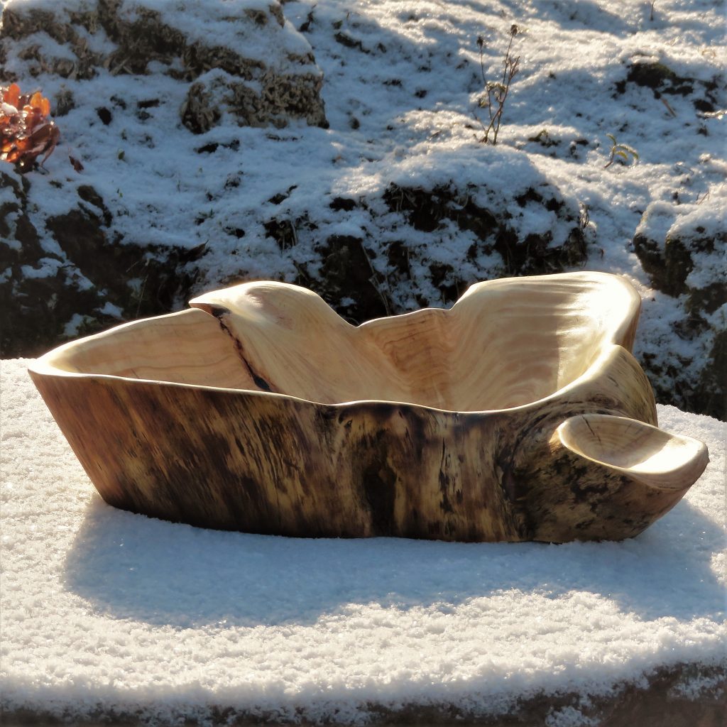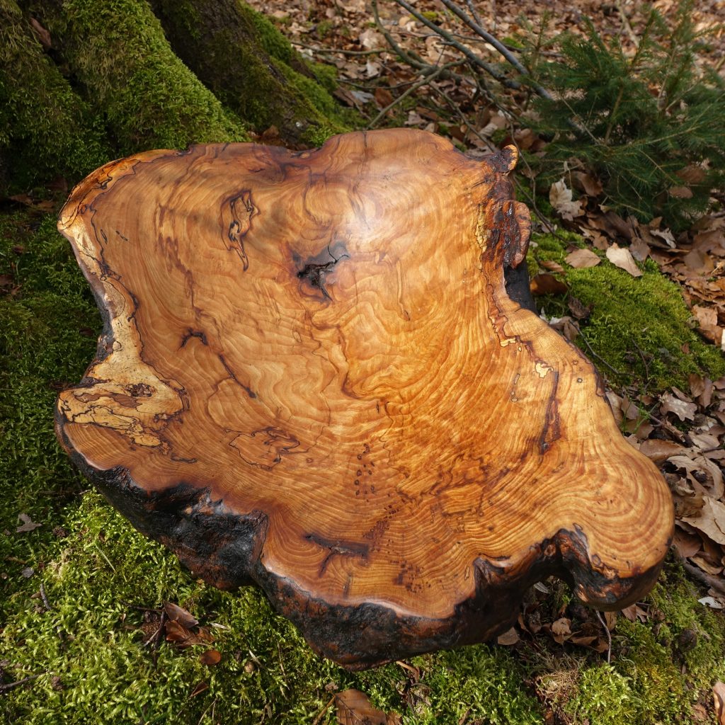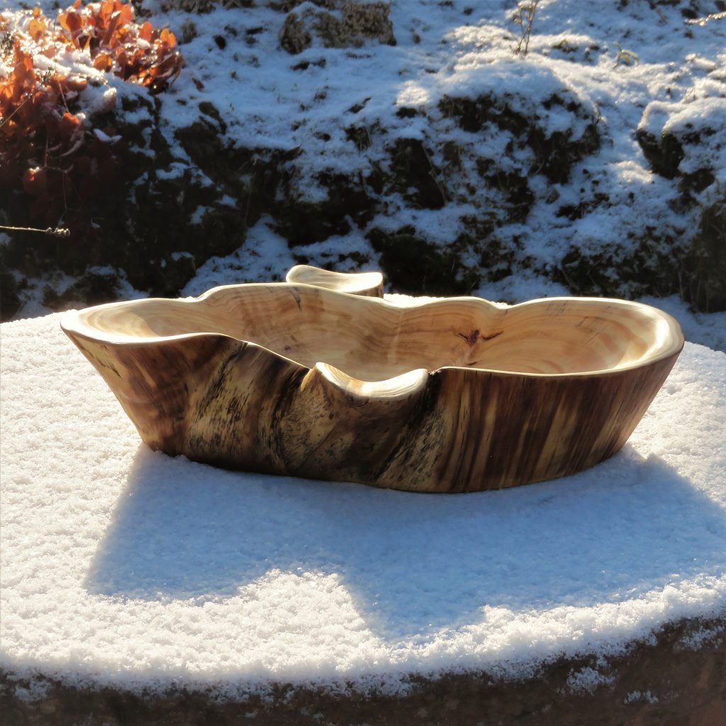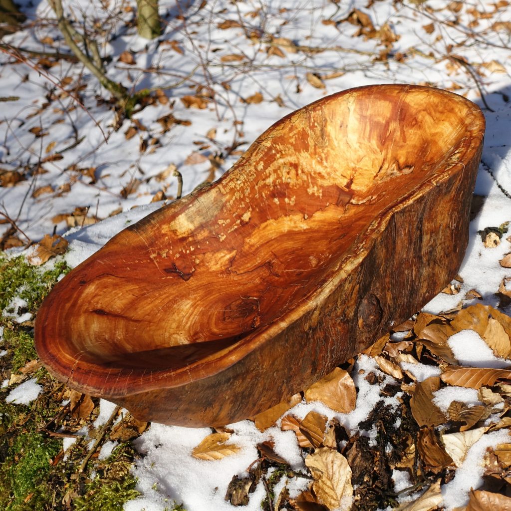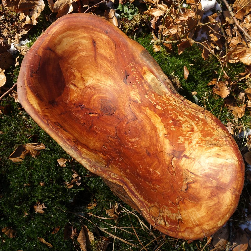 Die große Schale ist aus einer „Marmorbuche“ entstanden, also einem – in diesem Fall hohlen – Buchenstamm, in den die beginnende Verwitterung bereits schöne Muster gezeichnet hat, ohne das Holz in seiner Substanz zu zerstören. Der Baumkrebs tut ein Übriges, um die bunte Marmorierung zu vollenden.