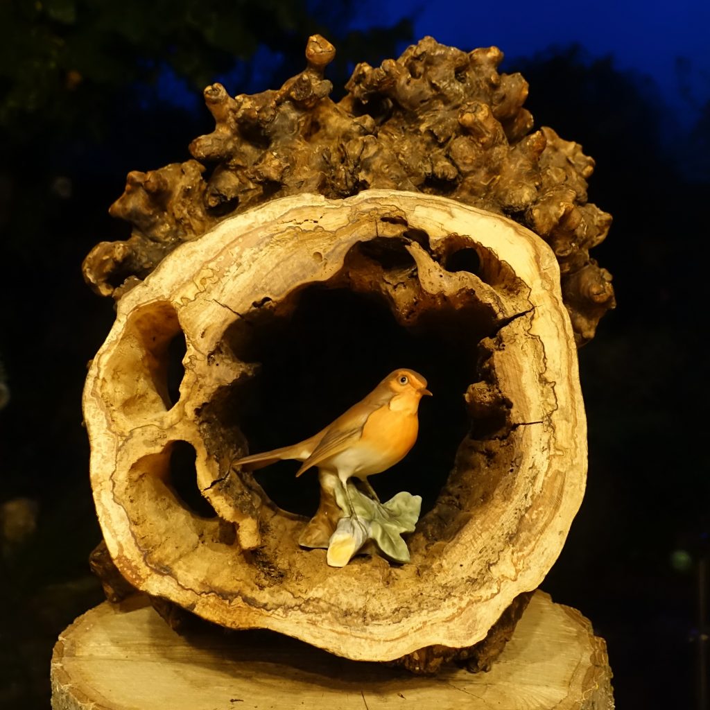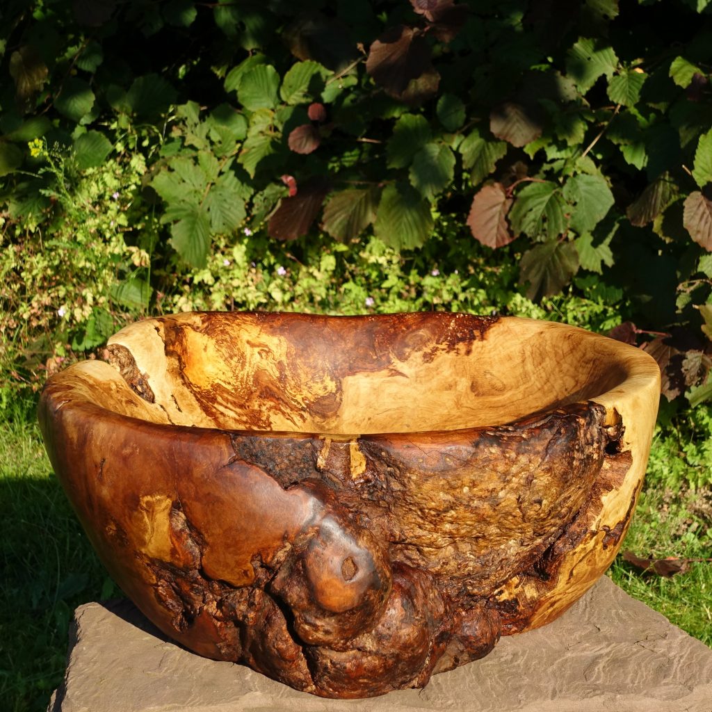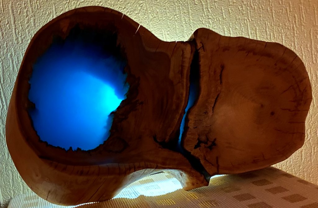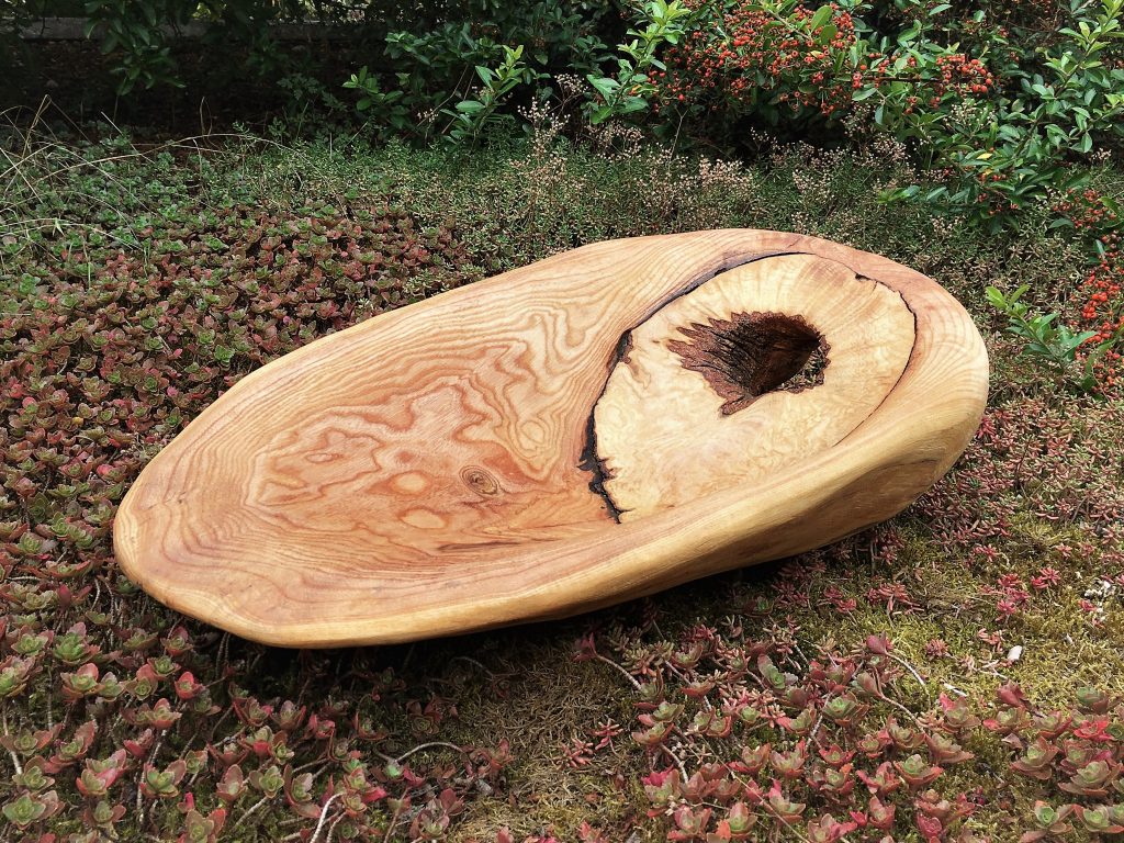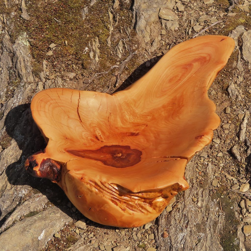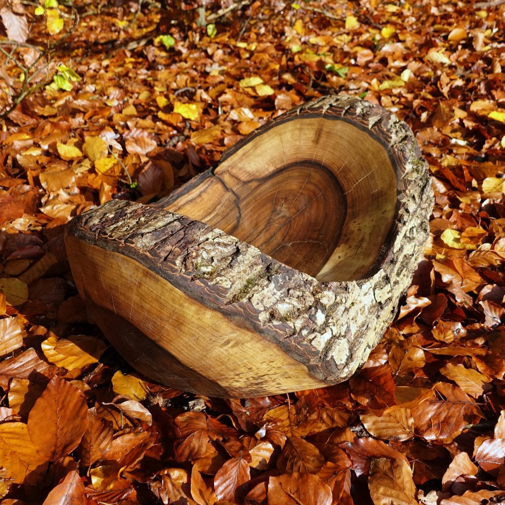 Die große Schale ist aus einer „Marmorbuche“ entstanden, also einem – in diesem Fall hohlen – Buchenstamm, in den die beginnende Verwitterung bereits schöne Muster gezeichnet hat, ohne das Holz in seiner Substanz zu zerstören. Der Baumkrebs tut ein Übriges, um die bunte Marmorierung zu vollenden.