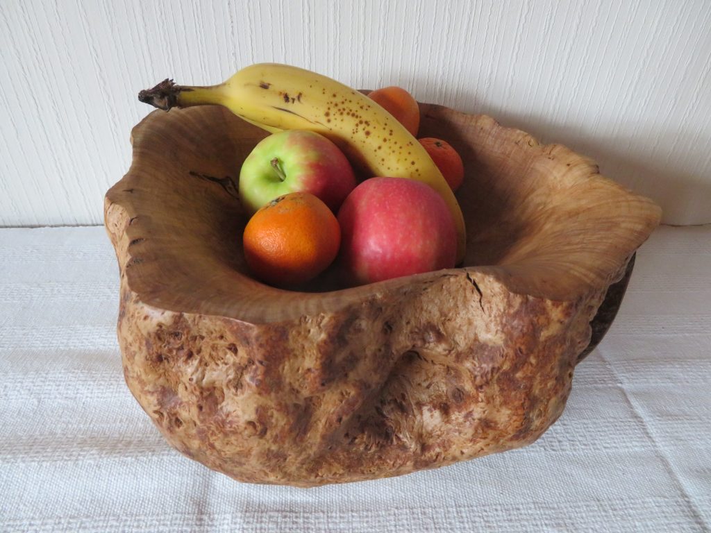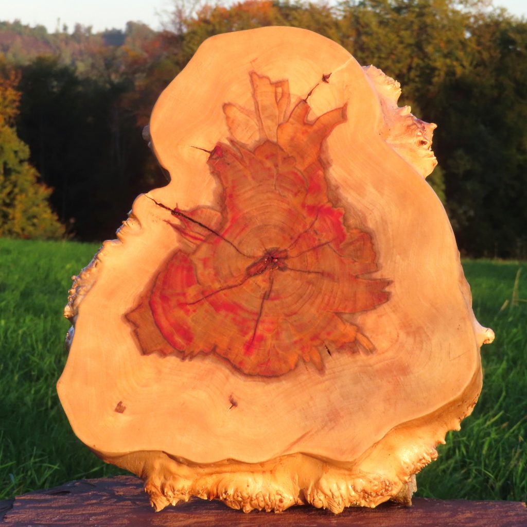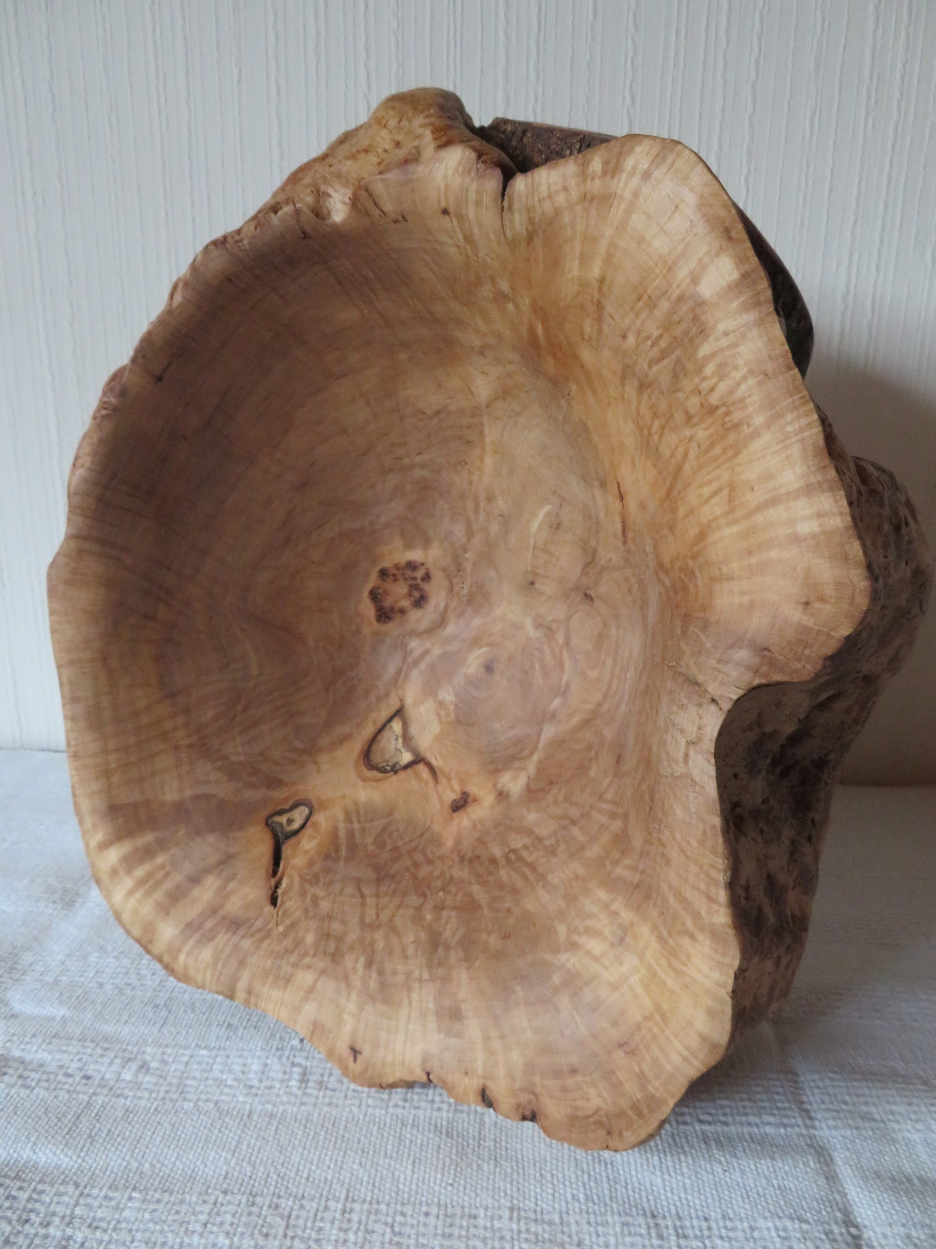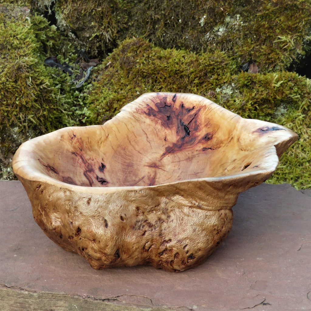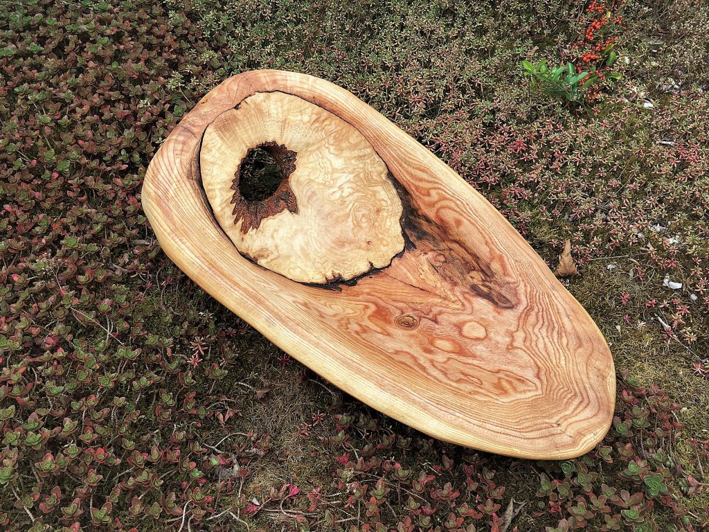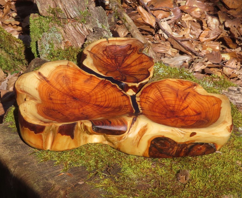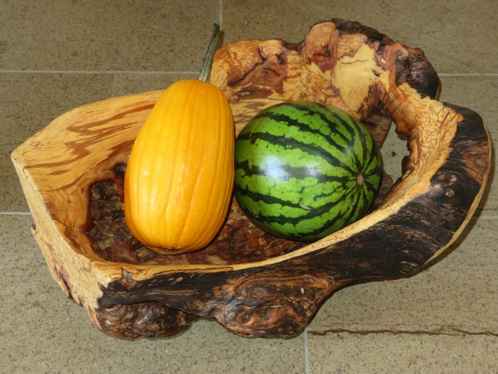 Die große Schale ist aus einer „Marmorbuche“ entstanden, also einem – in diesem Fall hohlen – Buchenstamm, in den die beginnende Verwitterung bereits schöne Muster gezeichnet hat, ohne das Holz in seiner Substanz zu zerstören. Der Baumkrebs tut ein Übriges, um die bunte Marmorierung zu vollenden.
