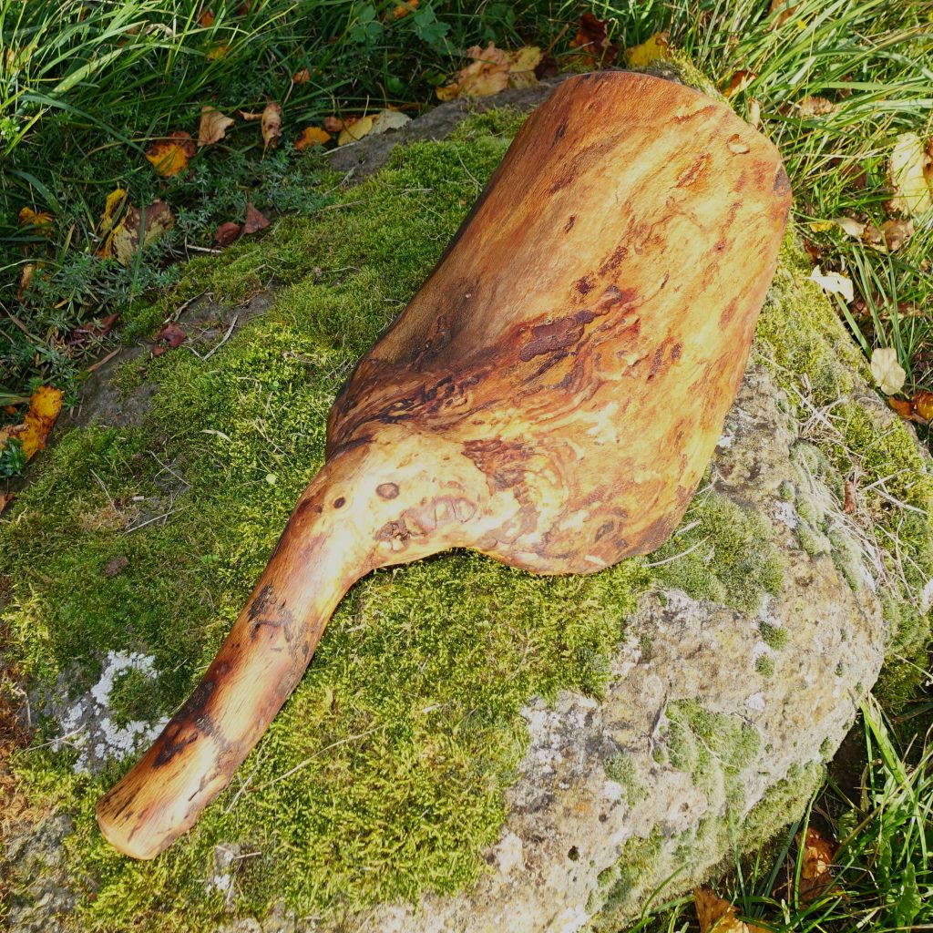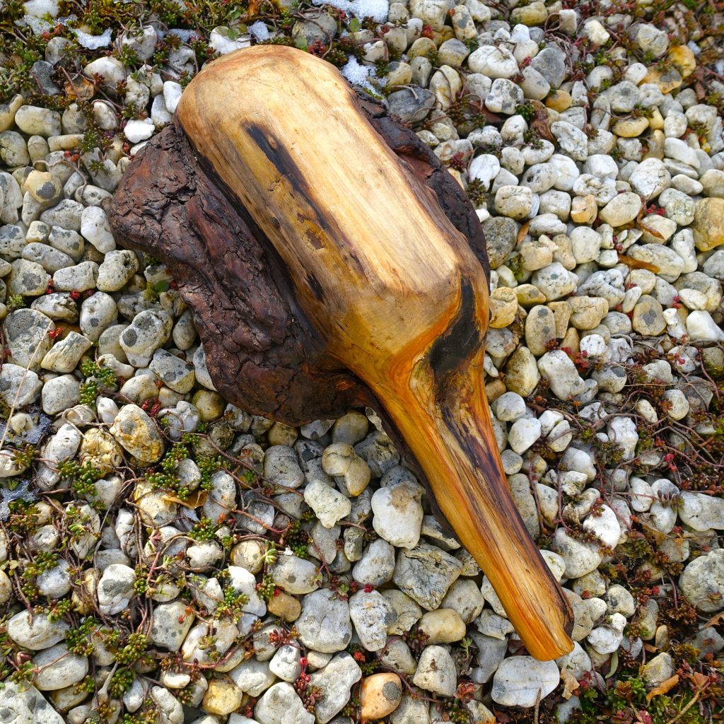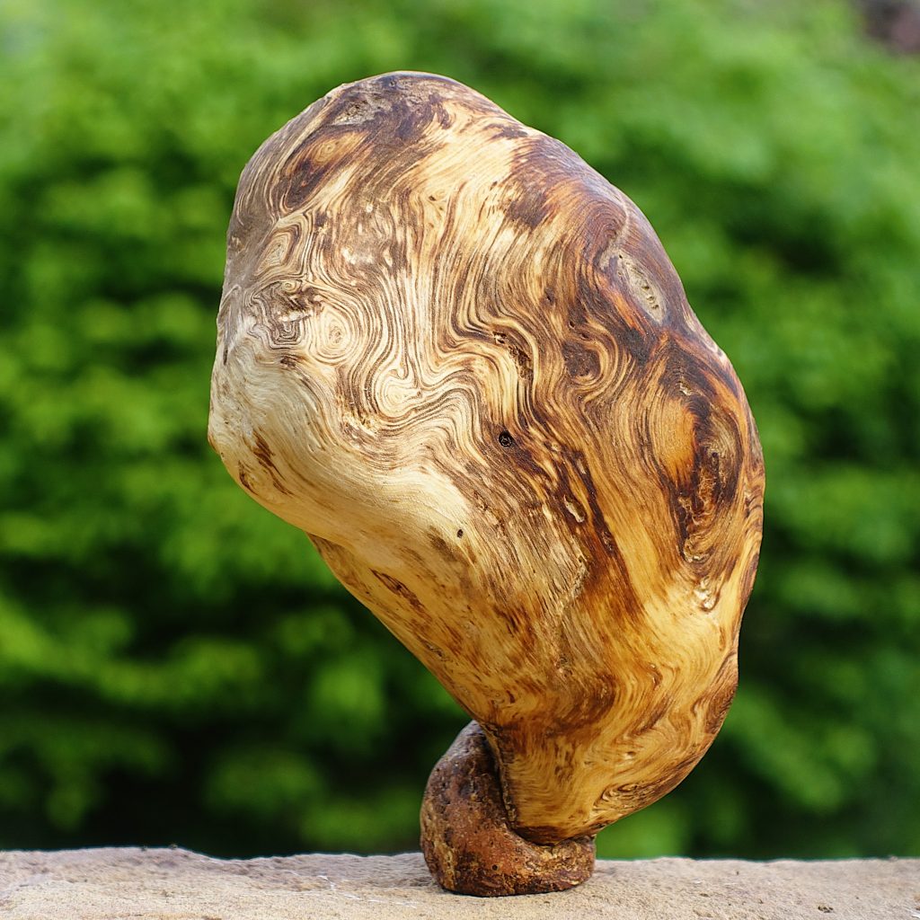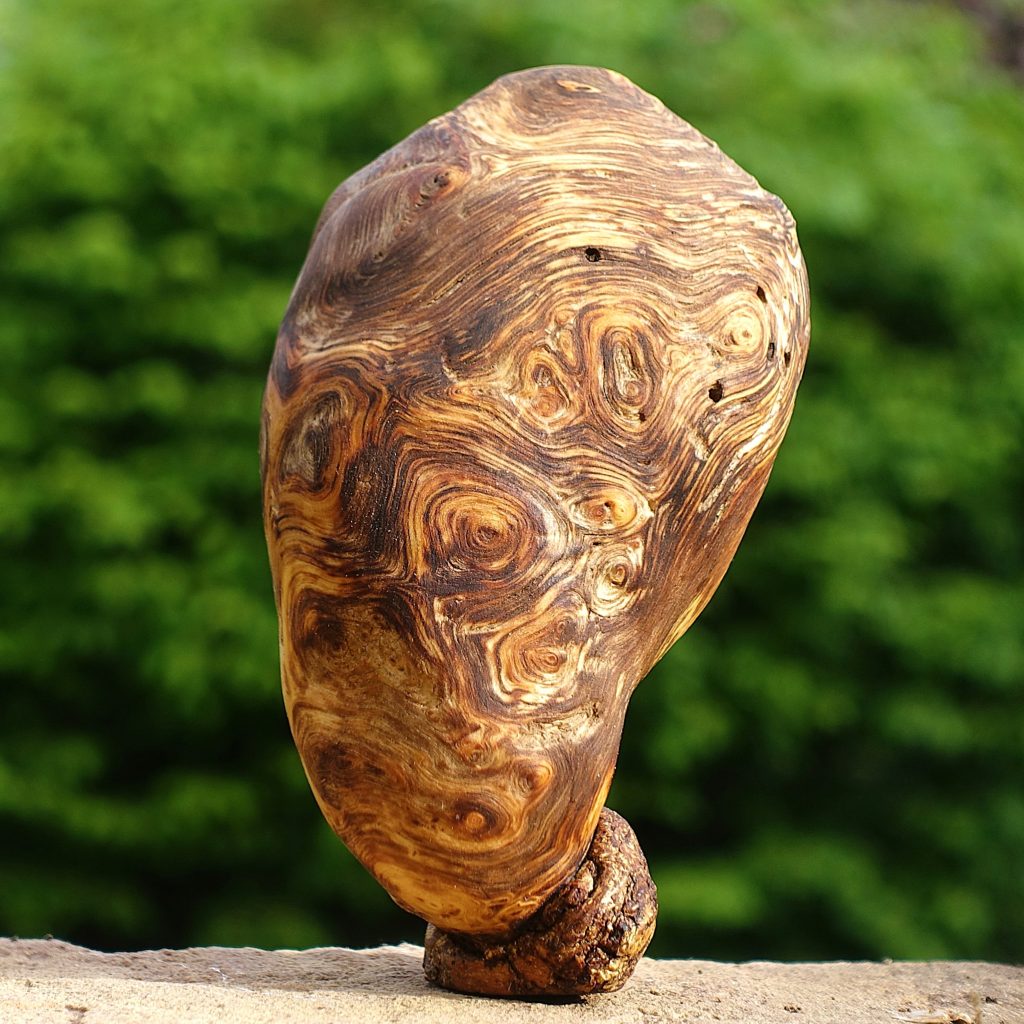 Die Holzart ist nicht eindeutig zu bestimmen, ich vermute ein Bruchstück von der Maserknolle einer Robinie.