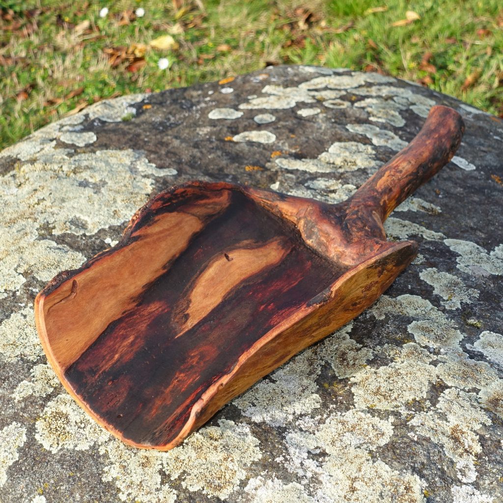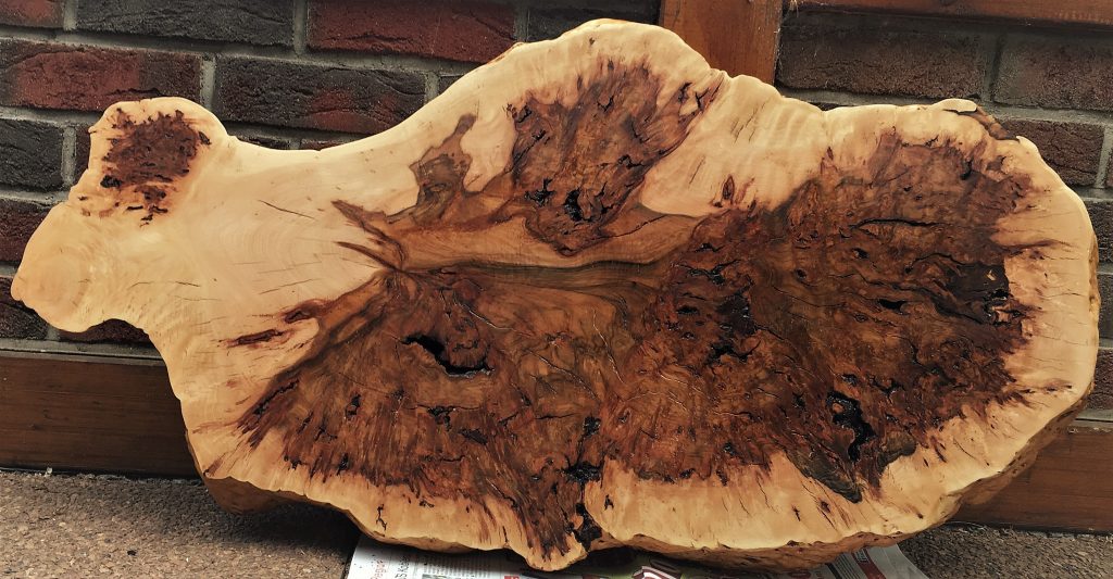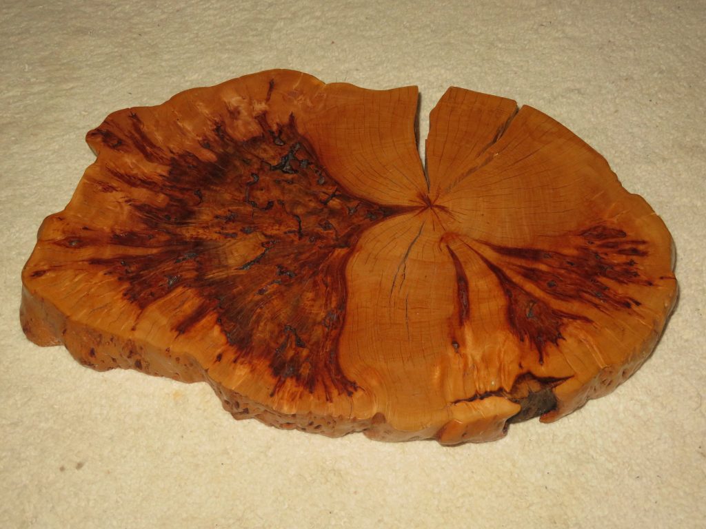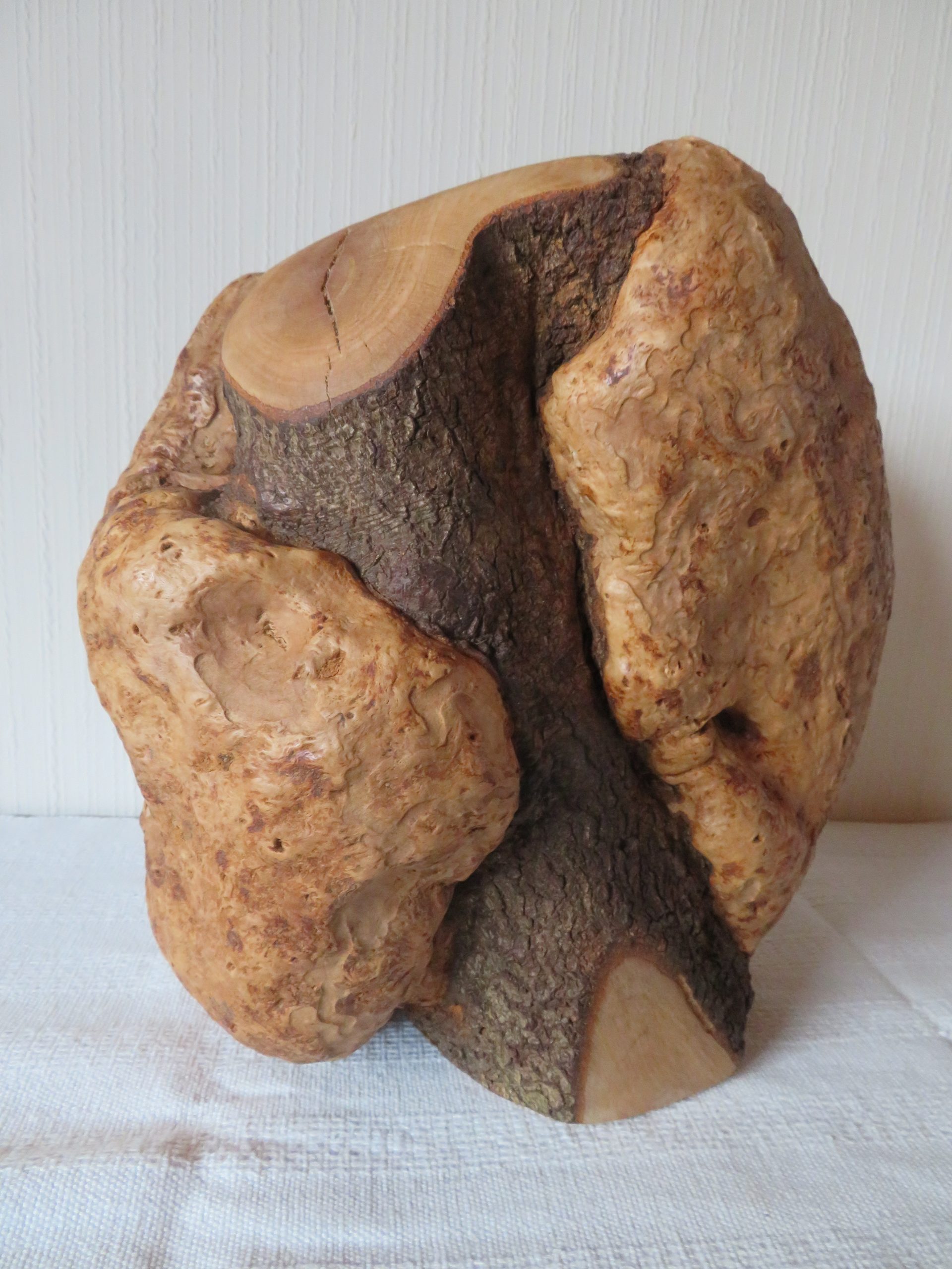 Die Holzart ist nicht eindeutig zu bestimmen, ich vermute ein Bruchstück von der Maserknolle einer Robinie.