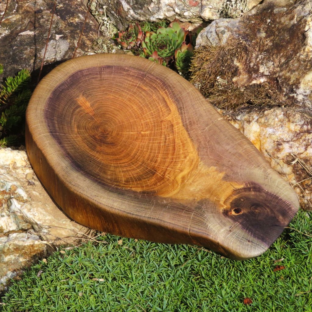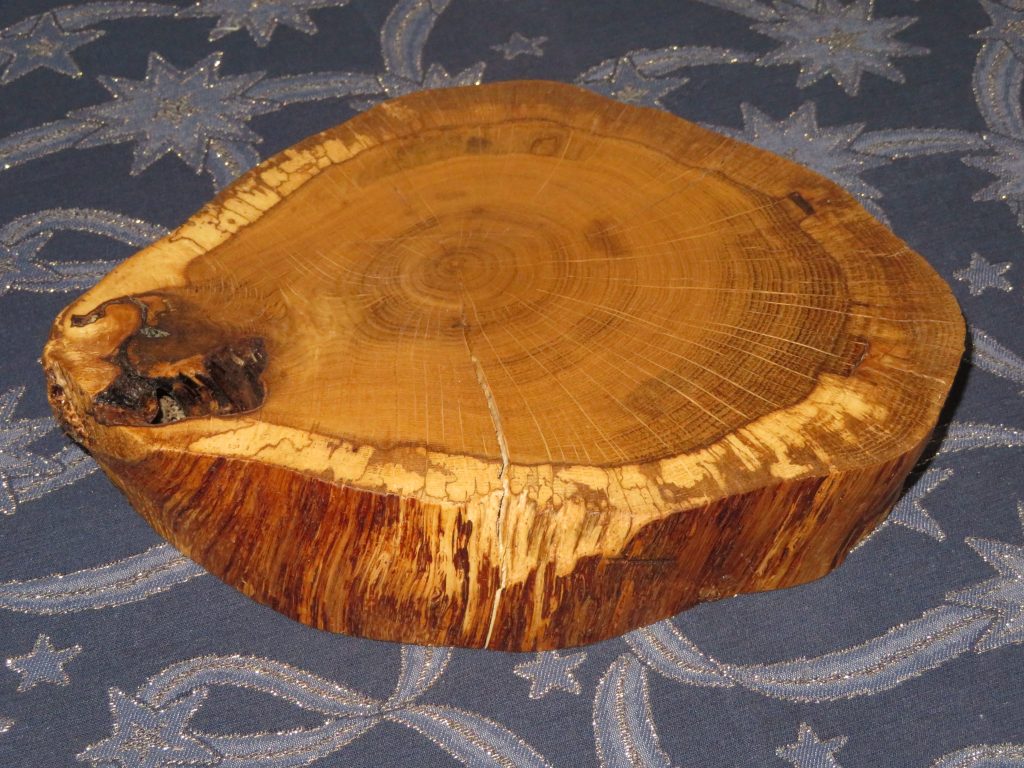 Die Scheibe stammt von einem alten, im Splintanteil bereits teilweise verwitterten Stamm, den ich zur Brennholzgewinnung erworben habe. Eichenholz ist in puncto Heizwert unübertroffen … und doch fast zu schade zum Verbrennen.
