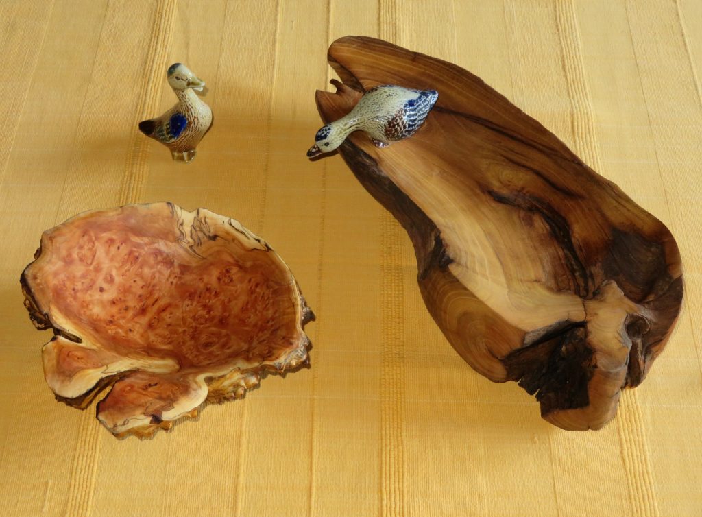 Nr. 31: Diese beiden sehr unterschiedlichen Schalen stammen von ein und derselben Baumart, der Robinie, auch Falsche Akazie genannt. Ausgangsmaterial war bei der rechten, 40 cm langen Schale ein Wurzelstück, bei der linken (größter Durchmesser 22 cm) ein Baumkrebsknoten, jeweils von umgestürzten Bäumen entnommen.