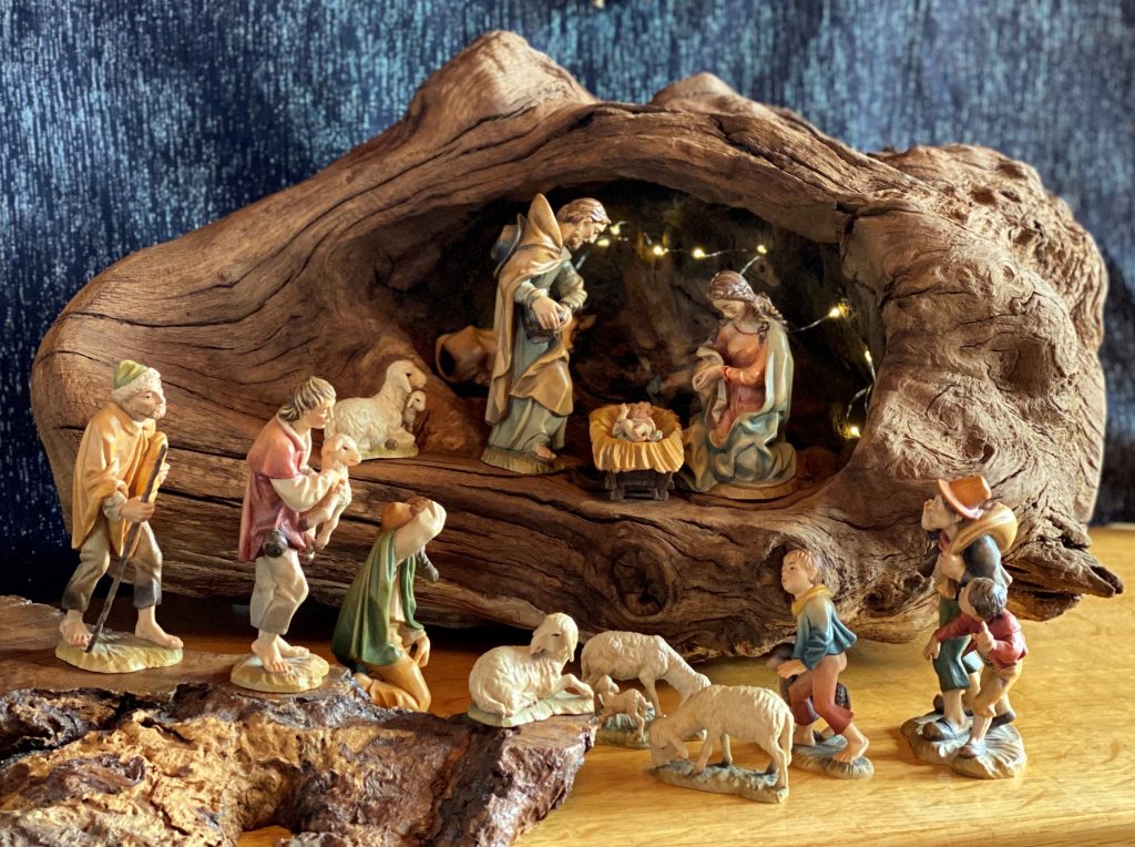 Eichenwurzel als Unterkunft für die heilige Familie. Die von Natur aus hohle Wurzel, 52 cm breit und 30 cm hoch, habe ich lediglich innen ein wenig geglättet, damit die Figuren sicher stehen, und anschließend gewachst.