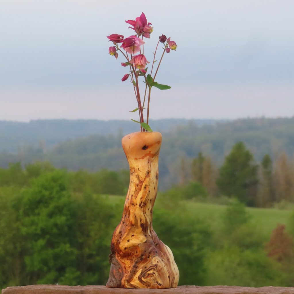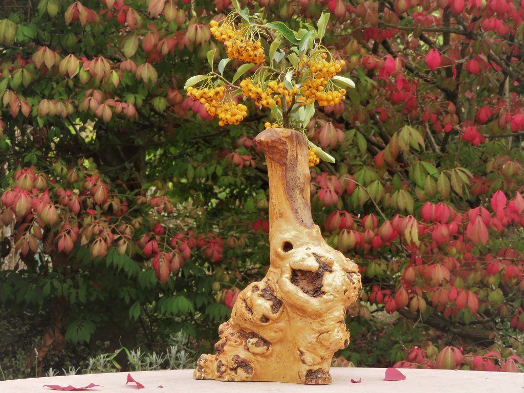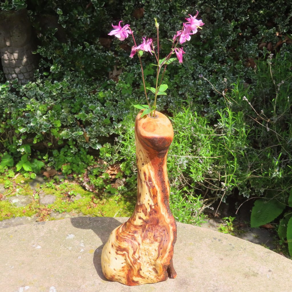 Vase aus einem besonderen Ast einer Rotbuche mit markanten Wucherungen und einem abgestorbenen Teil mit schön marmoriertem Stockbucheneffekt, Höhe 28 cm