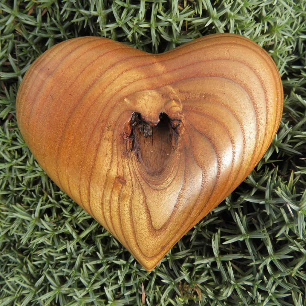 Das hölzerne Herz auf dem Foto, Durchmesser 9 cm, habe ich aus einem alten, umgestürzten Essigbaum gefertigt. Interessant ist der – von der Natur gestaltete – Hohlraum in der Mitte, der in seiner Form dem Innern des menschlichen Herzens ziemlich nahe kommt.