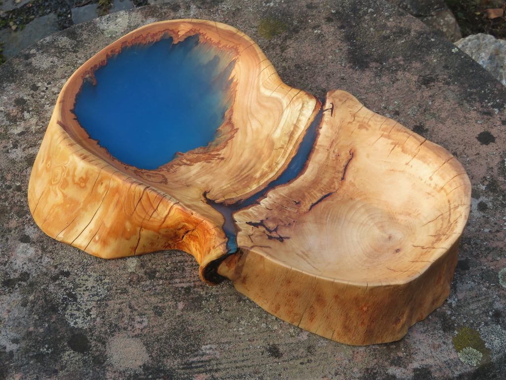 Schale aus zwei Baumarten, Rotbuche und hohler Kirschbaum, komplettiert mit Epoxidharz.