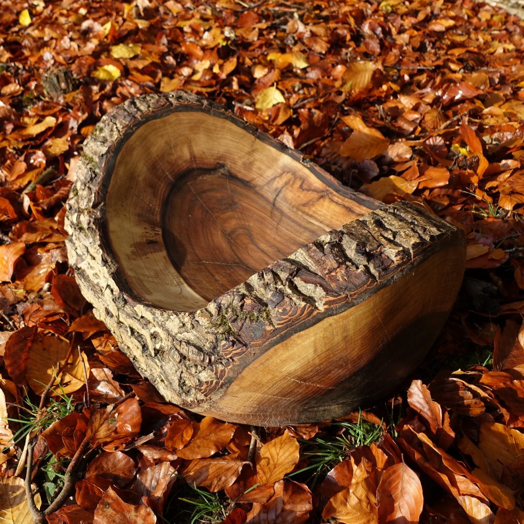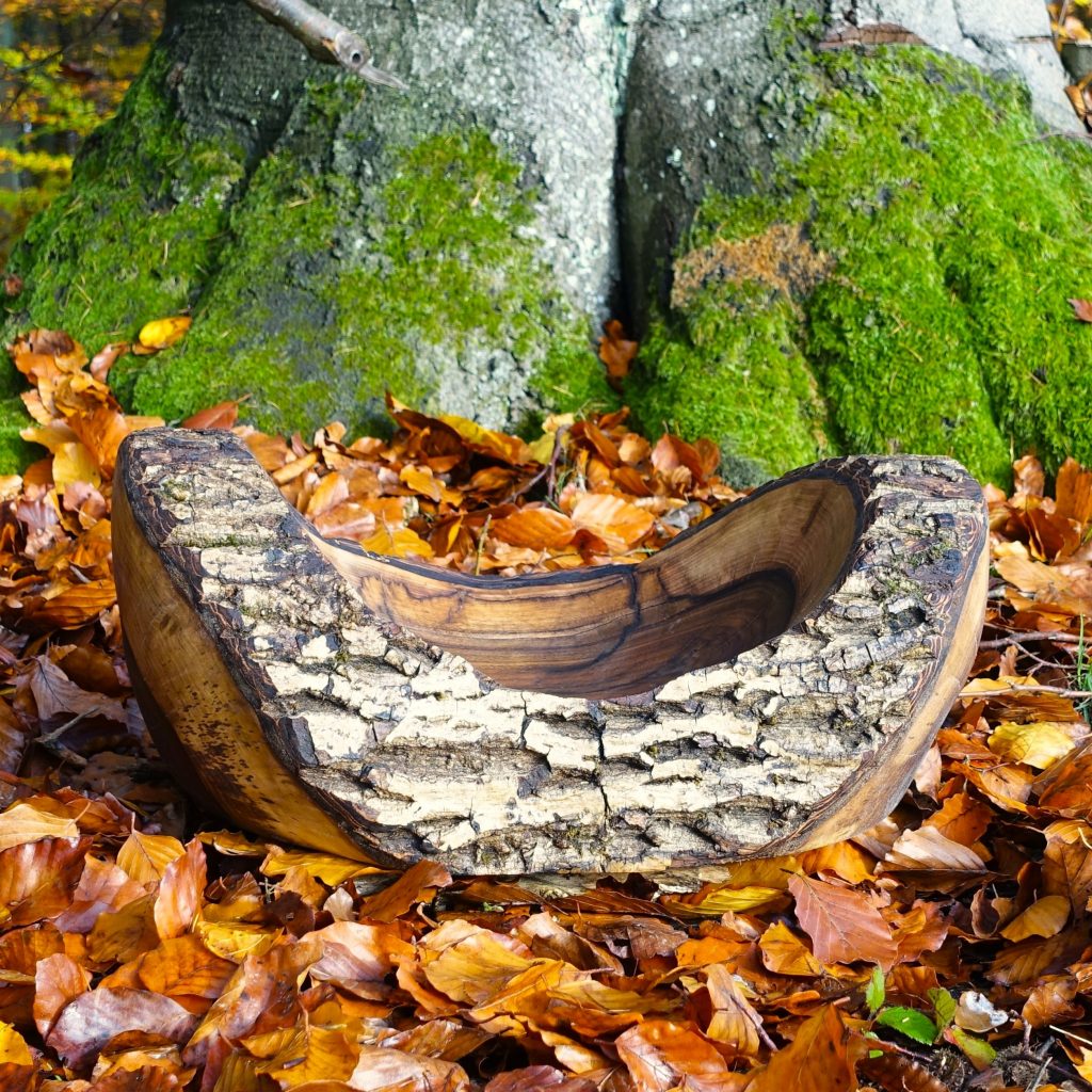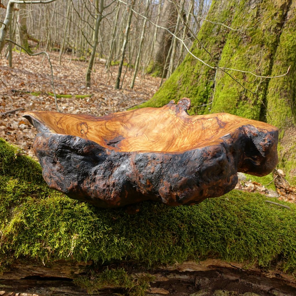 Das Äußere der Schale blieb unbearbeitet und zeigt die ursprüngliche Holzstruktur des alten Baumes.