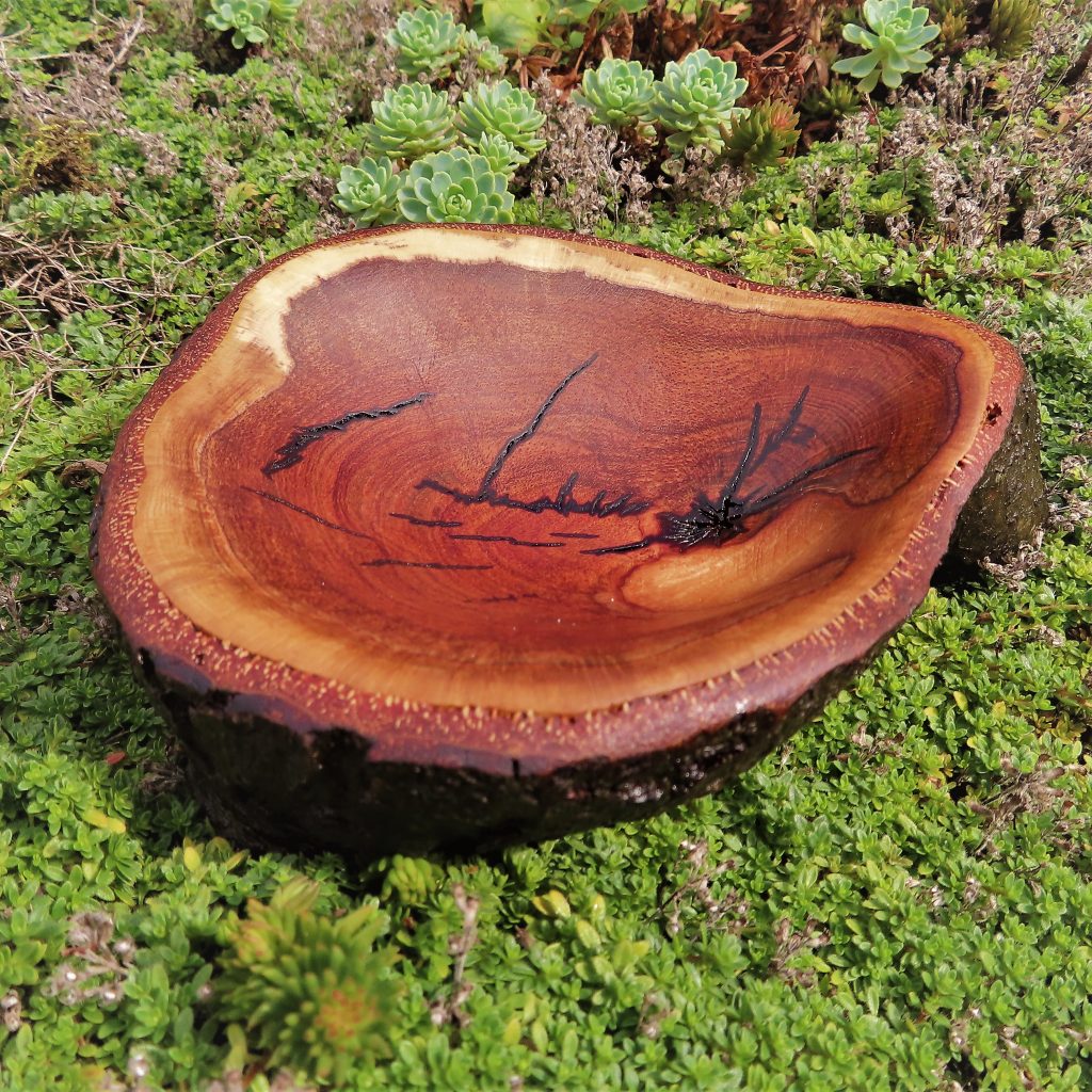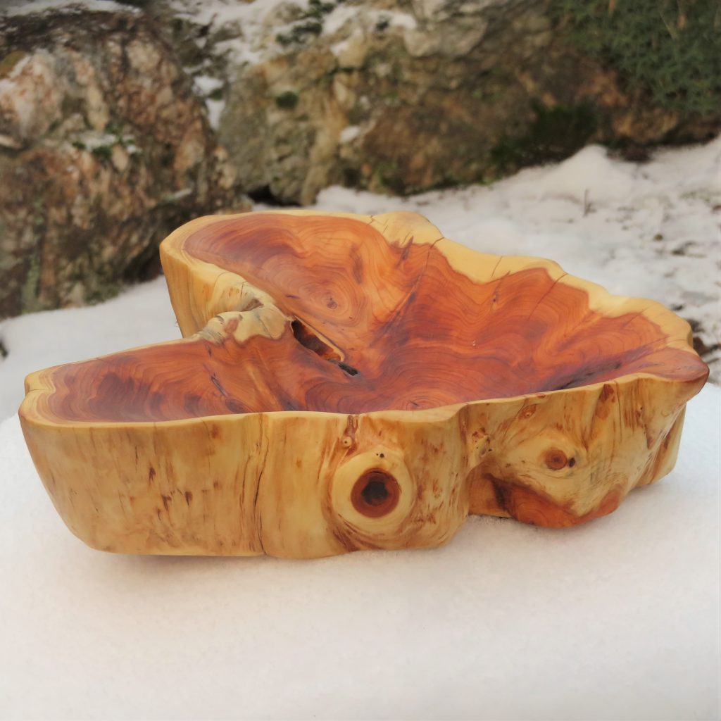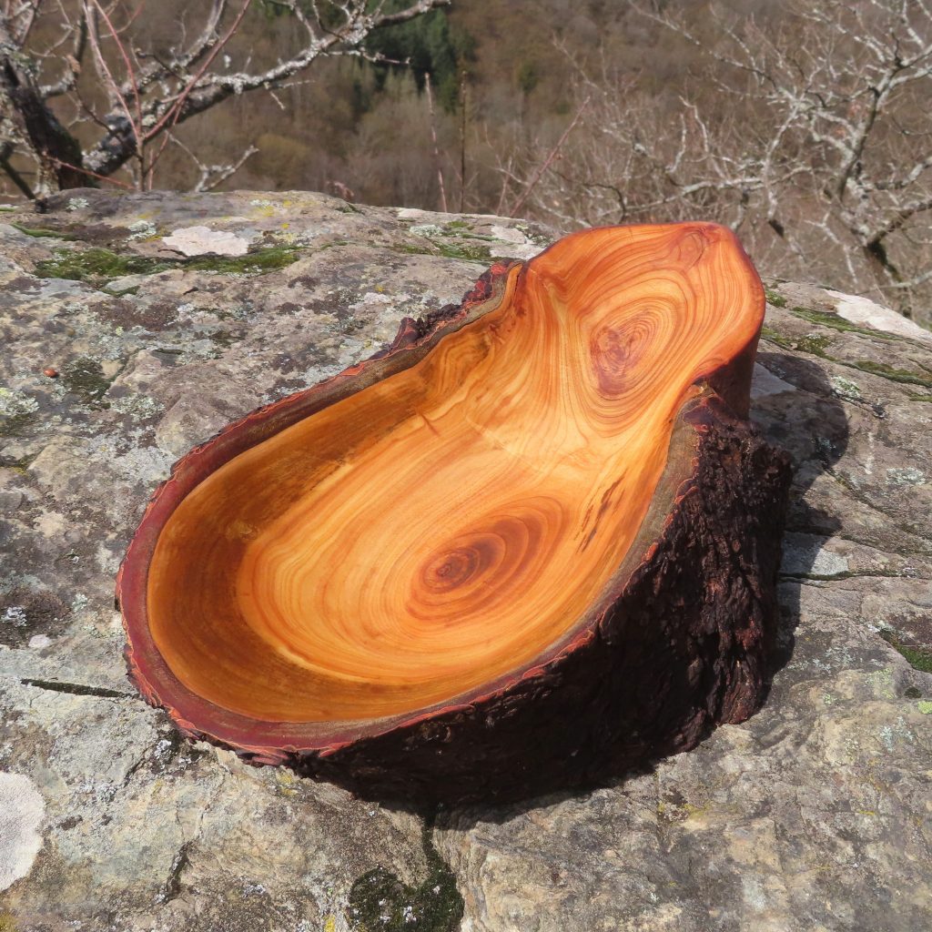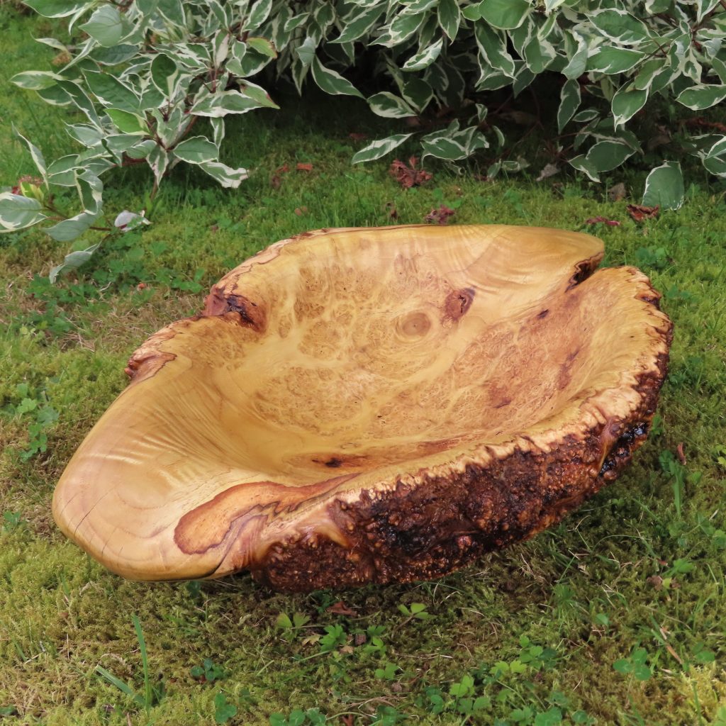 Das Äußere der Schale blieb unbearbeitet und zeigt die ursprüngliche Holzstruktur des alten Baumes.