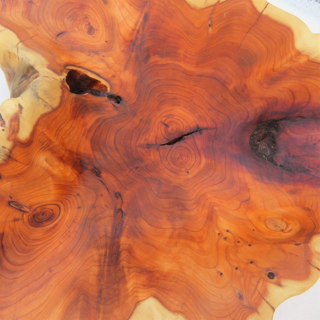 Das Schleifen des Holzes förderte eine schöne warme Färbung und eine lebhafte Marmorierung zutage, was durch die abschließende Behandlung mit Öl – natürlich lebensmittelecht – noch verstärkt wurde.
