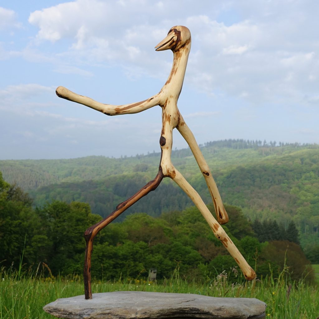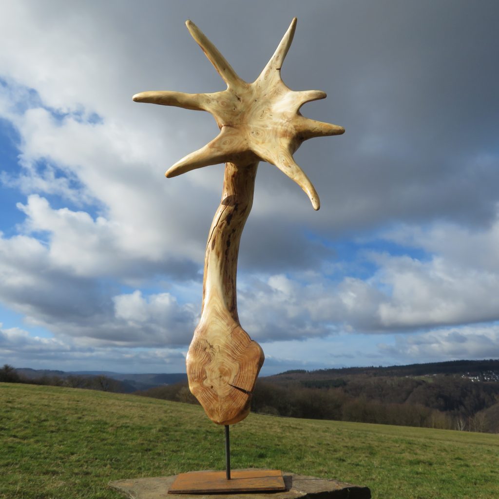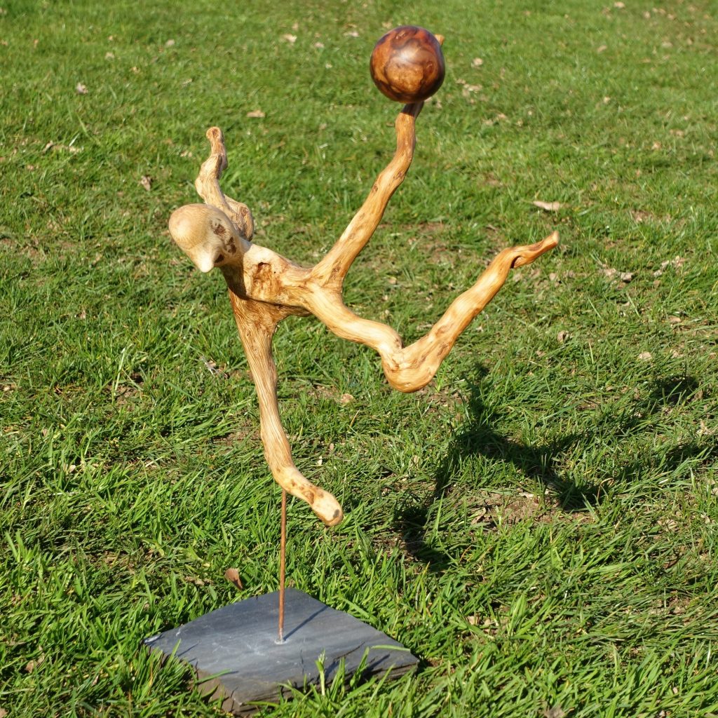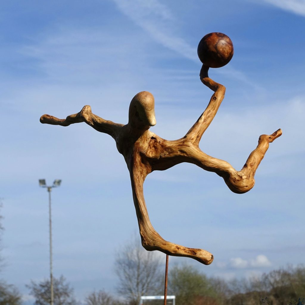 Der Name Klaus Fischer ist nicht nur für ältere Fußballfreunde wie mich ein Begriff und geradezu untrennbar verbunden mit einer besonders spektakulären Art, Tore zu erzielen, dem Fallrückzieher. Die Wurzelgestalt, die ich in der Nähe von Hübingen/Westerwald an einer umgestürzten Eiche gefunden habe (siehe drittes Foto), bildet eine solche Szene (fast) naturgetreu nach. Den Ball habe ich aus meinem kleinen Baumperlen-Fundus entnommen und mit dem Winkelschleifer in eine einigermaßen runde Form gebracht.