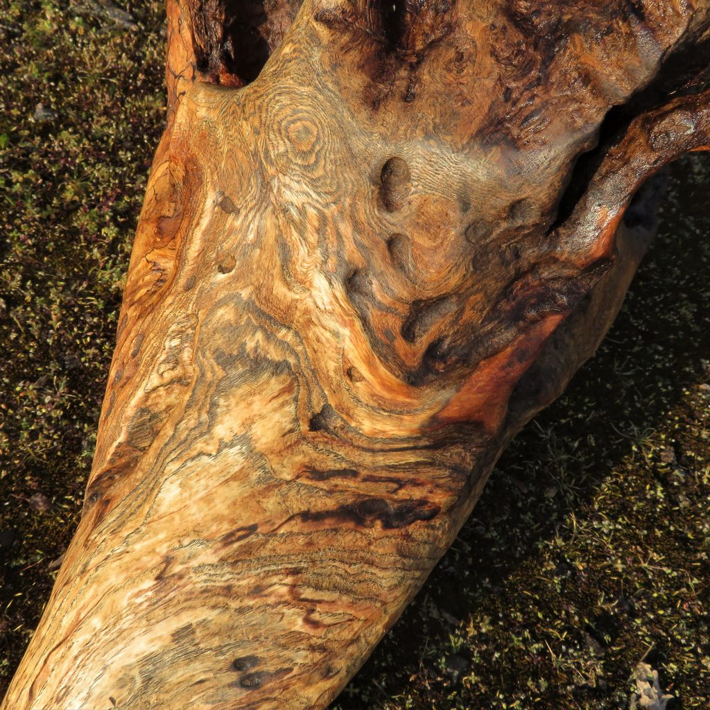 Im ausgehöhlten Inneren sieht man ein buntes Muster aus ursprünglicher Holzmaserung, helleren Arealen als Ausdruck einer beginnenden Verwitterung und feinen schwarzen Linien, die Schlauchpilze in das Holz gezeichnet haben. Nach Trocknung und Durcherhitzung sind alle Zersetzungsprozesse gestoppt, das Holz ist intakt und unbegrenzt haltbar.
