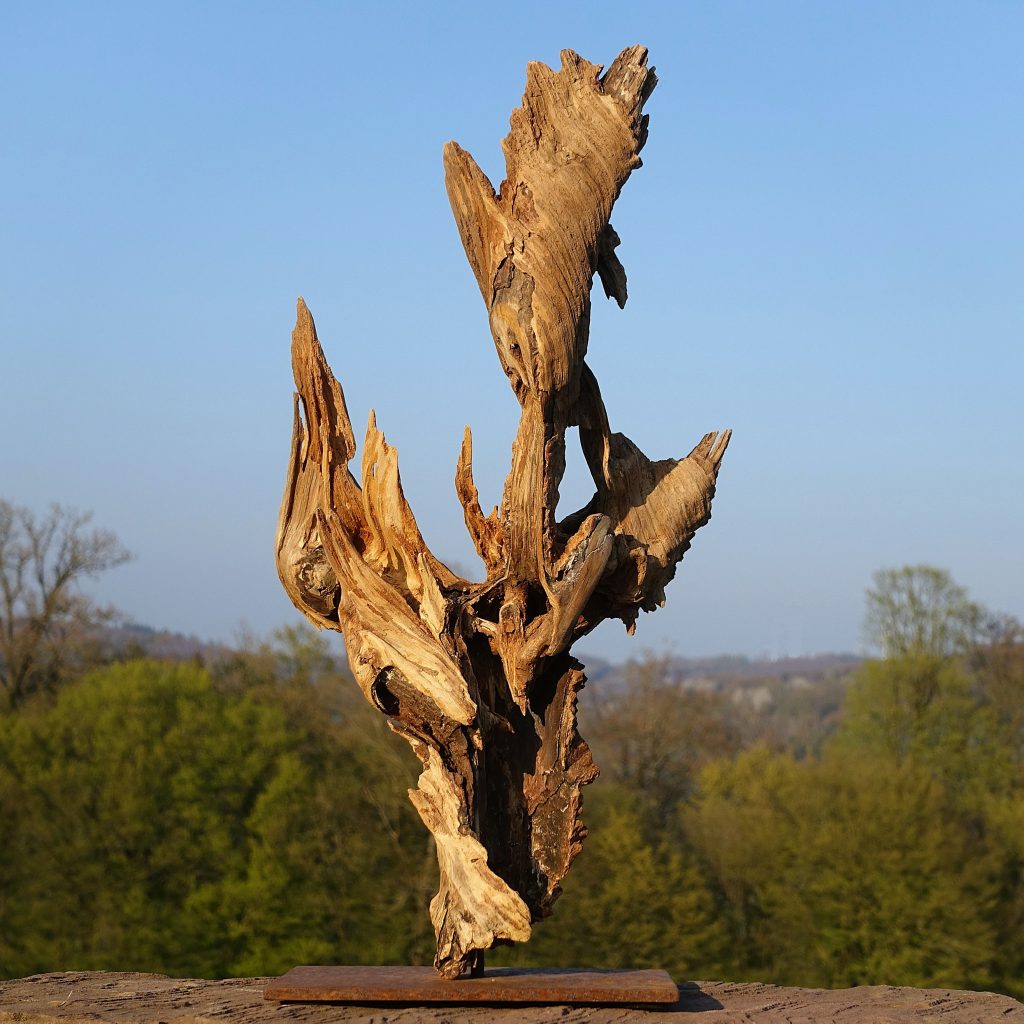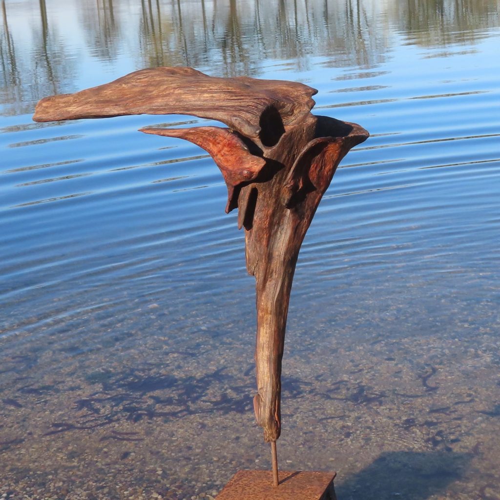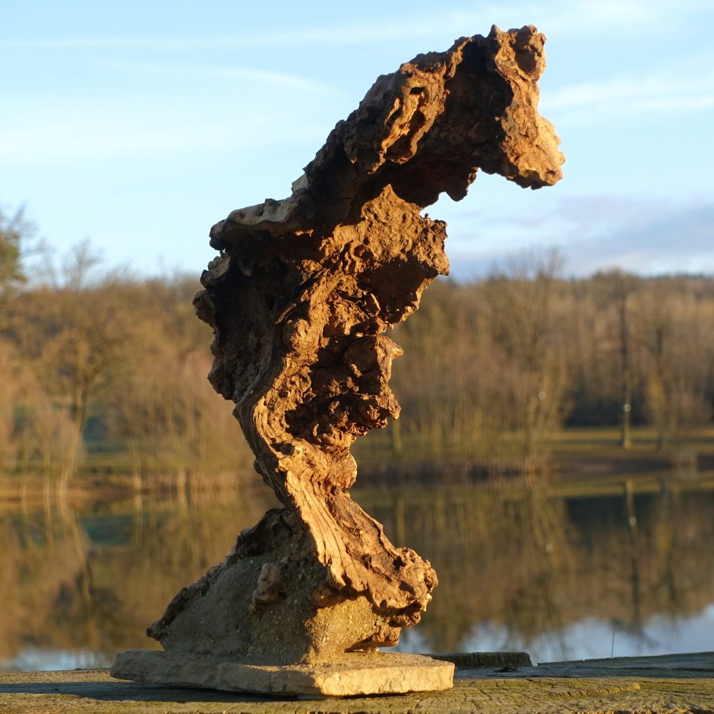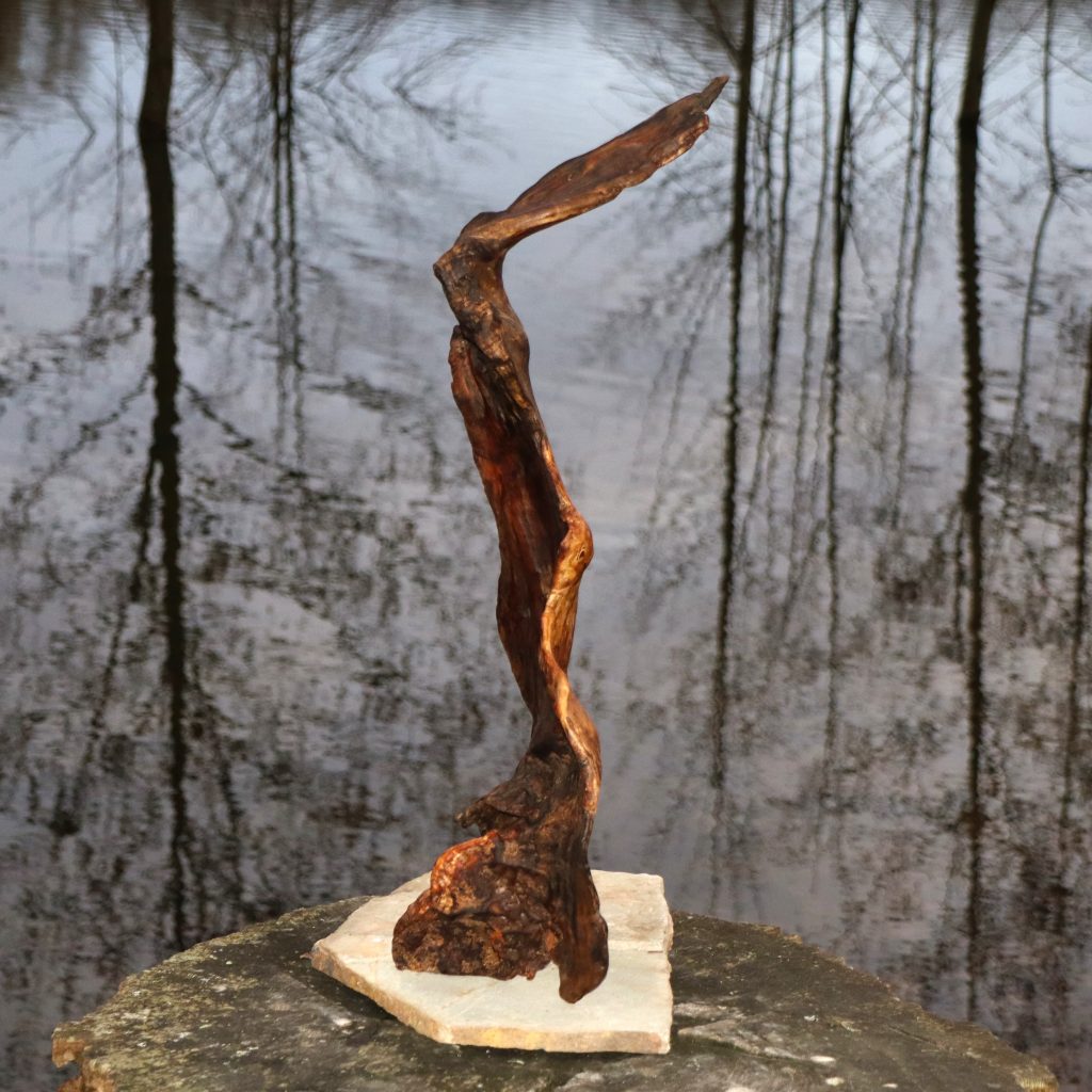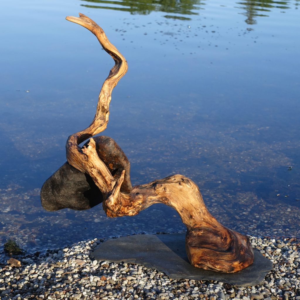 Naturskulptur „Wandel“, Treibholz auf Quarzsockel, Höhe 30 cm.