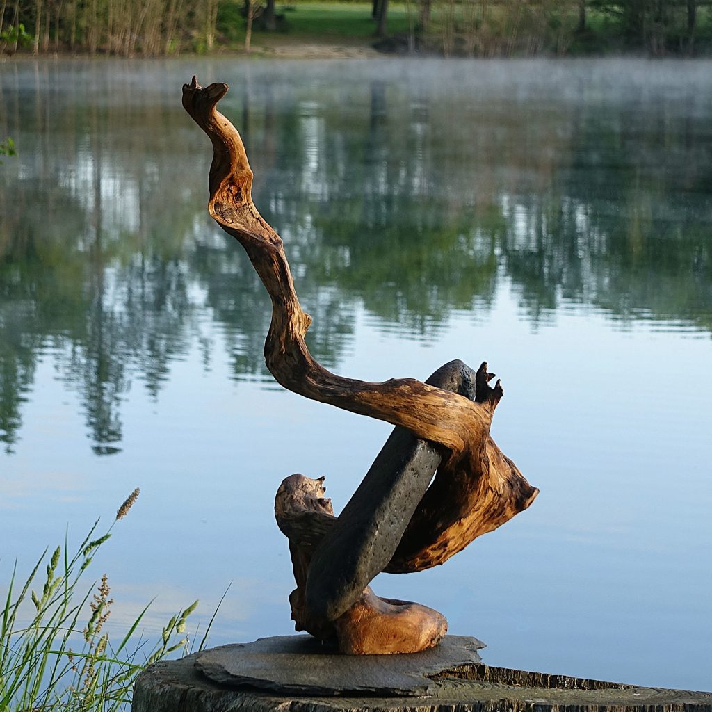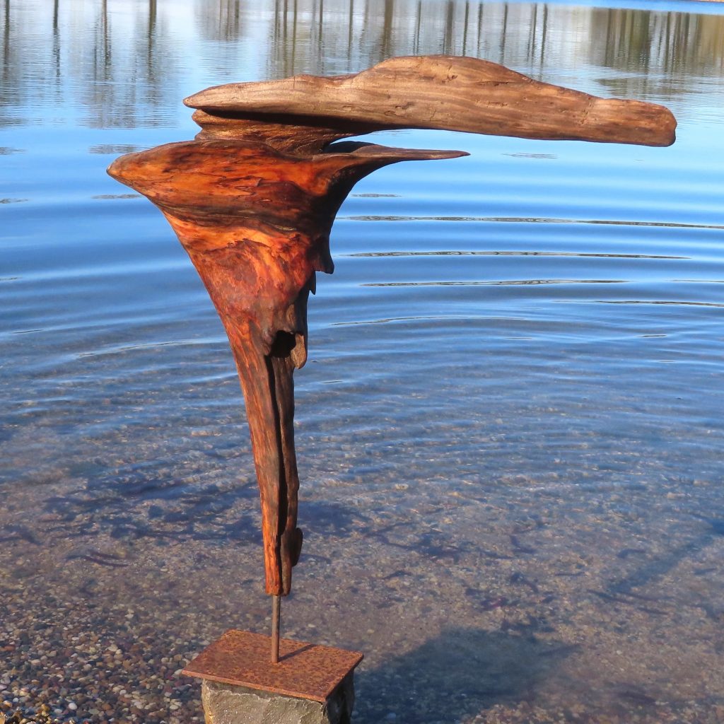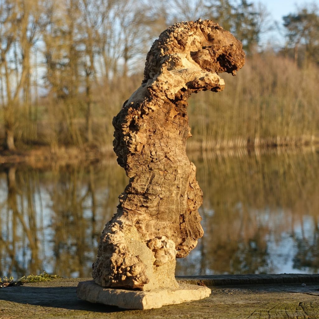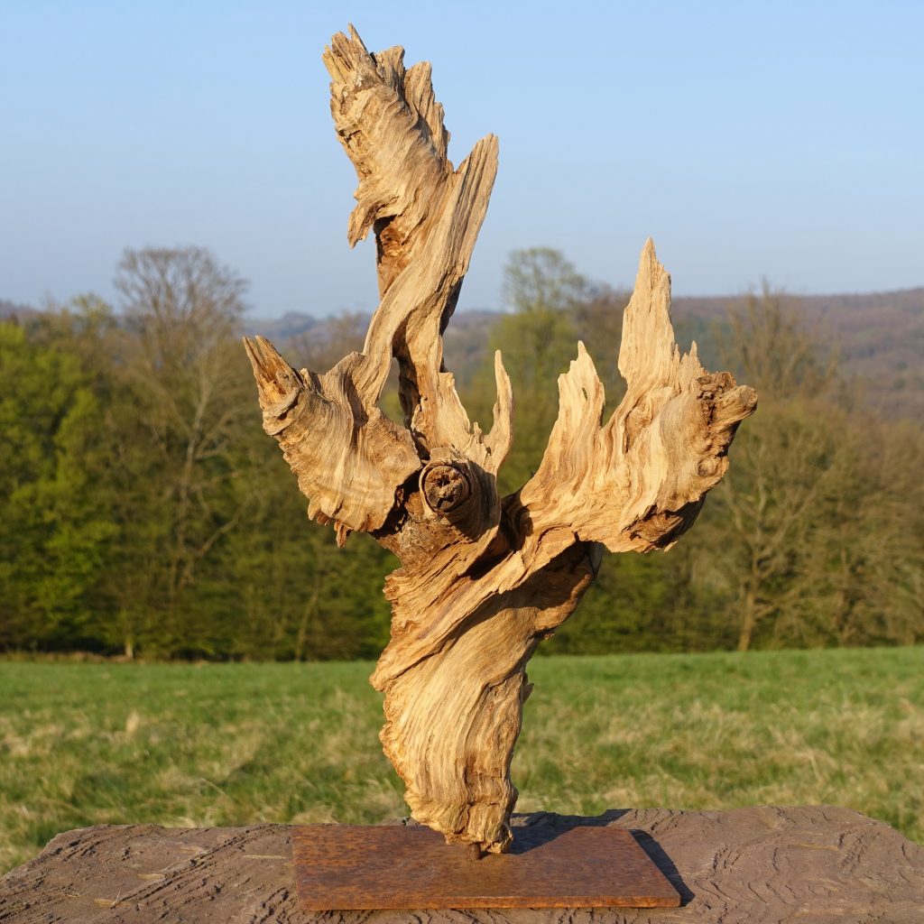 Naturskulptur „Wandel“, Treibholz auf Quarzsockel, Höhe 30 cm.