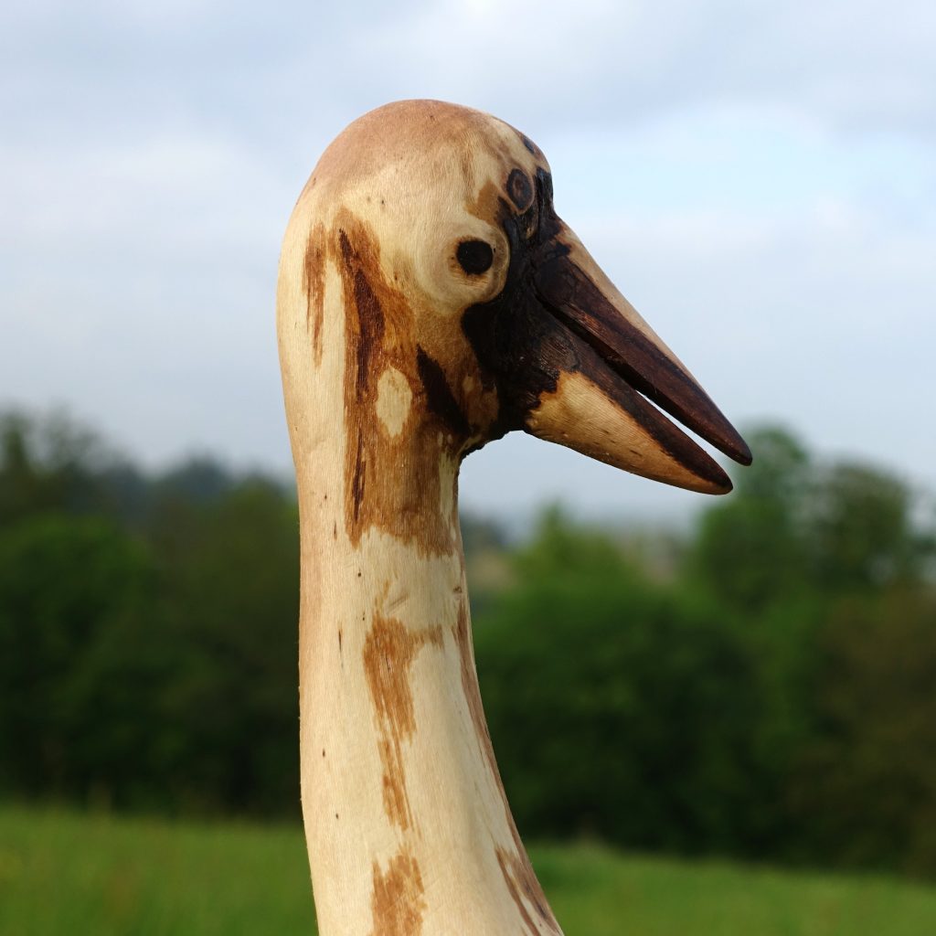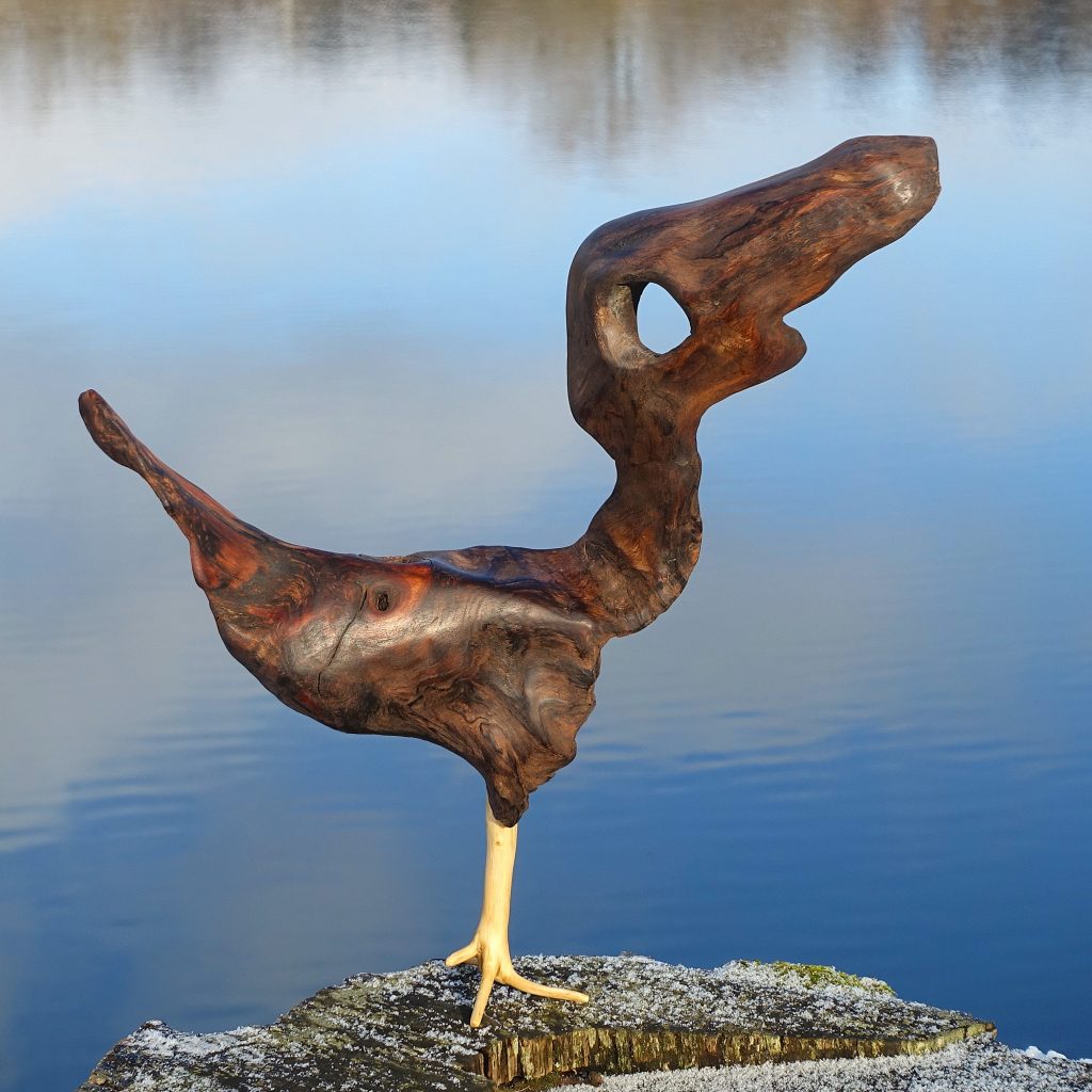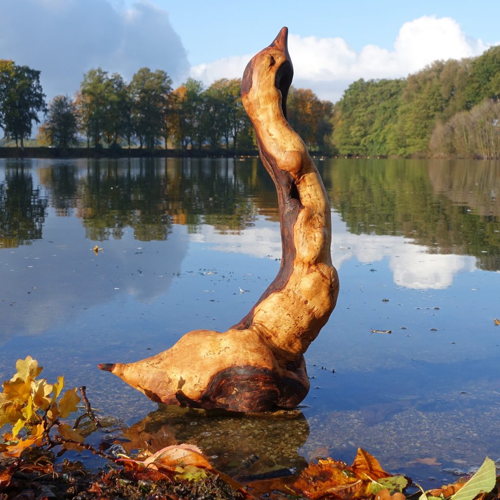 Naturskulptur „Singschwan“, Rotbuchenwurzel, Höhe 50 cm.