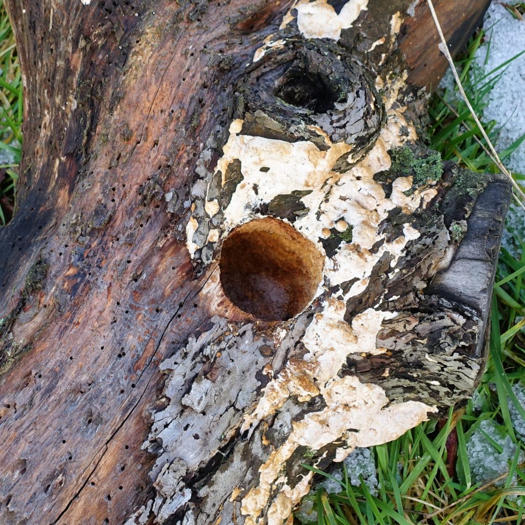 Naturkunst- und Naturkundeobjekt: Spechthöhle aus einem umgestürzten Apfelbaum.