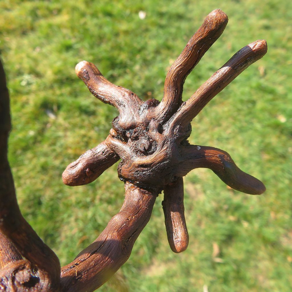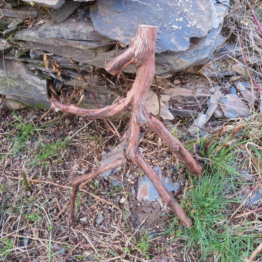 Auf dem vierten Foto sieht man das Ausgangsmaterial nach grobem Zuschnitt mit meiner Klappsäge, die ich immer dabeihabe. Den ausrangierten Rebstock fand ich auf einem Grünschnittlager mitten in den Weinbergen von Traben-Trarbach.