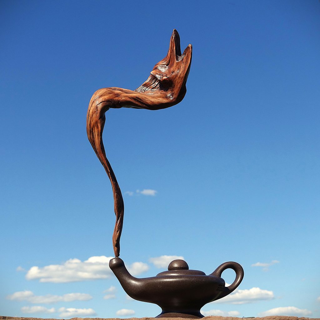 Naturskulptur „Dschinn, der Geist aus der Lampe“, Treibholz, auf Keramik-Öllampe montiert, Gesamthöhe 37 cm.