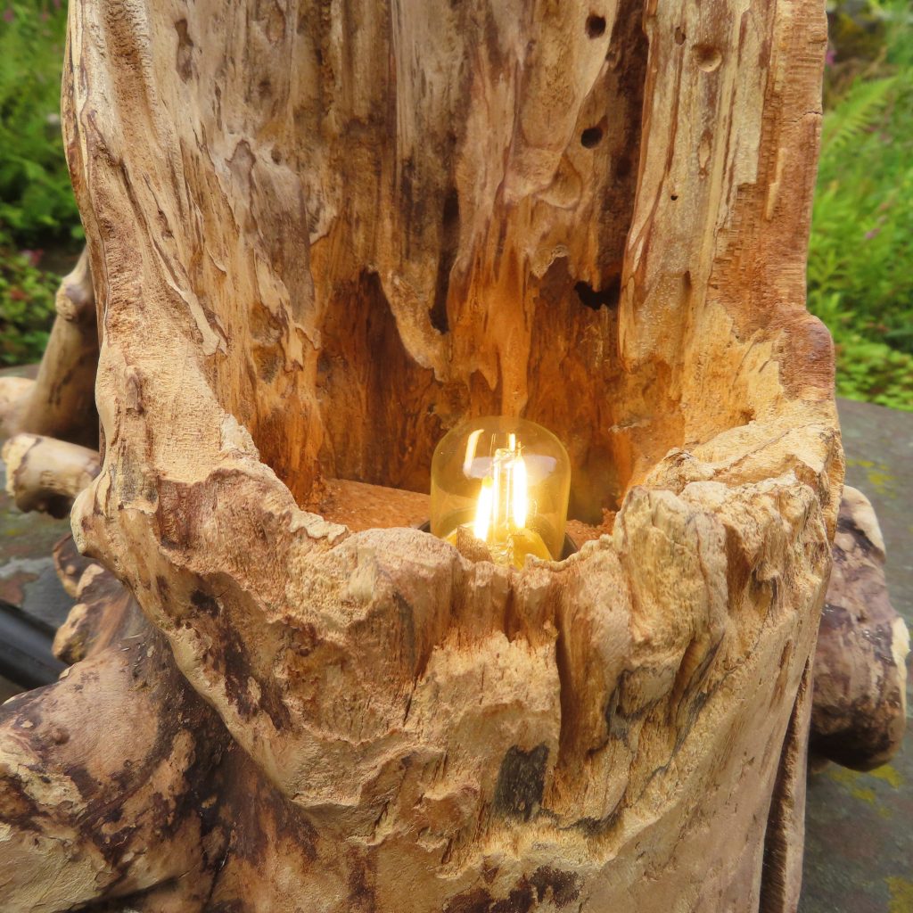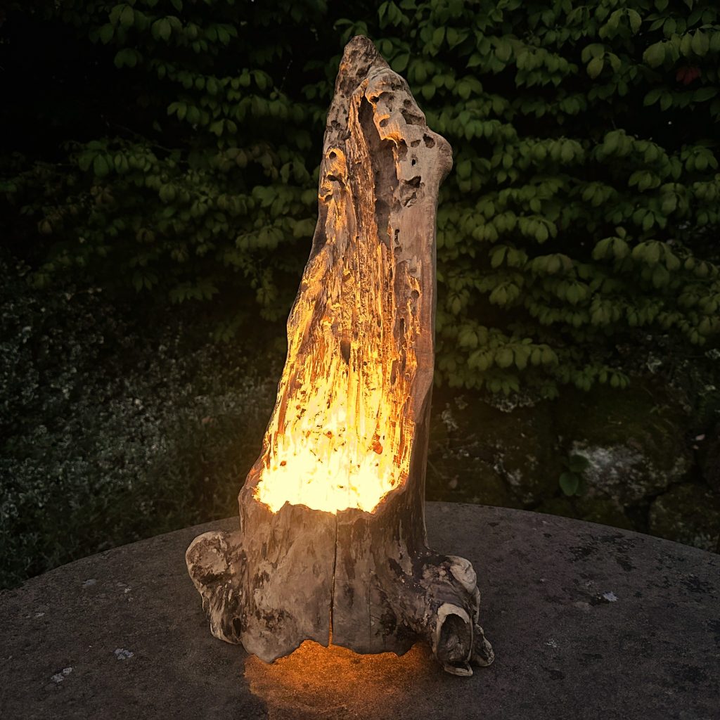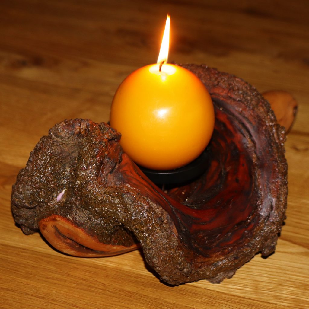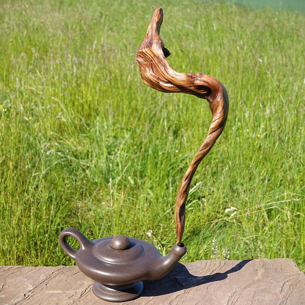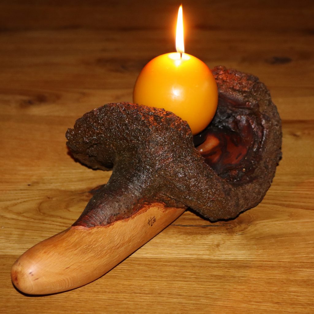 Das Holzstück habe ich in seiner Form nicht verändert, lediglich seiner Oberfläche etwas Glanz verliehen. Sodann habe ich eine Weile nach der passenden Öllampe gesucht, aus der ich den Geist entweichen lassen konnte, und fand sie in einem Westerwälder Keramikbetrieb, der Fa. AKRU in Hillscheid.
