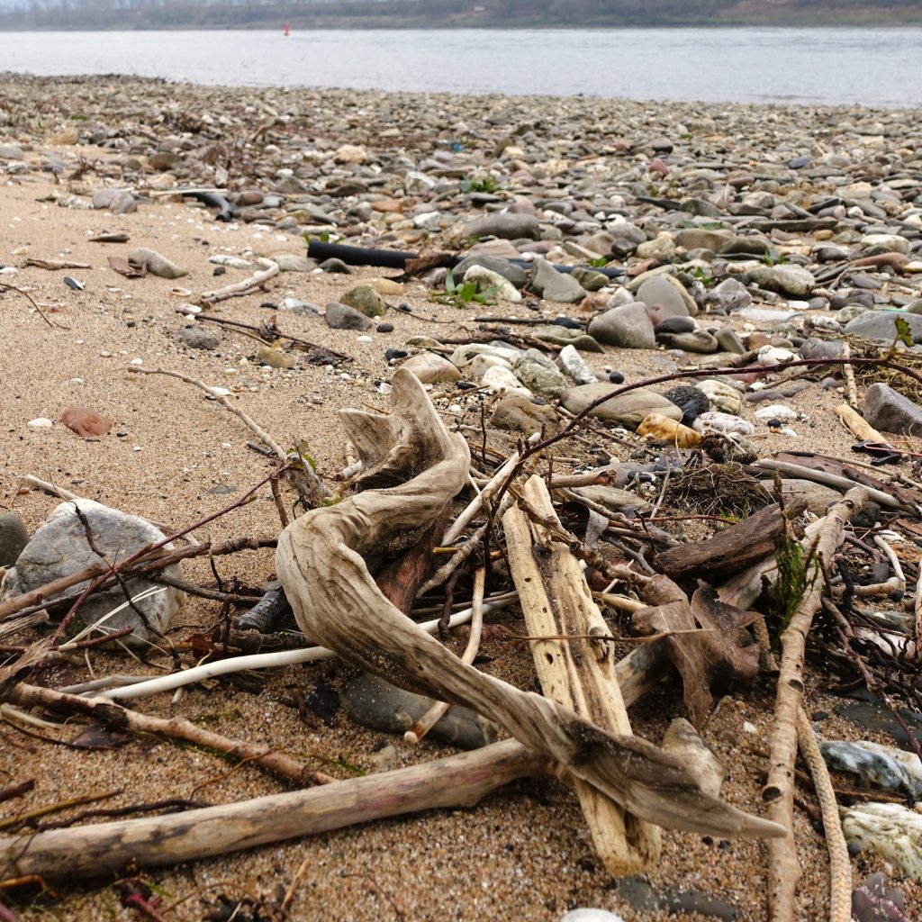 Das federleichte und von der Schiffsbohrmuschel durchlöcherte Holzstück erinnert mich in seiner langgestreckten Form ein wenig an eine Bronzeskulptur von Alberto Giacometti. Ich fand es auf der Weininsel „Heyles’en Werth“ vor Bacharach, auf die man im trockenen Sommer 2019 zu Fuß gelangen konnte.