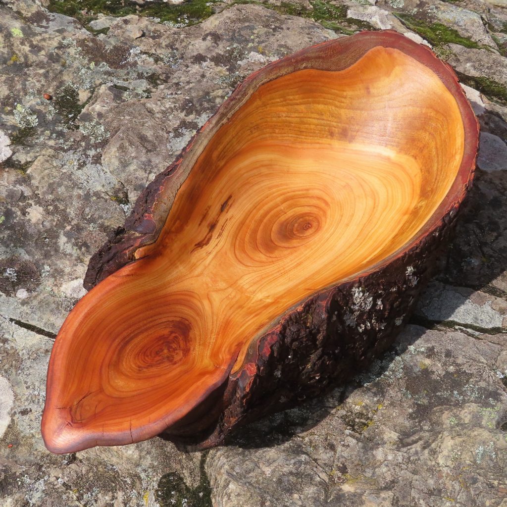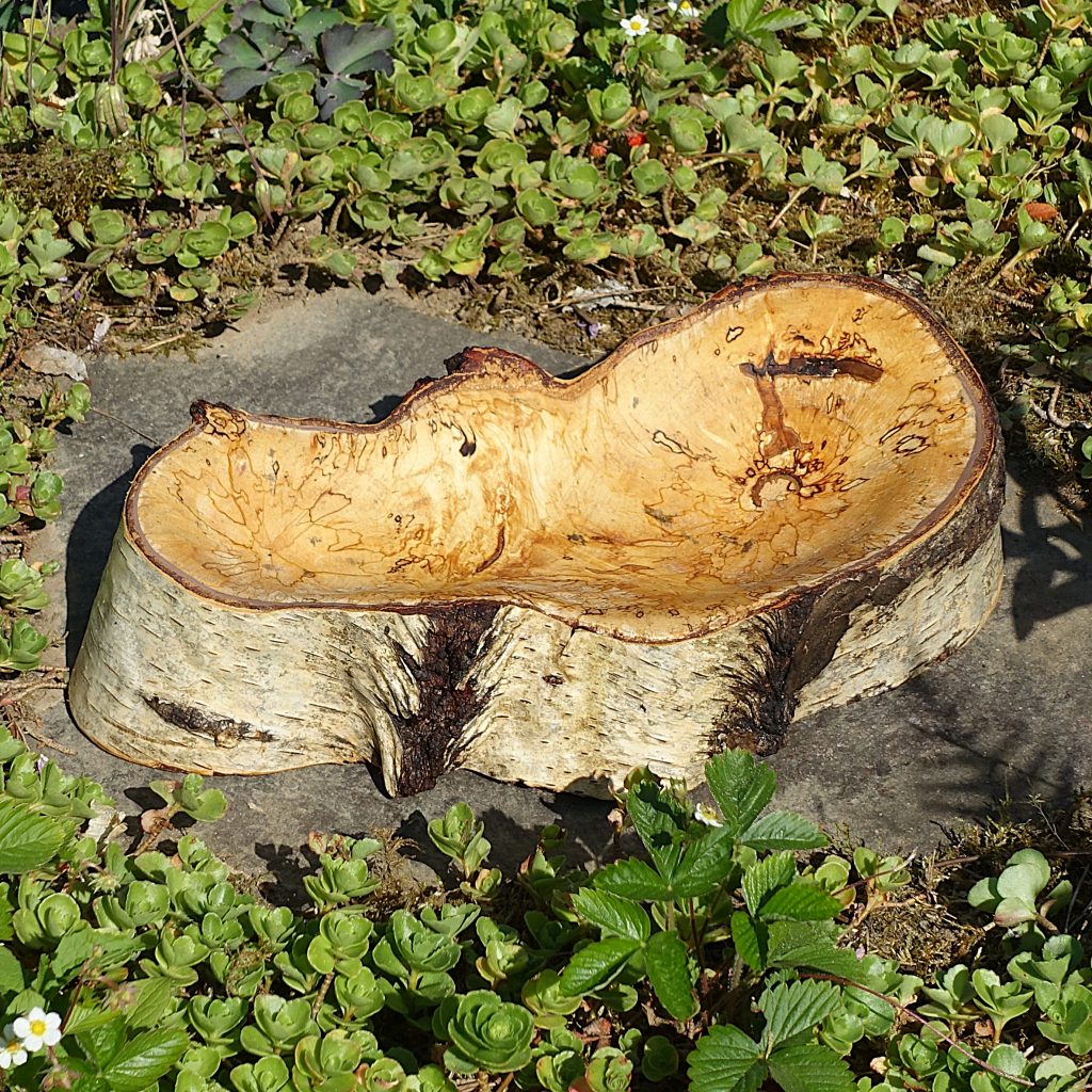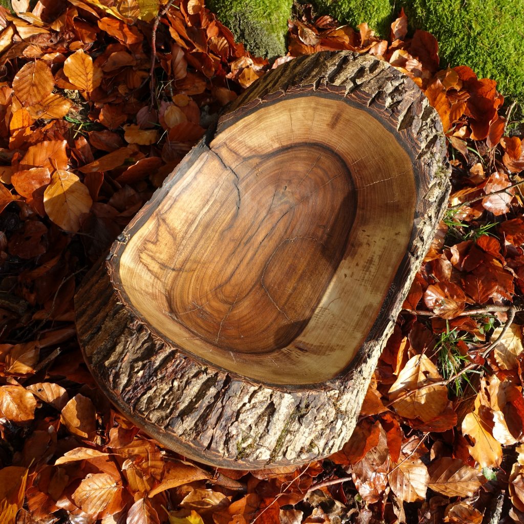 Den Stamm habe ich an einer Längsseite abgeflacht und von der anderen, der runden Seite her ausgehöhlt, also eigentlich verkehrt herum, daher die unkonventionelle Form der Schale. Die Rinde konnte ich zum Glück erhalten; sie sitzt sehr fest. Auch hat das Holz während der Trocknung über den von der Natur vorgesehenen Spalt hinaus kaum Risse bekommen.