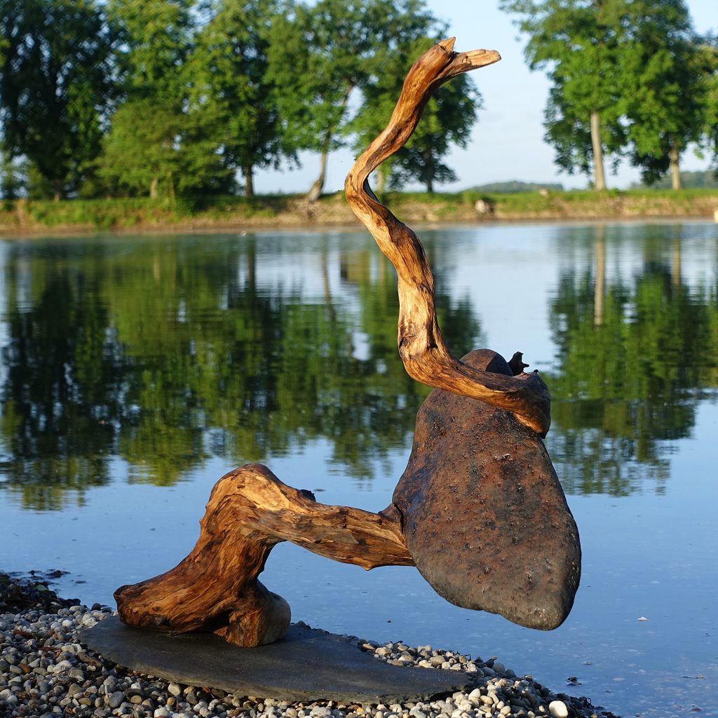 Naturskulptur „Untrennbar verbunden“, Treibholzwurzel und Flussstein. Höhe 42 cm.