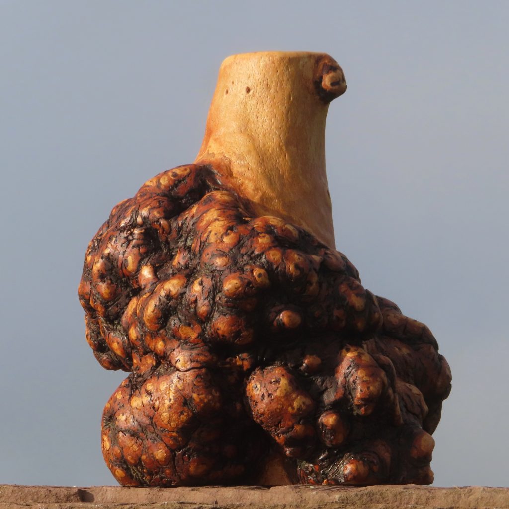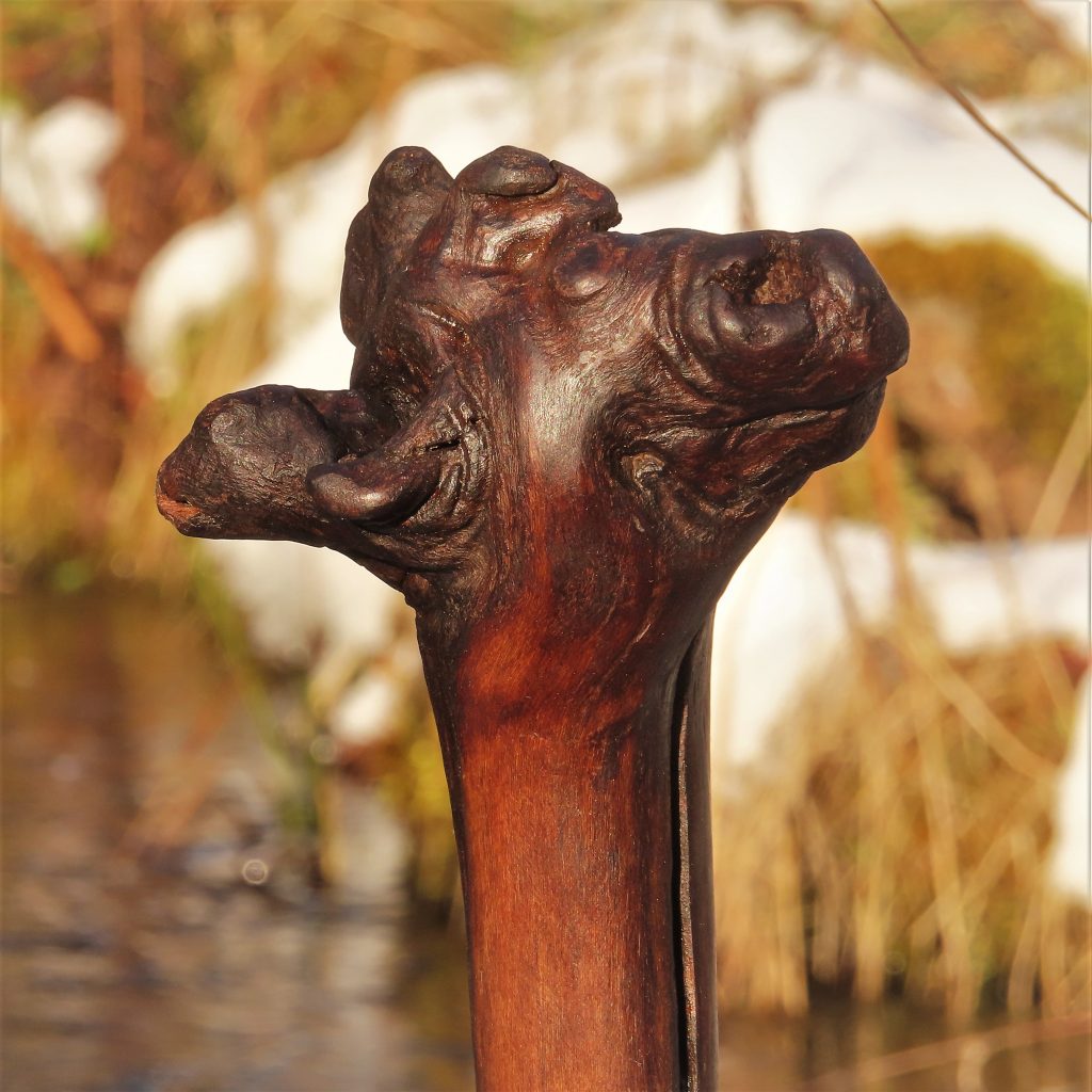 Die 12 cm lange Baumperle ohne Rinde, die ich bei Montabaur vom Stammfuß einer Eiche abpflücken konnte, habe ich nach dem Trocknen poliert, geölt und ausbalanciert, d.h. den Stiel so abgeflacht, dass die Perle sicher steht.