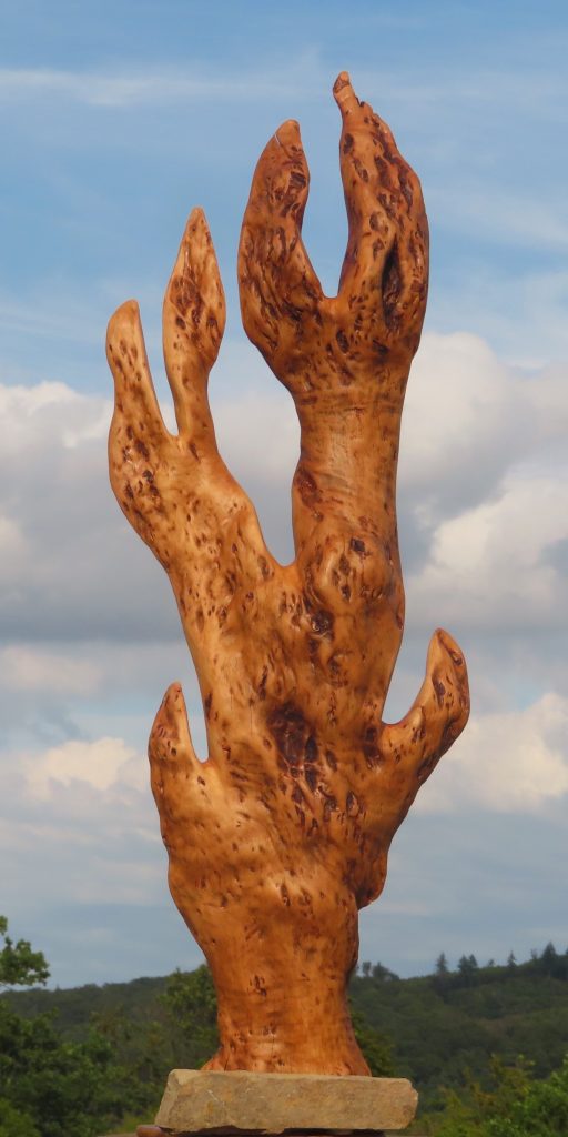 Zu Nr. 20: Am Ortsrand von Gackenbach, an der Zufahrt zum Wild- und Freizeitpark, gibt es ein kleines Essigbaumwäldchen, welches sich über Wurzelausläufer immer weiter ausbreitet. Als der „Stammvater“ eines Tages aufgrund von Altersschwäche umgestürzt war, durfte ich ihn entsorgen und bearbeiten.