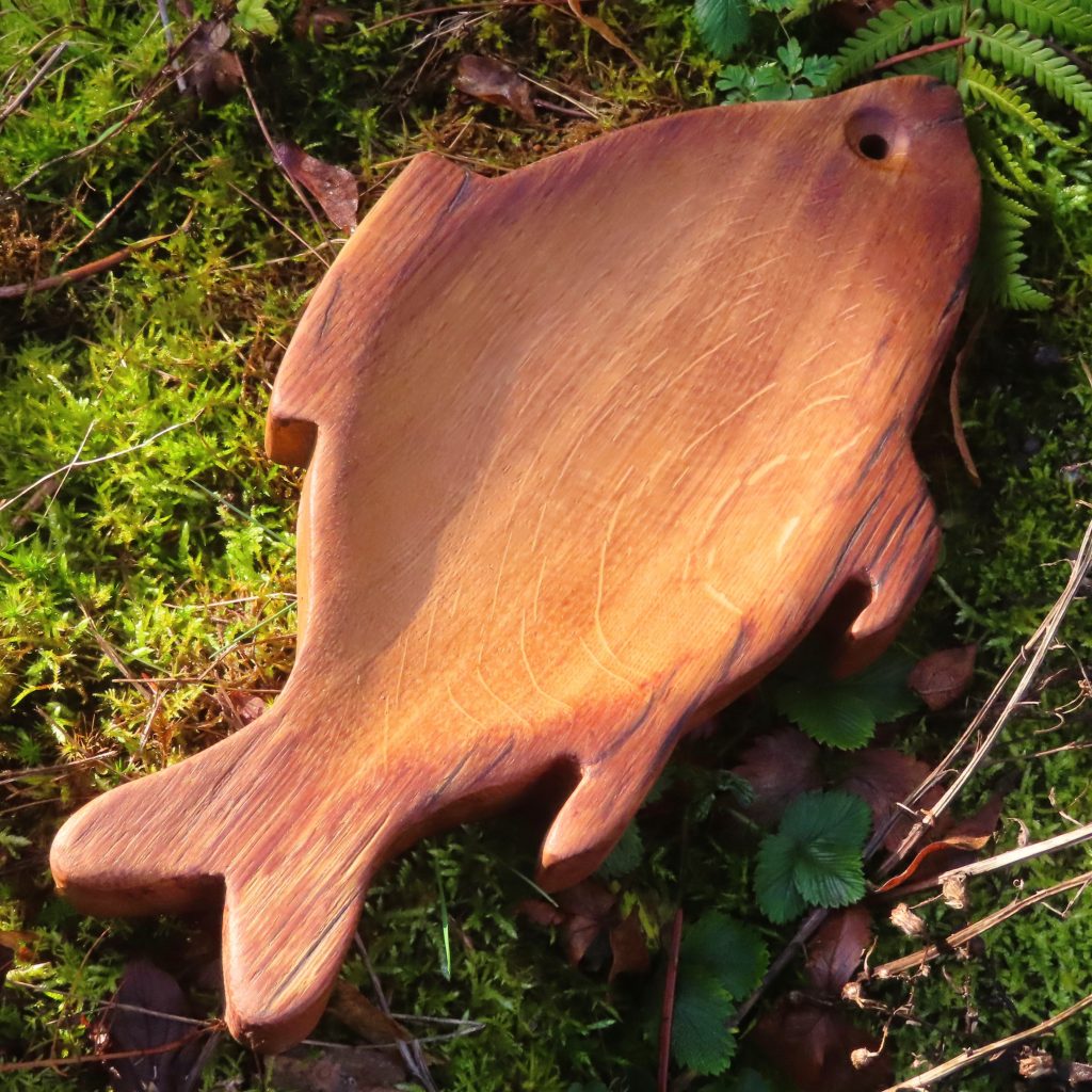 Die flache Schale mit der eigenwilligen Fischform habe ich aus dem Baumkrebsknoten (Maserknolle) einer Rotbuche gefertigt. Die Schale ist 30 cm lang und 2,5 cm hoch, das vierte Foto zeigt die Unterseite.