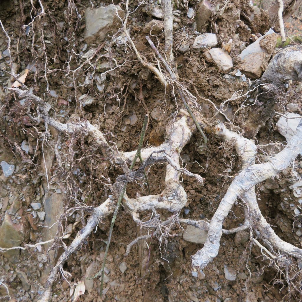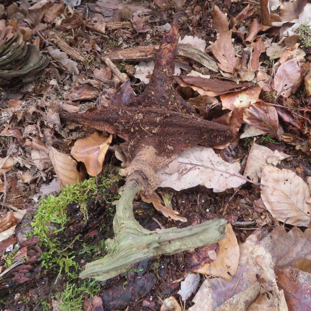 Auf dem dritten Foto sieht man am unteren Bildrand das Wurzelstück in seiner ursprünglichen Position und oben links den zugehörigen Baumstumpf. Selbstverständlich schneide ich keine Wurzeln von lebenden Bäumen ab.