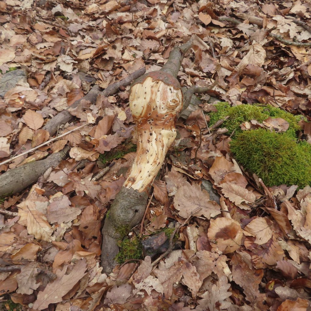 Das Ausgangsmaterial für meinen Scheffel, ein abgebrochener dürrer Ast, lag an einem Waldweg bei Montabaur. Wie man auf dem vierten Foto sieht, hat die Natur hier bereits gut vorgearbeitet.