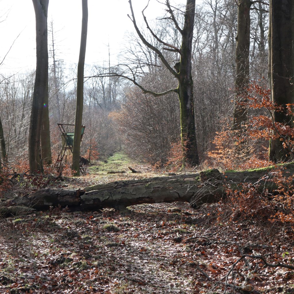 Die Scheibe stammt von dieser schwachen Rotbuche in der Bildmitte, die stark von Baumkrebs befallen war. Mit Erlaubnis des Försters habe ich sie gefällt und quer bzw. schräg aufgeschnitten. Da die dunklen Anteile des Holzes sehr hart sind, hat ein befreundeter Schreiner das maschinelle Hobeln und Schleifen der Scheiben übernommen.